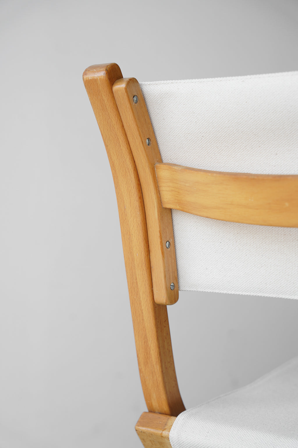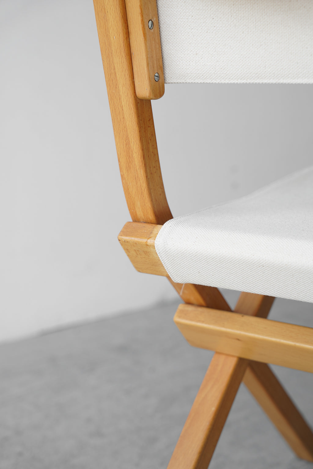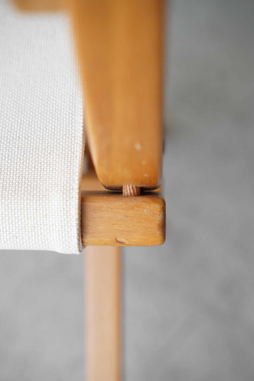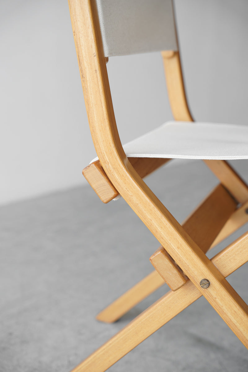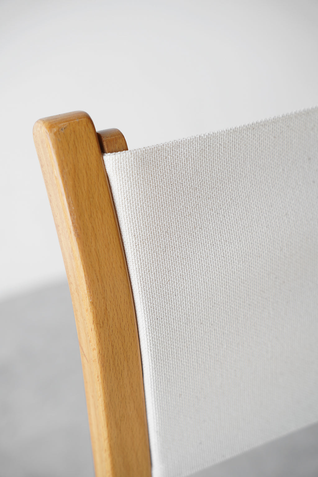 この椅子の最大の魅力は、その無駄を排したミニマルな構造と、限られたスペースでも活躍する実用性にあります。軽量ながらもしっかりとした木製フレームは、スムーズな折りたたみ機構を備えており、使用しない時はコンパクトに収納が可能です。座面と背もたれは、新たに張り替えられた白い生地が使用されており、清潔感とモダンな印象を与えます。