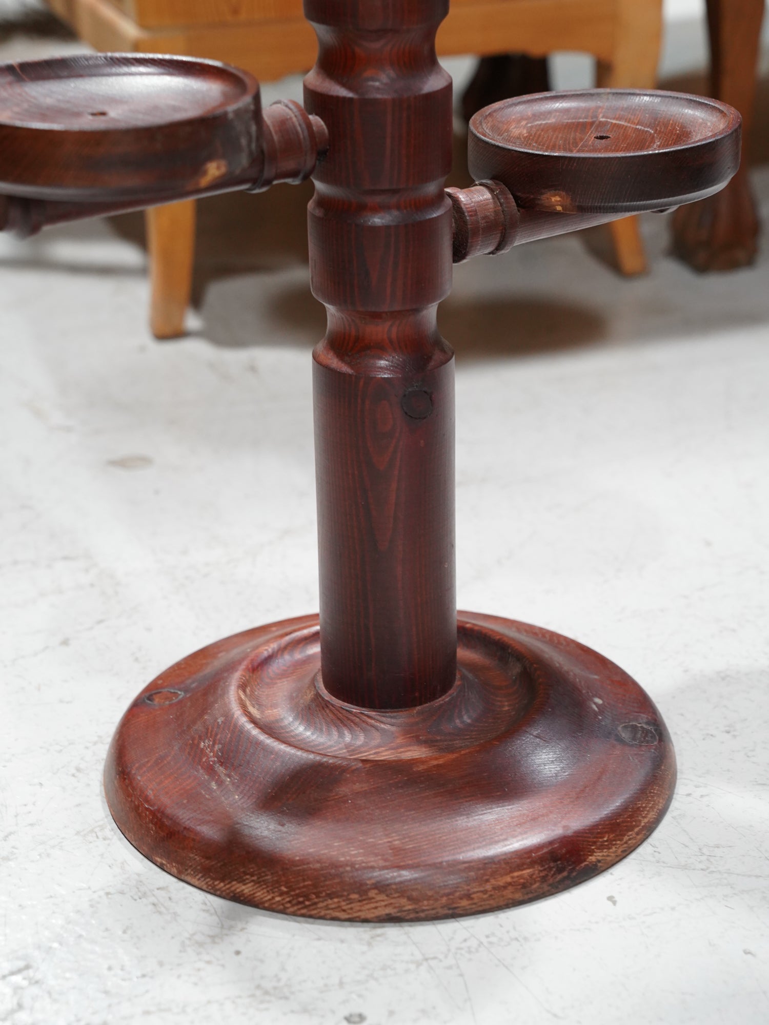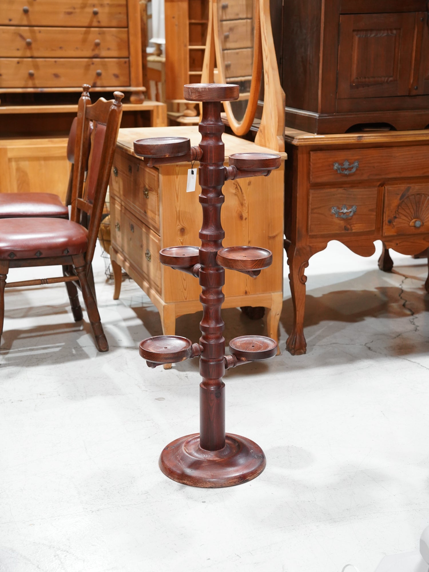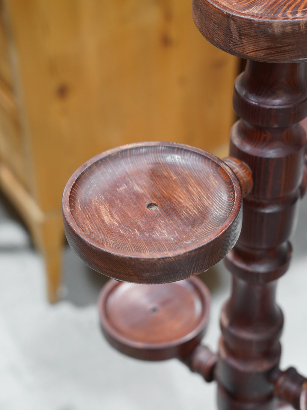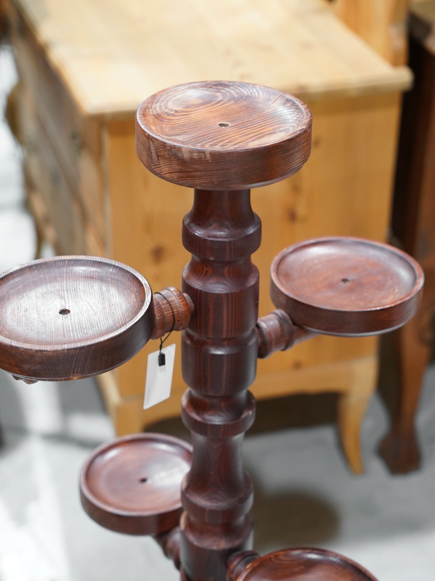 遊び心溢れる多段式のヴィンテージ・プラントスタンド.。中央の支柱に施されたリズミカルな挽物細工(旋盤加工)が目を引き、段違いに配置された円形のトレイが、植物や小物を立体的に美しく演出します。360度どこから見ても絵になる佇まいは、お部屋のコーナーや窓際のディスプレイをよりドラマチックに格上げ。深い色艶を纏った木肌はヴィンテージならではの温かみがあり、観葉植物の緑との相性も抜群です。省スペースながら最大7つのアイテムを同時に飾れる実用性の高さも魅力。日常の空間に豊かな表情と潤いを与えてくれる、クラフトマンシップが宿る希少なコレクターズアイテムです。