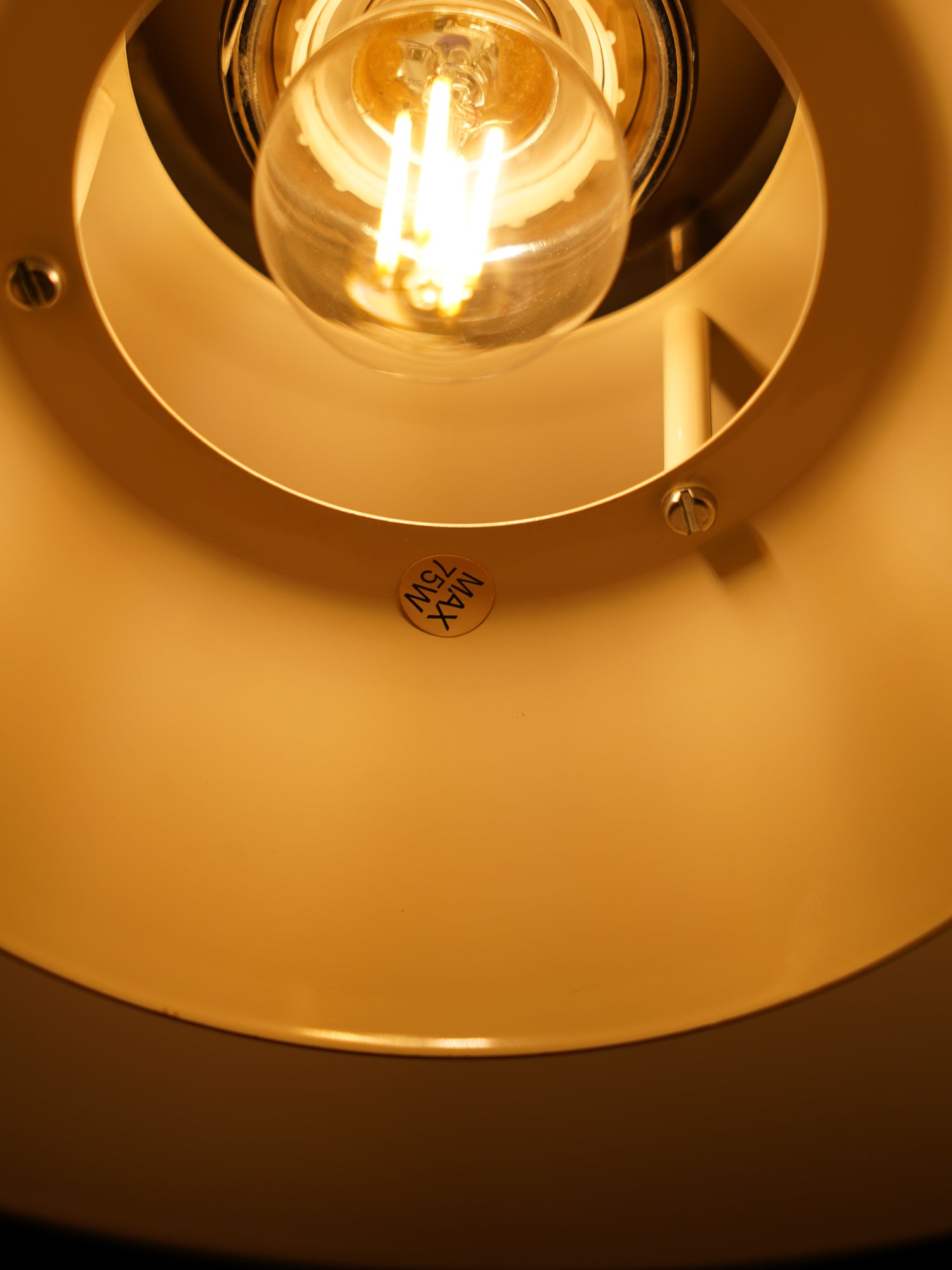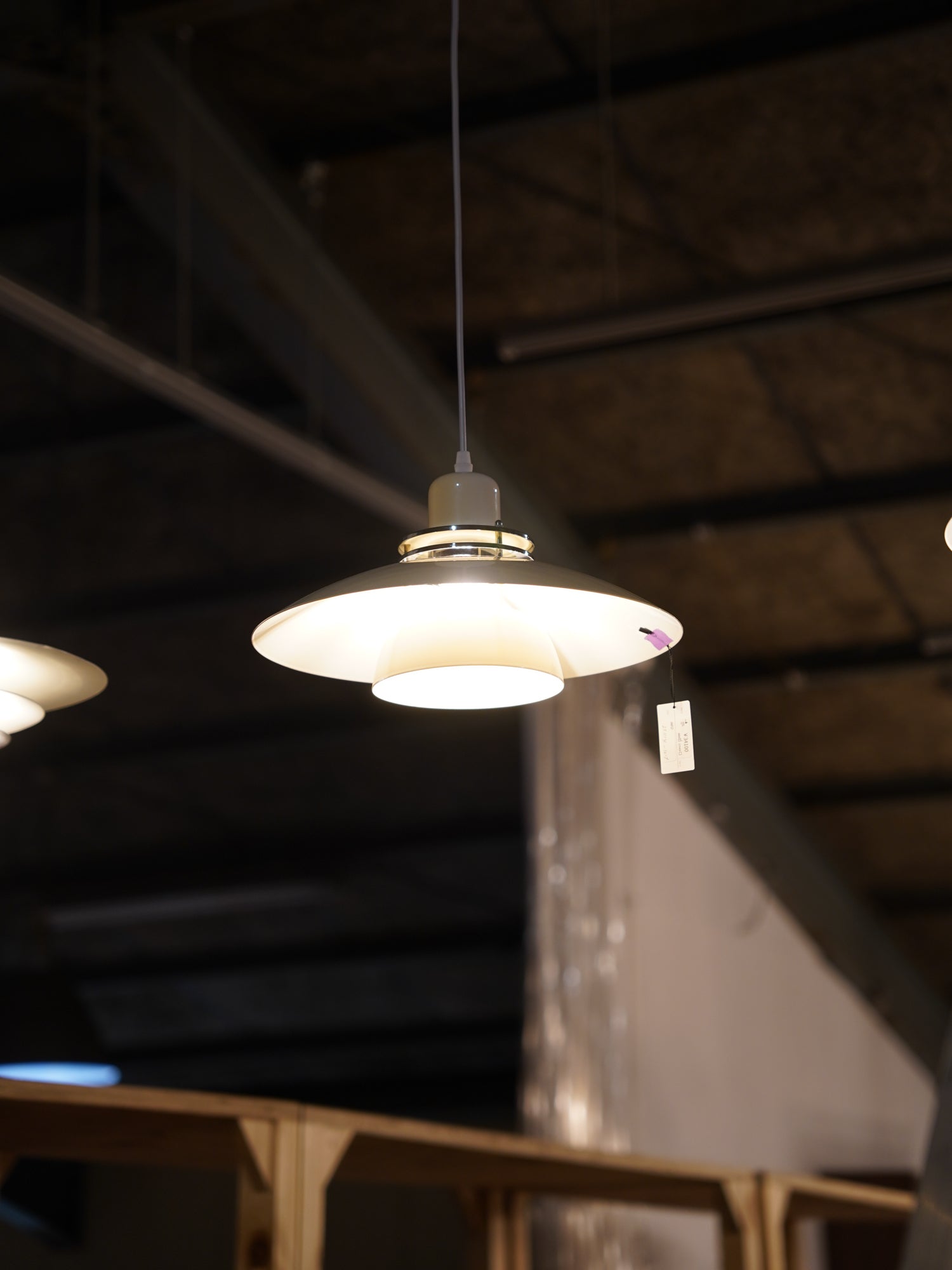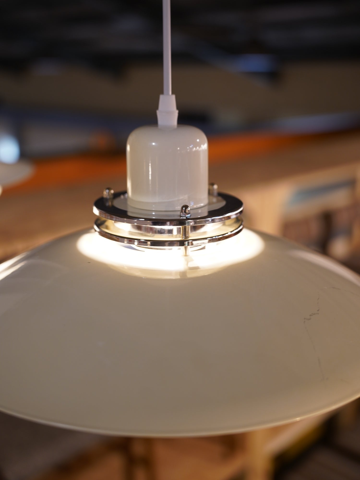 最大の魅力は、良質な素材感と光の質の調和です。シェードは、柔らかなアイボリー系のエナメル塗装が施された円盤状の二重構造。上部のソケットとシェードを繋ぐリングが、シンプルながらもモダンなアクセントとなり、デザインを引き締めています。