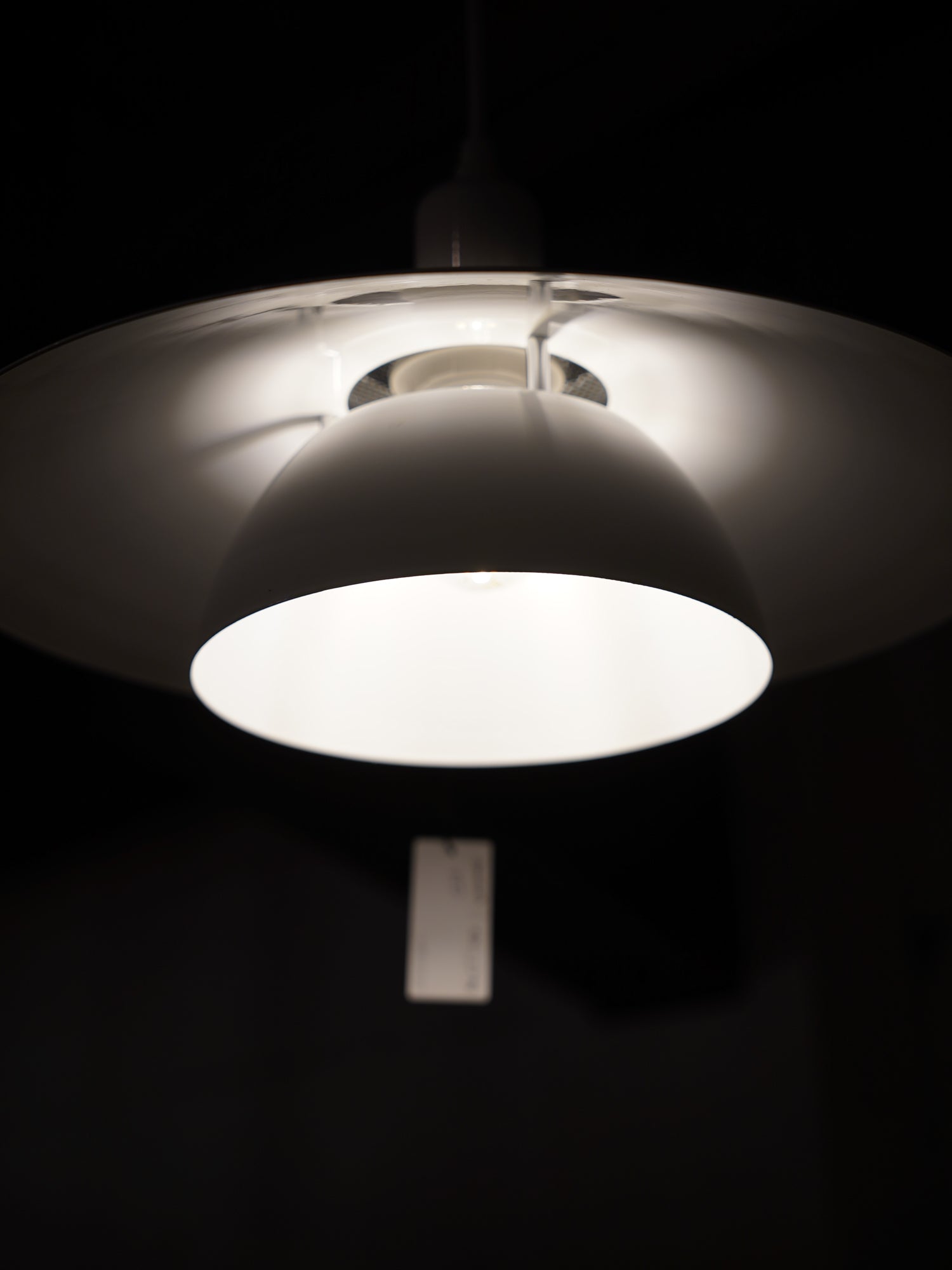 最大の魅力は、グレアフリーを実現するための精巧な構造です。複数のシェードが、光源からの光を複雑に反射・拡散させることで、優しく均一で、温かい間接光だけを空間全体に広げます。