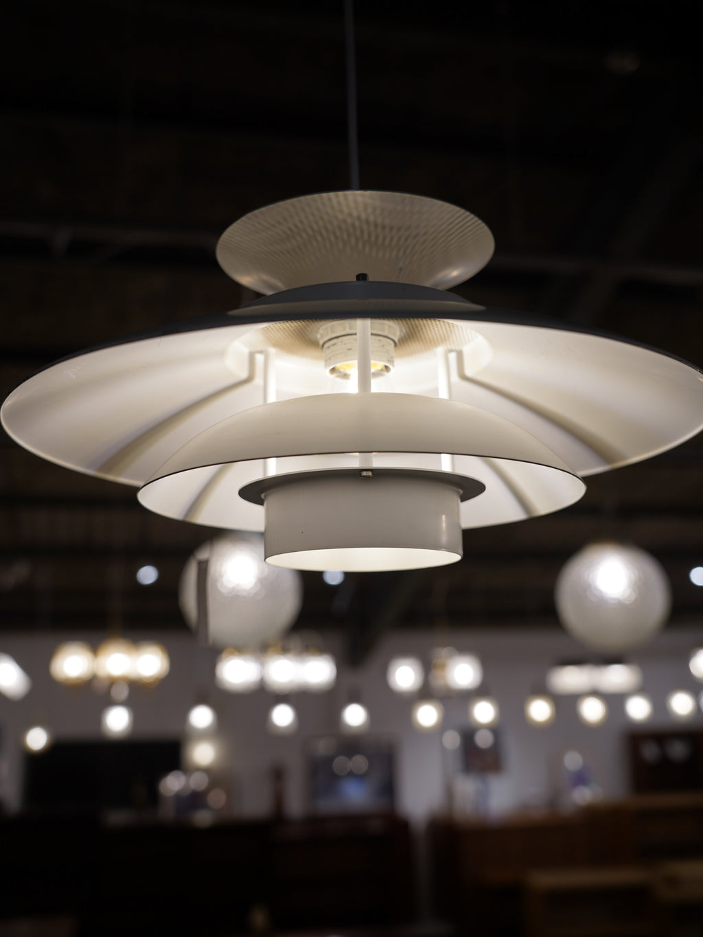 最大の魅力は、まぶしさの追放を目指して設計された複数の円盤シェードです。この複雑な構造により、光が直接目に入ることがなく、各シェードで反射・拡散され、優しく均一で、温かい間接光だけが空間に広がります。