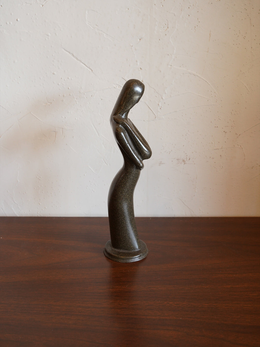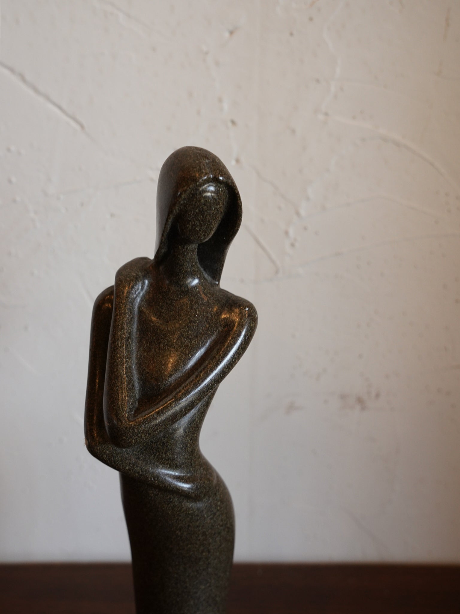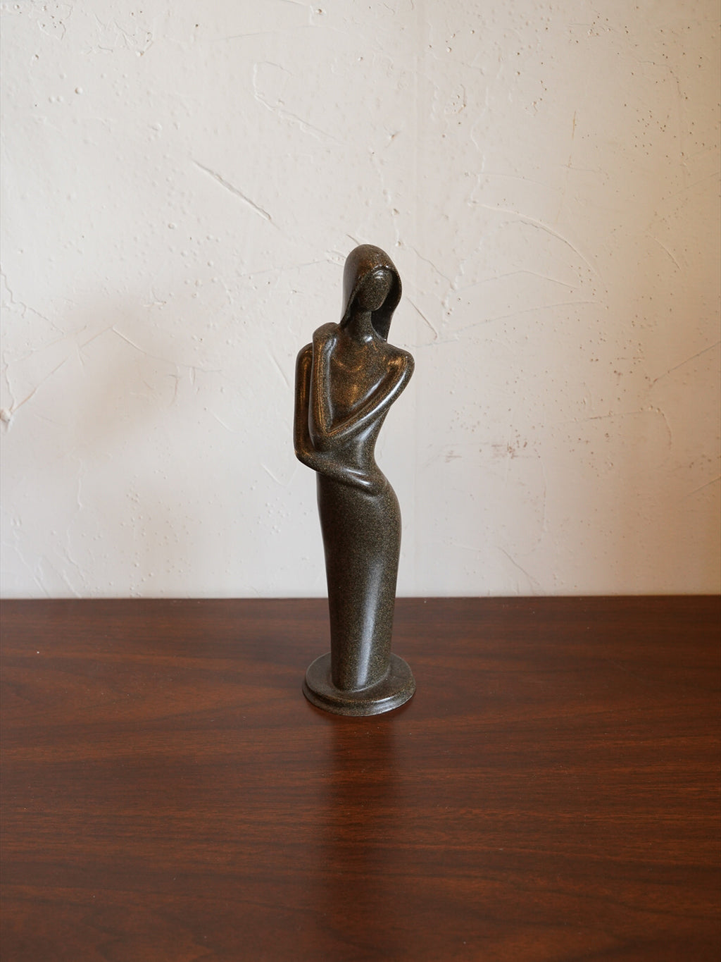 細身で優雅な曲線を描く姿は、静かに立ち、自らを抱きしめているかのような、内省的で瞑想的なポーズに見えます。頭部から足元まで流れるようなフォルムは、静寂の中にある力強い生命力を感じさせます。