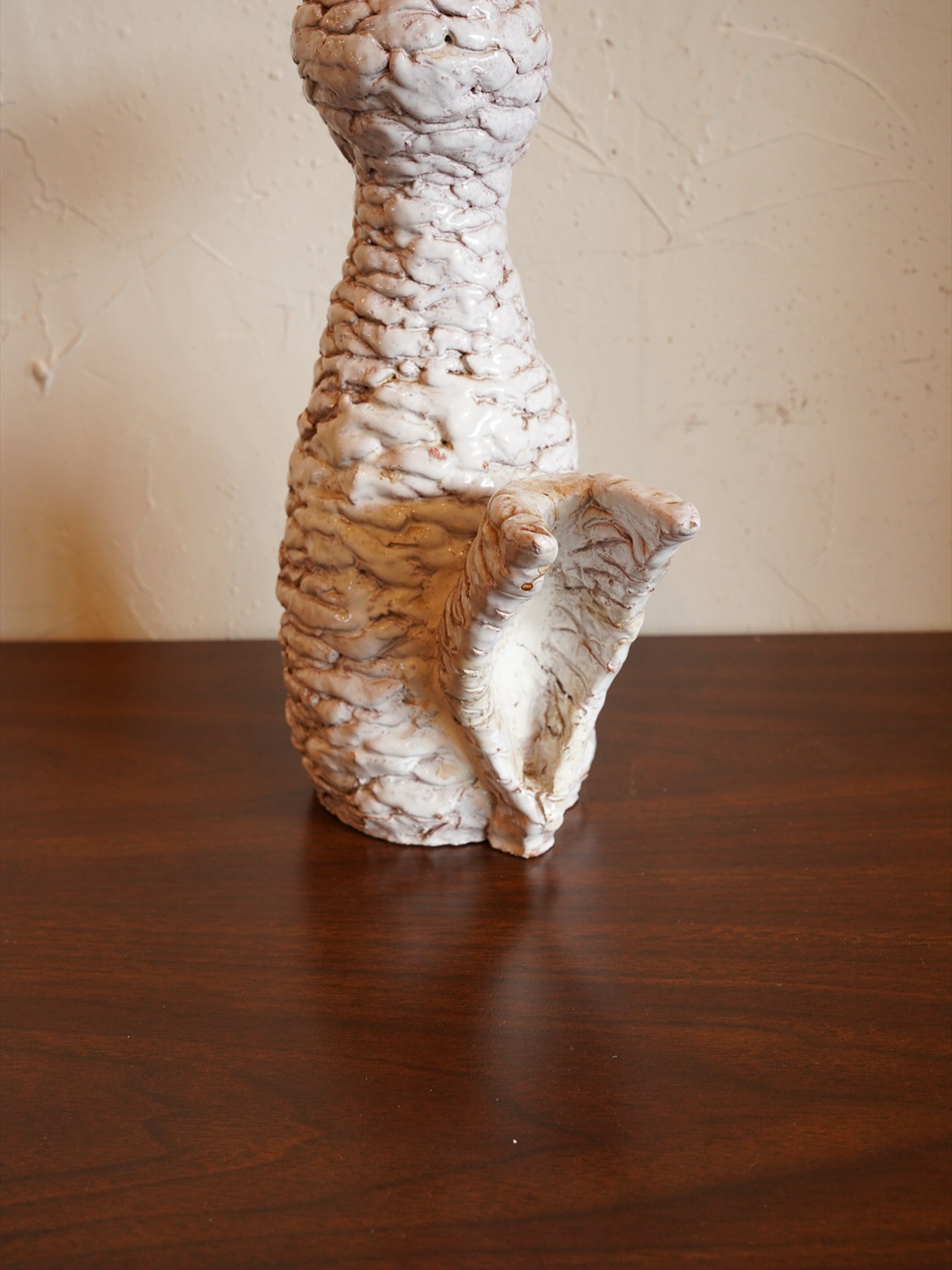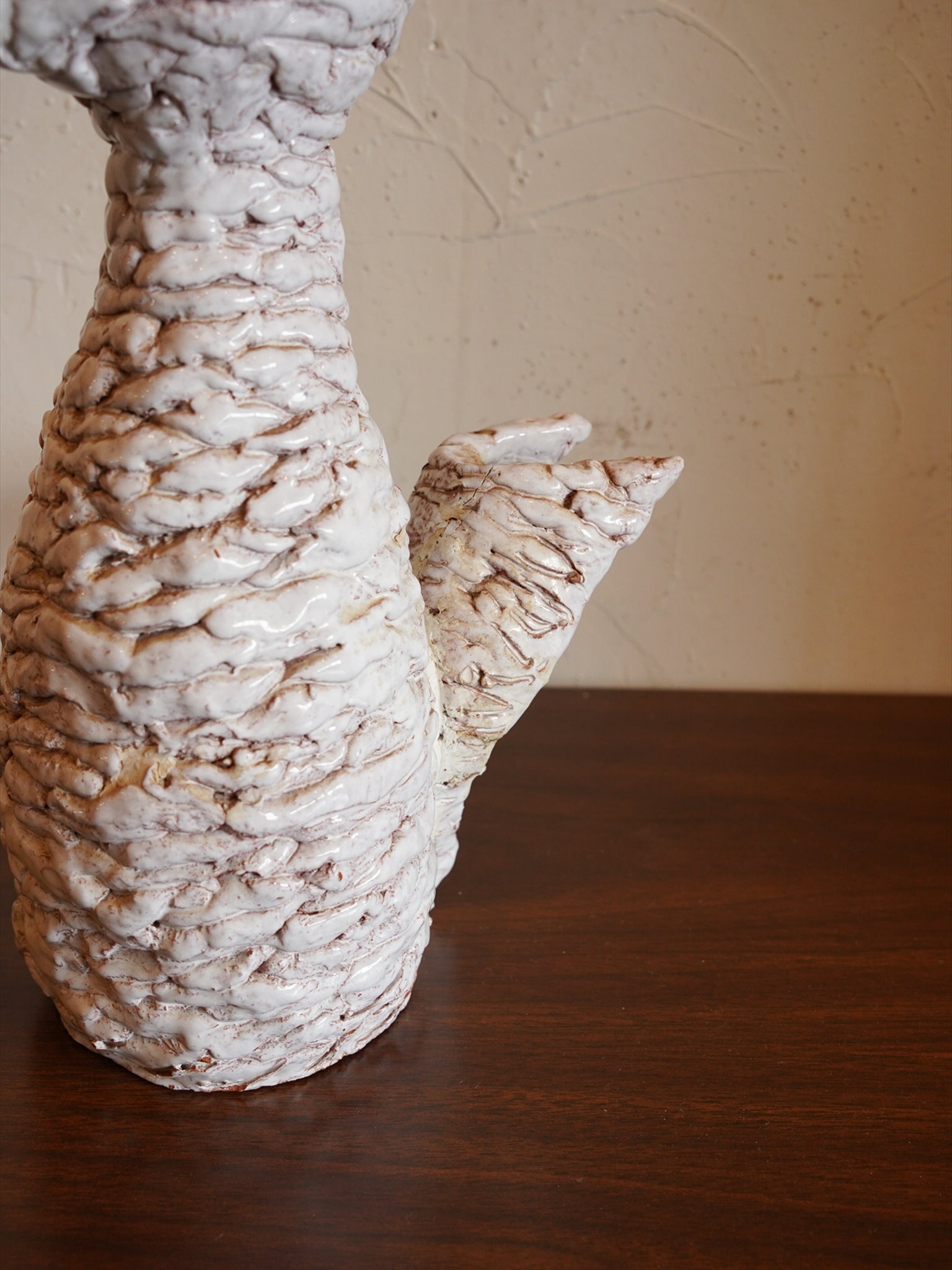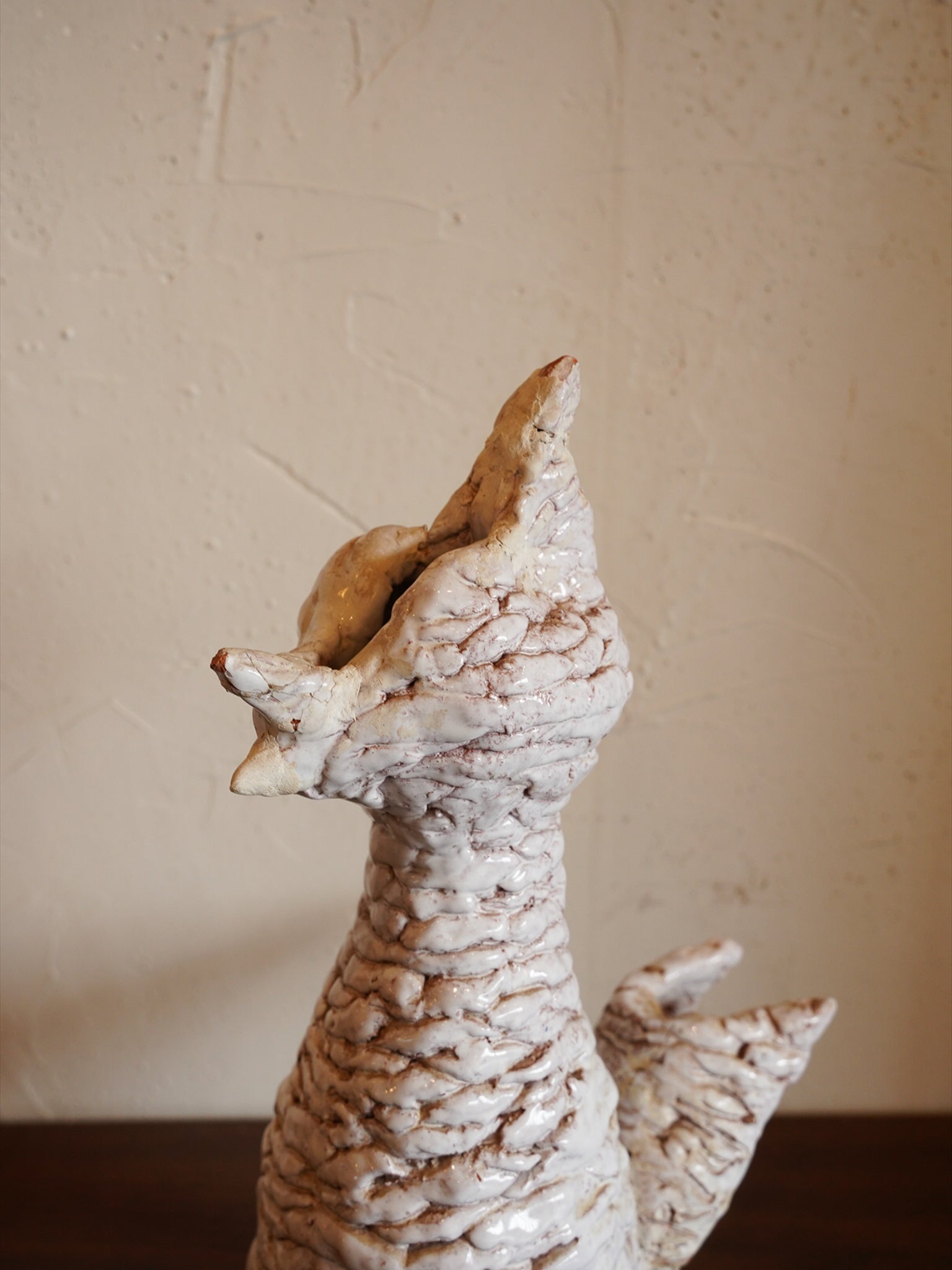 上部の鋭い突起や、胴体から横に伸びるような造形が印象的で、見る人それぞれに想像を促すアートピースです。圧倒的な存在感で空間を彩ります。