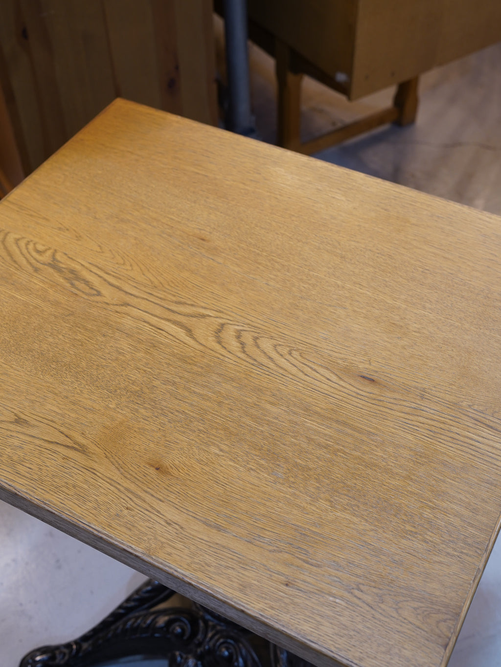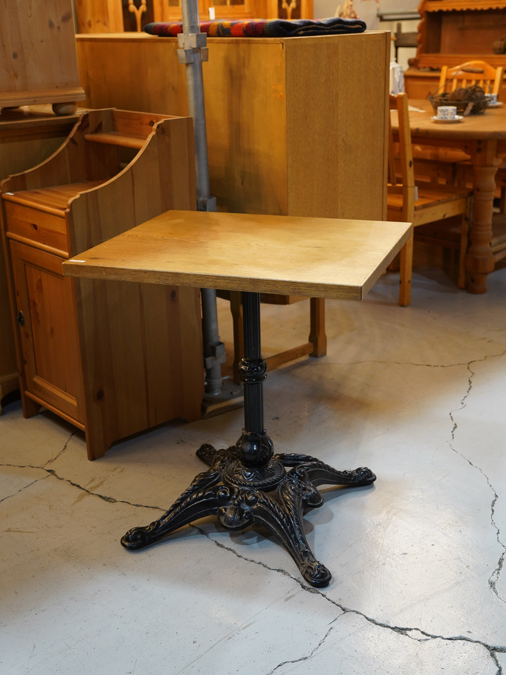明るい木目の美しい正方形の天板は、温かみがあり、どんなインテリアにも馴染みやすいデザインです。ナチュラルながらも、脚部の重厚感と相まって、洗練されたカフェスタイルを演出します。耐久性にも優れ、長くご愛用いただけます。