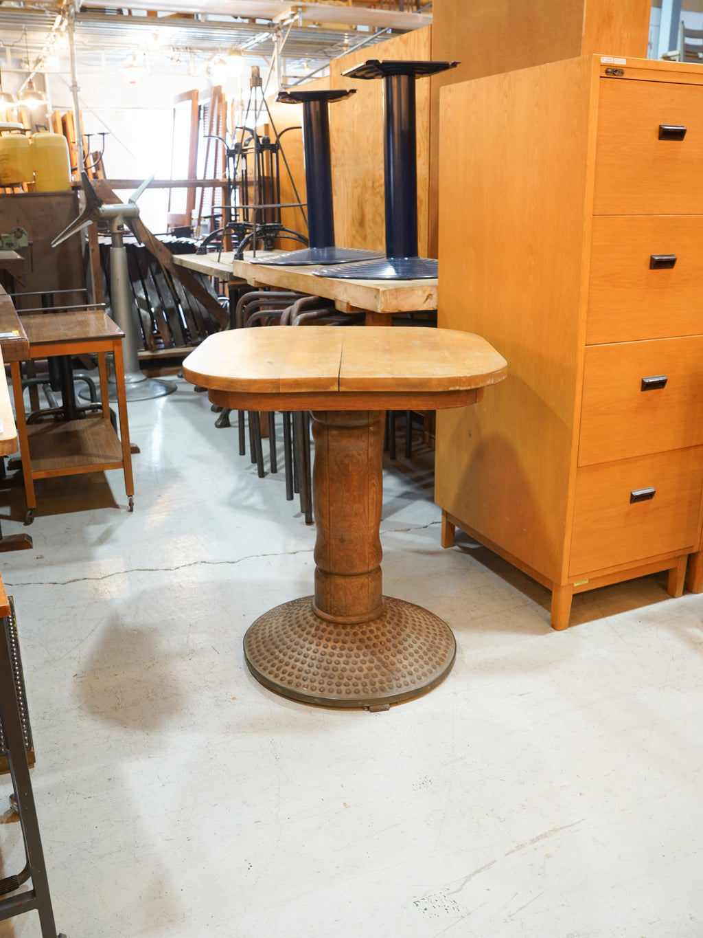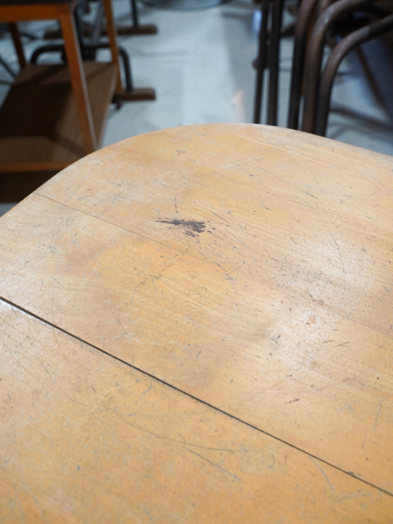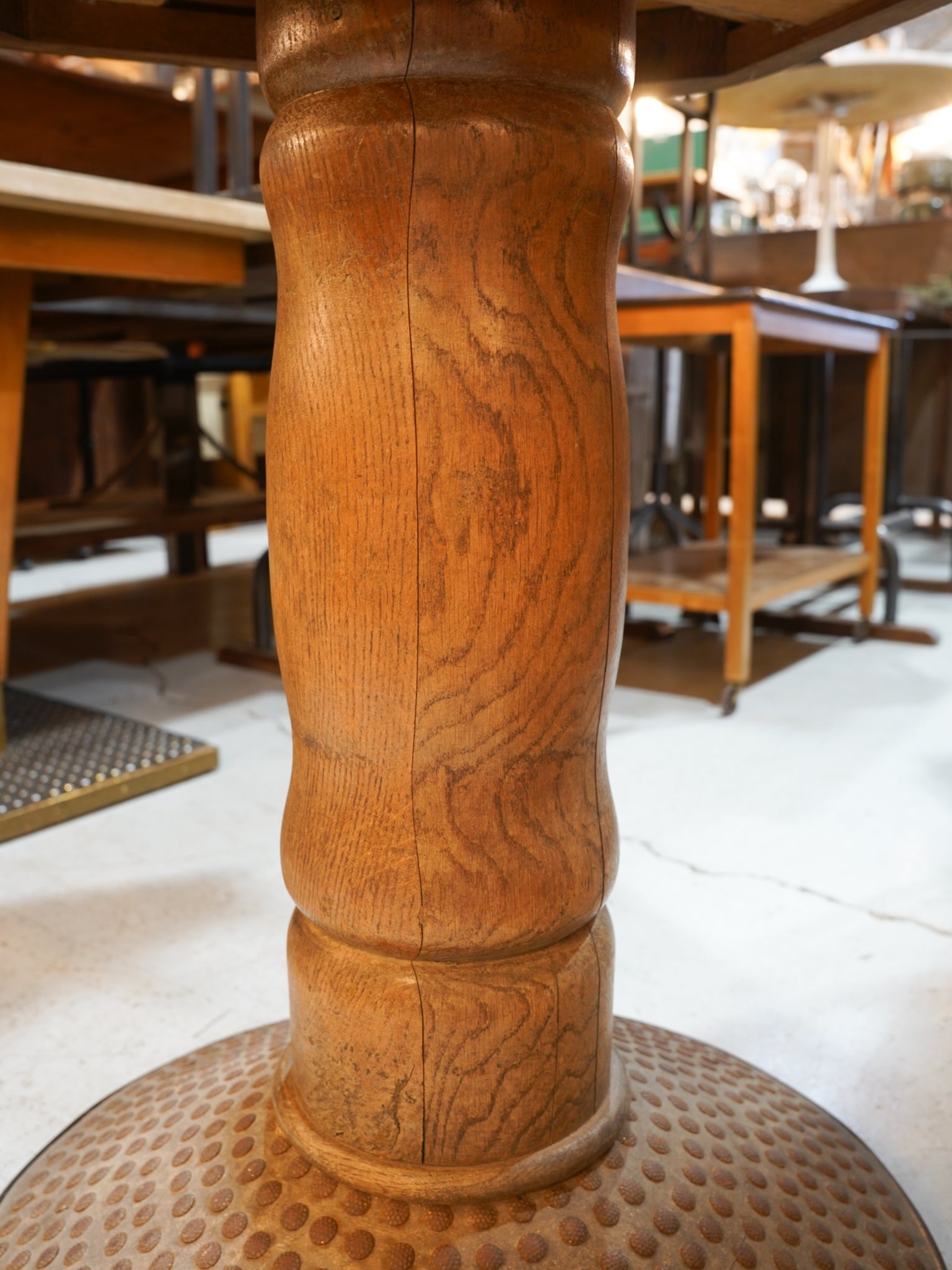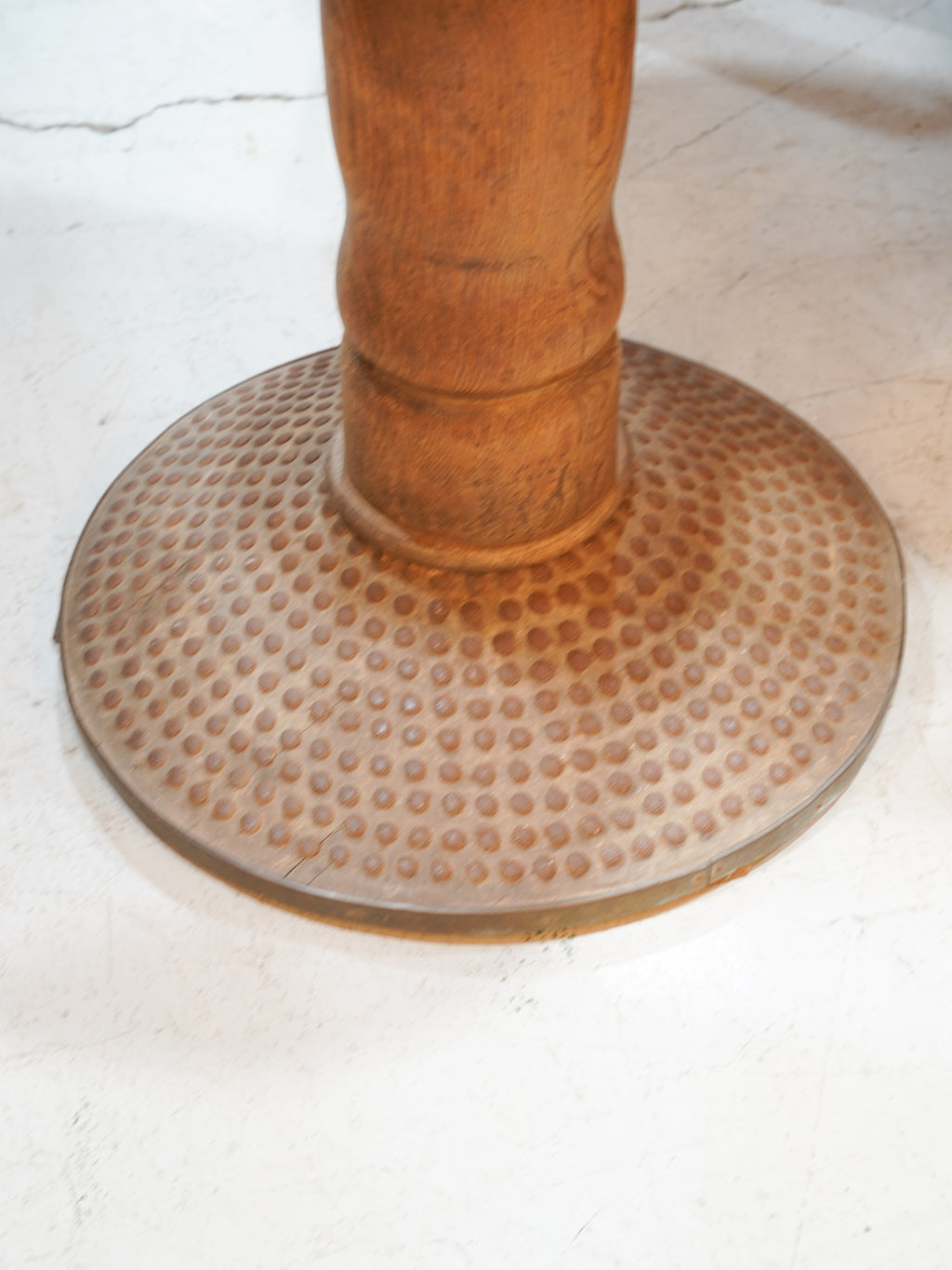 接合部から脚元に至るまで、手仕事の痕跡を感じさせるような有機的なディテールが、このテーブルの希少性を物語っています。