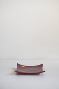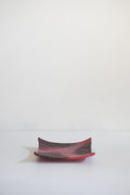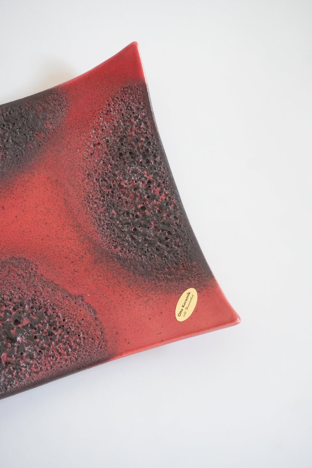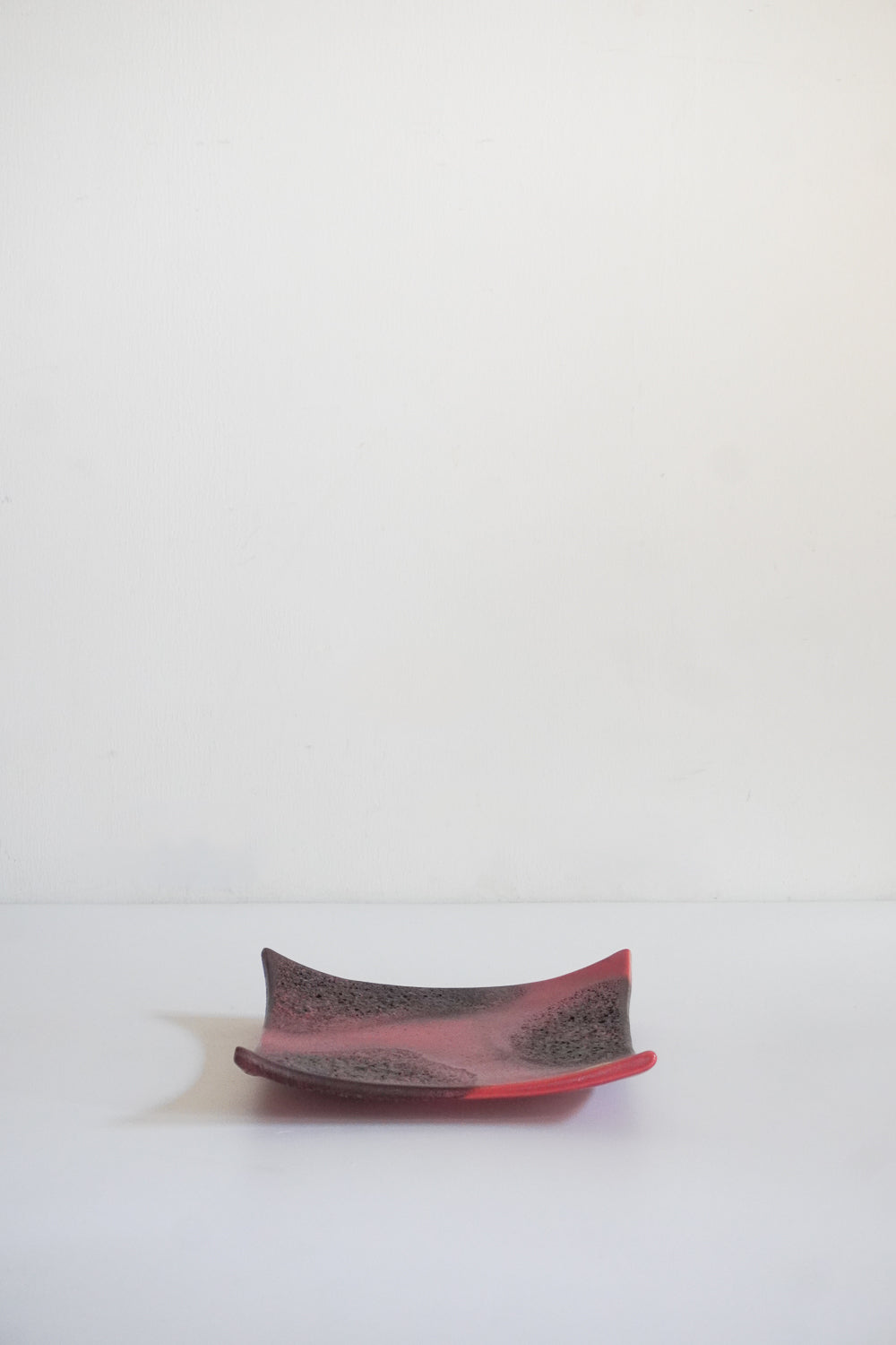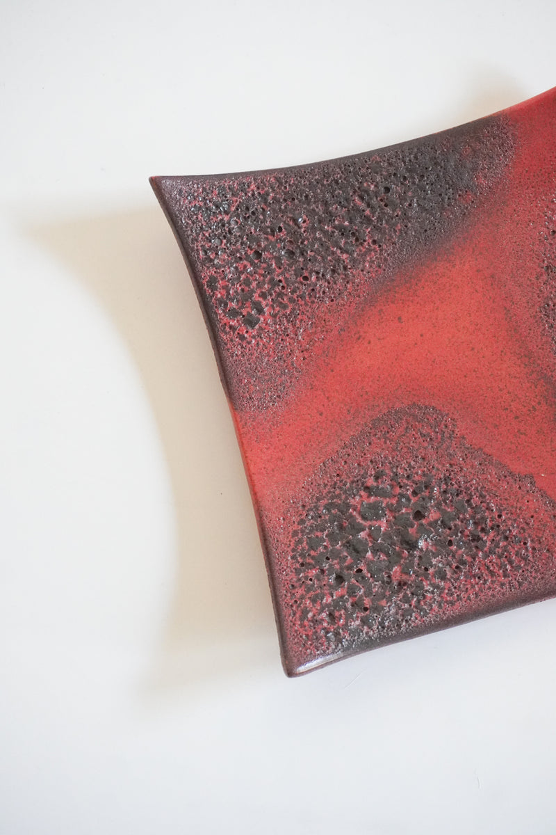鮮やかなレッドにダークグレーの泡立った釉薬模様がぴりっと効いた一点。