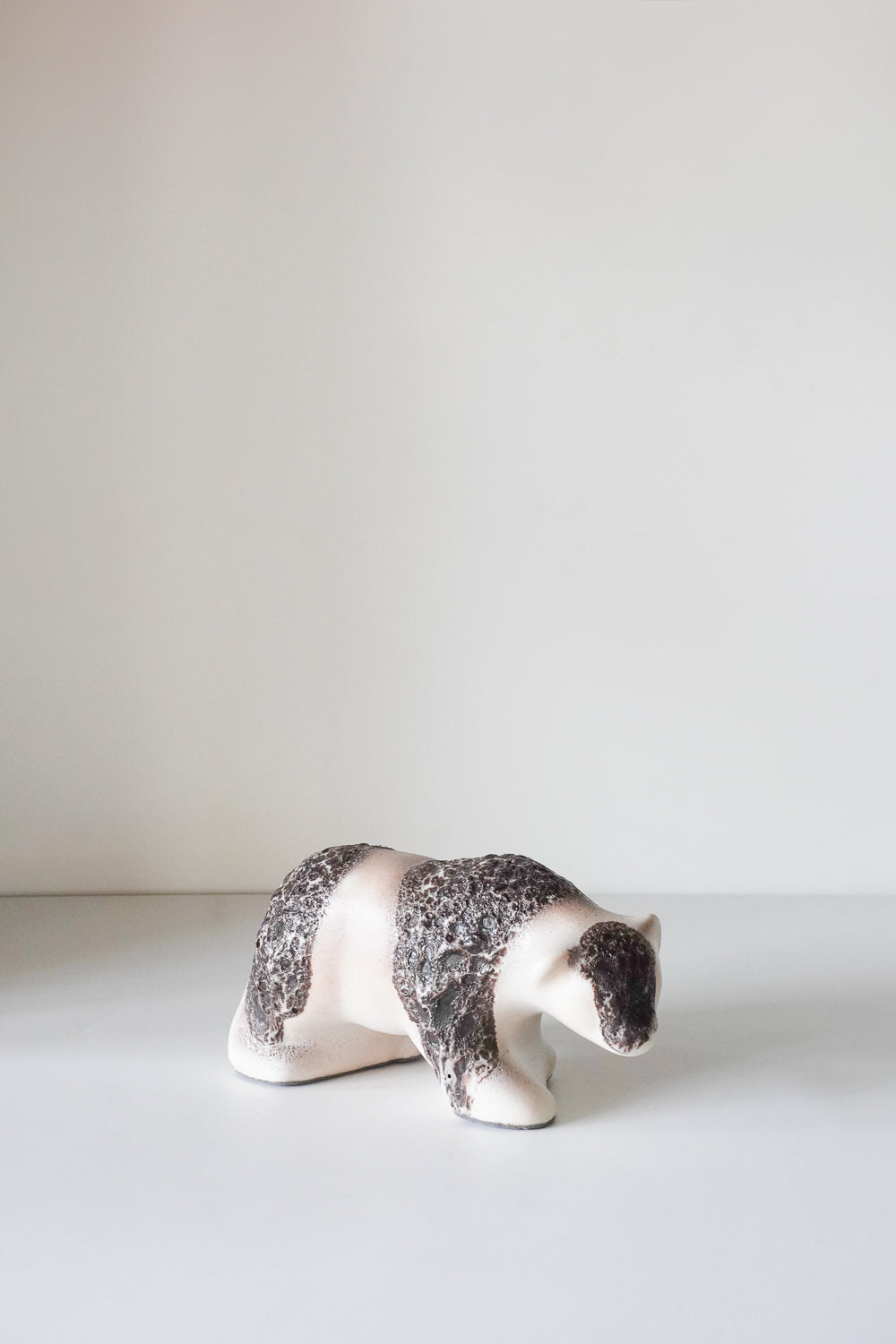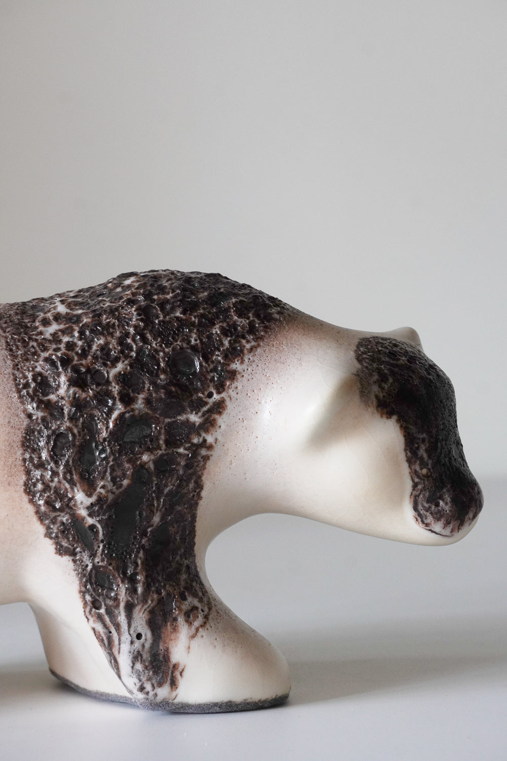 流れるような釉薬は、独特の奥行きを感じさせます。四つん這いで力強く進むクマの姿が、シンプルながらも躍動感のあるデザインです。