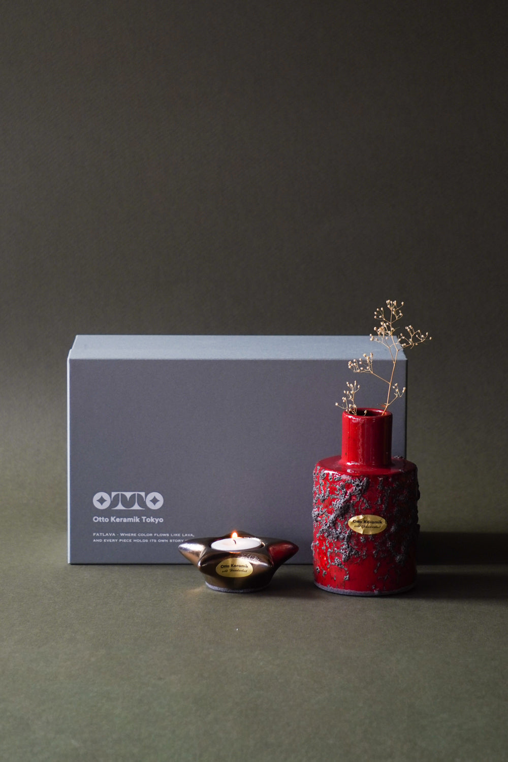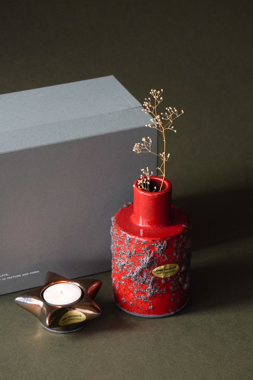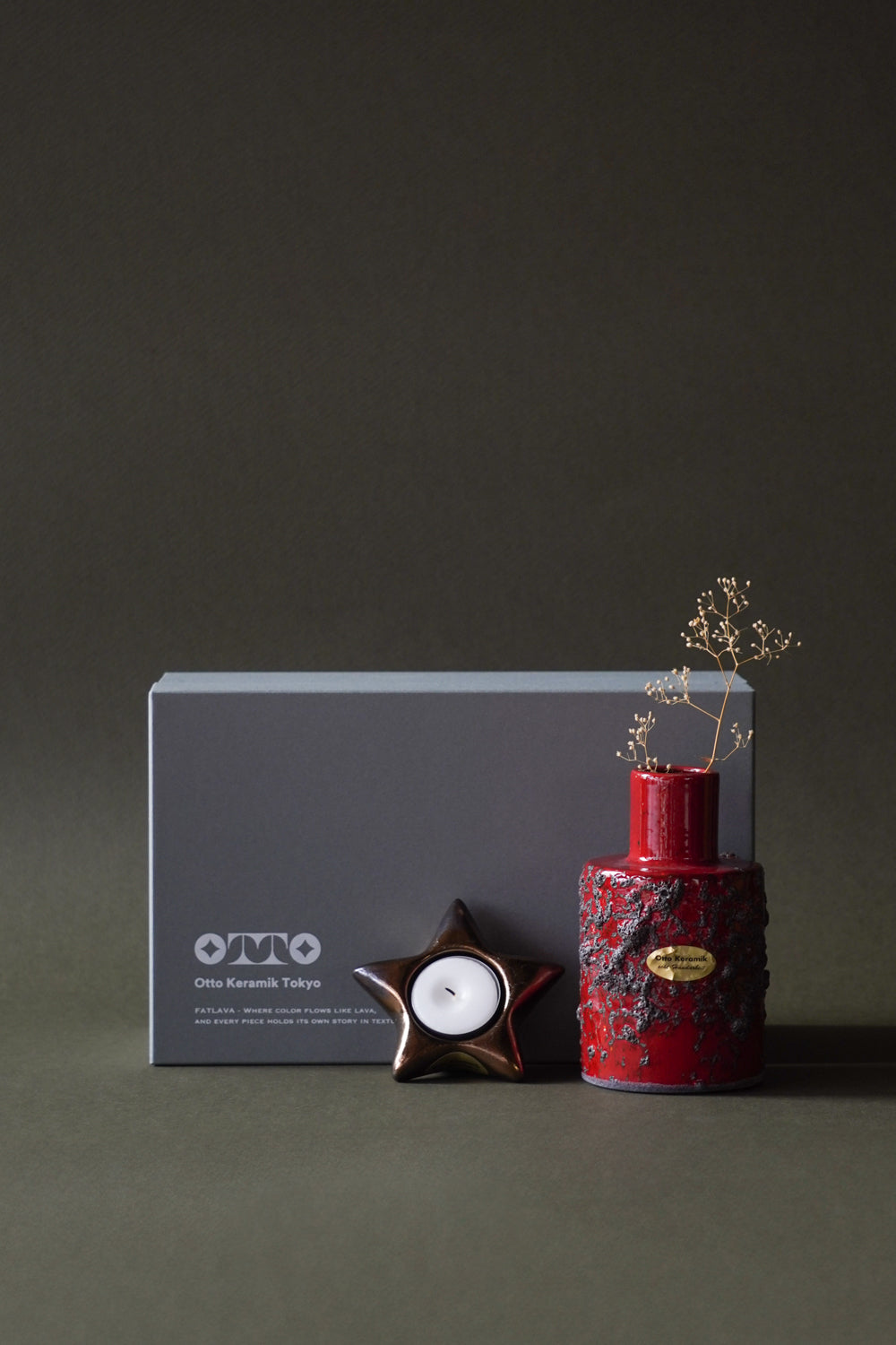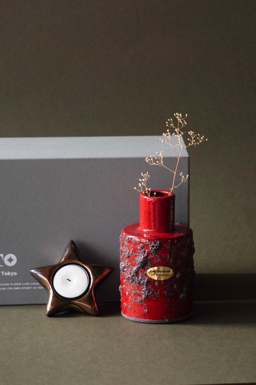 鮮やかな赤の花器に、ゴールドの星形ホルダーが眩しく瞬く組み合わせ。