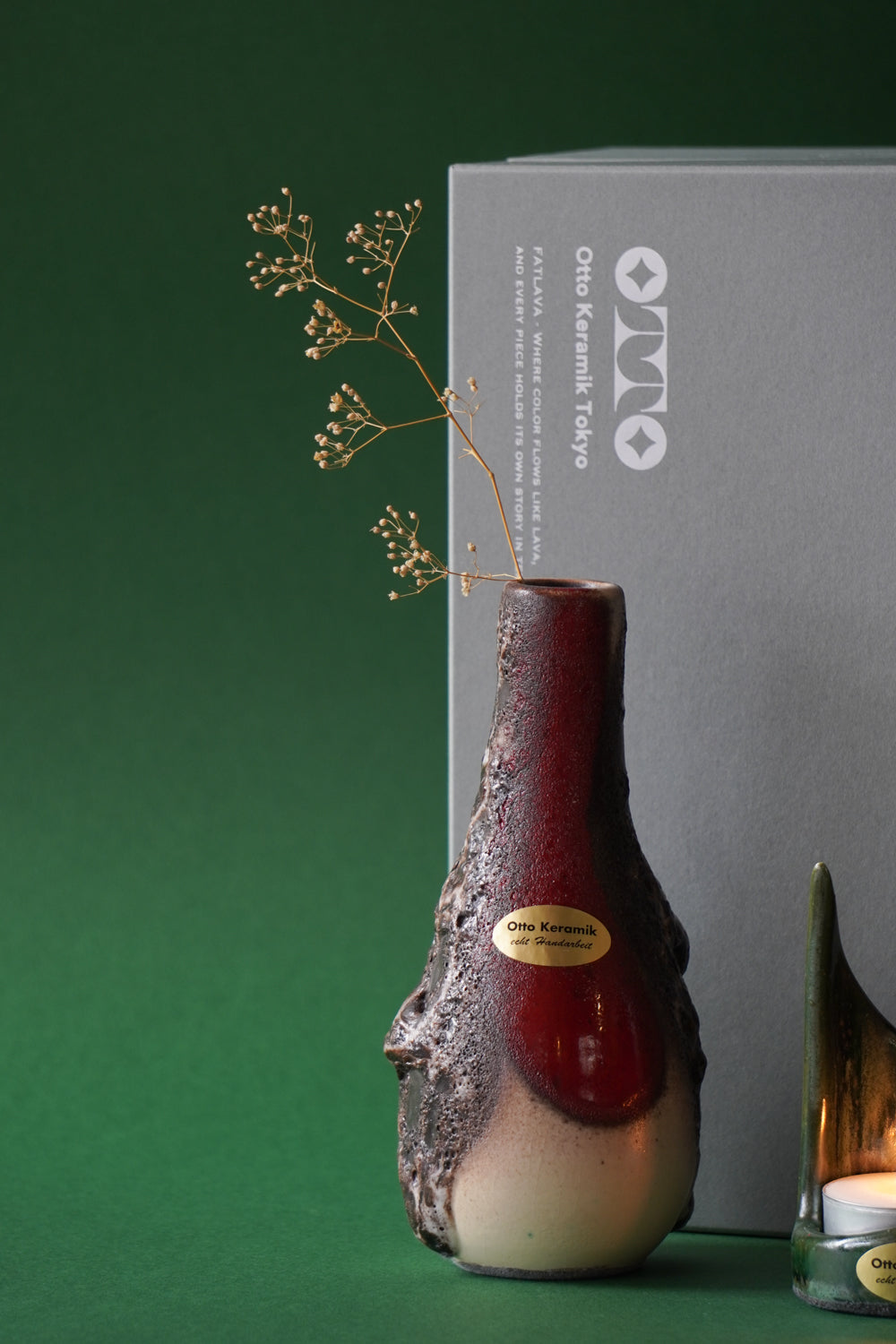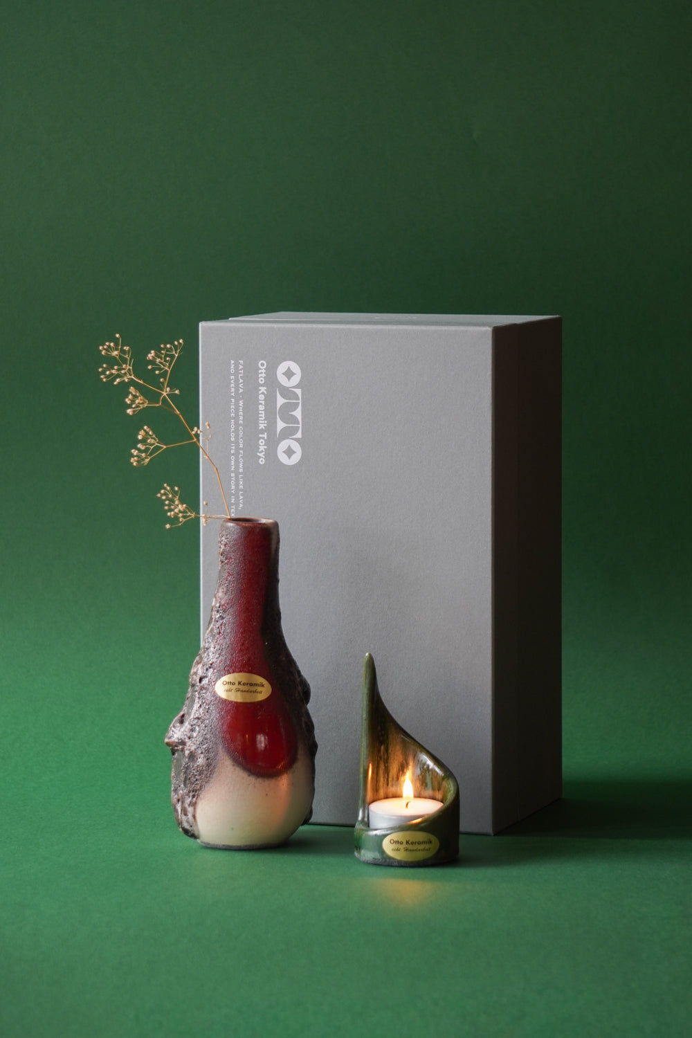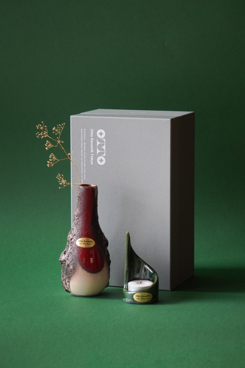 冬の静けさと温かい情熱のコントラストを連想させる花器に、美しいグリーンのキャンドルホルダーがクリスマスの華やかさを添えるセット。