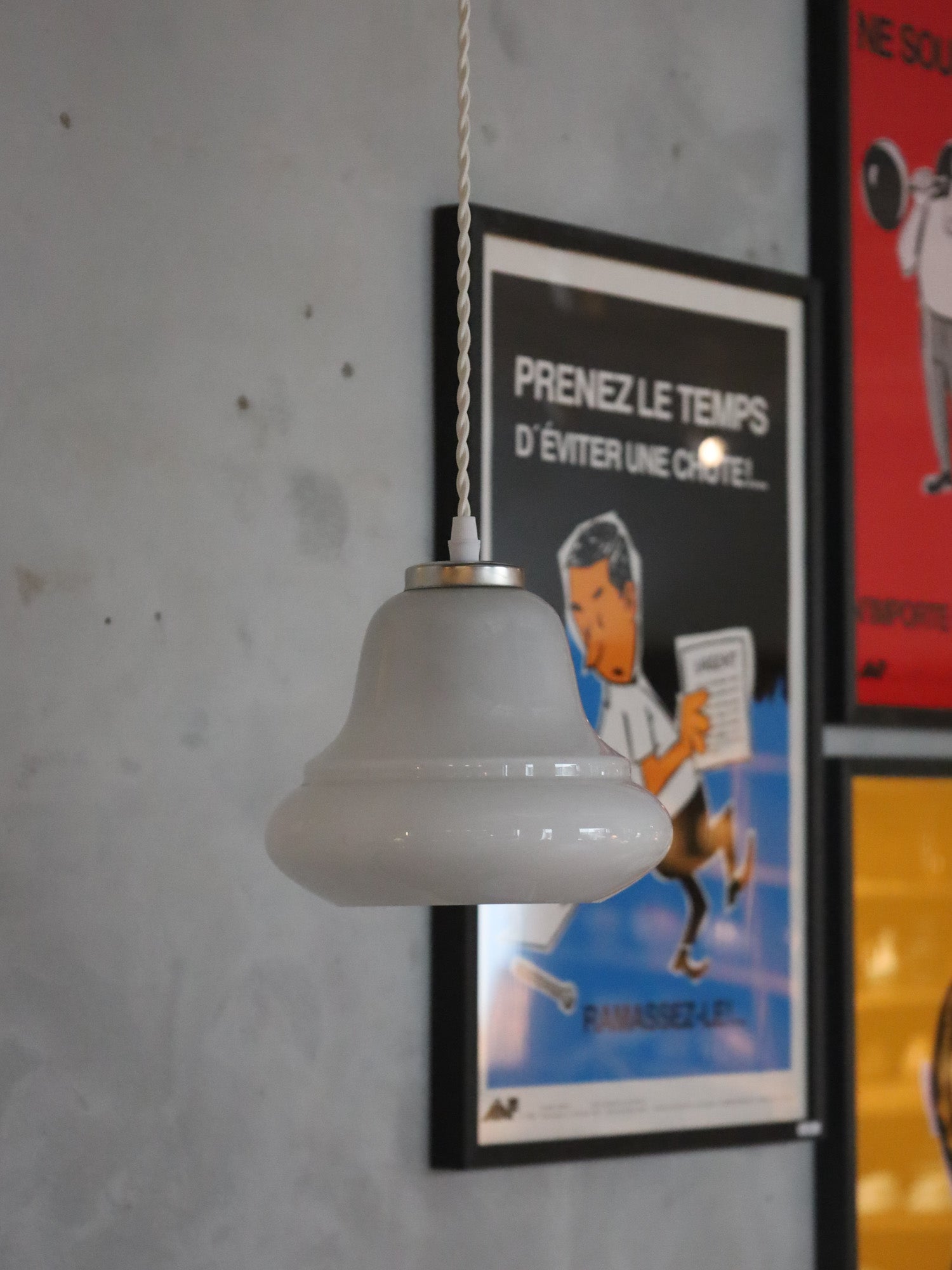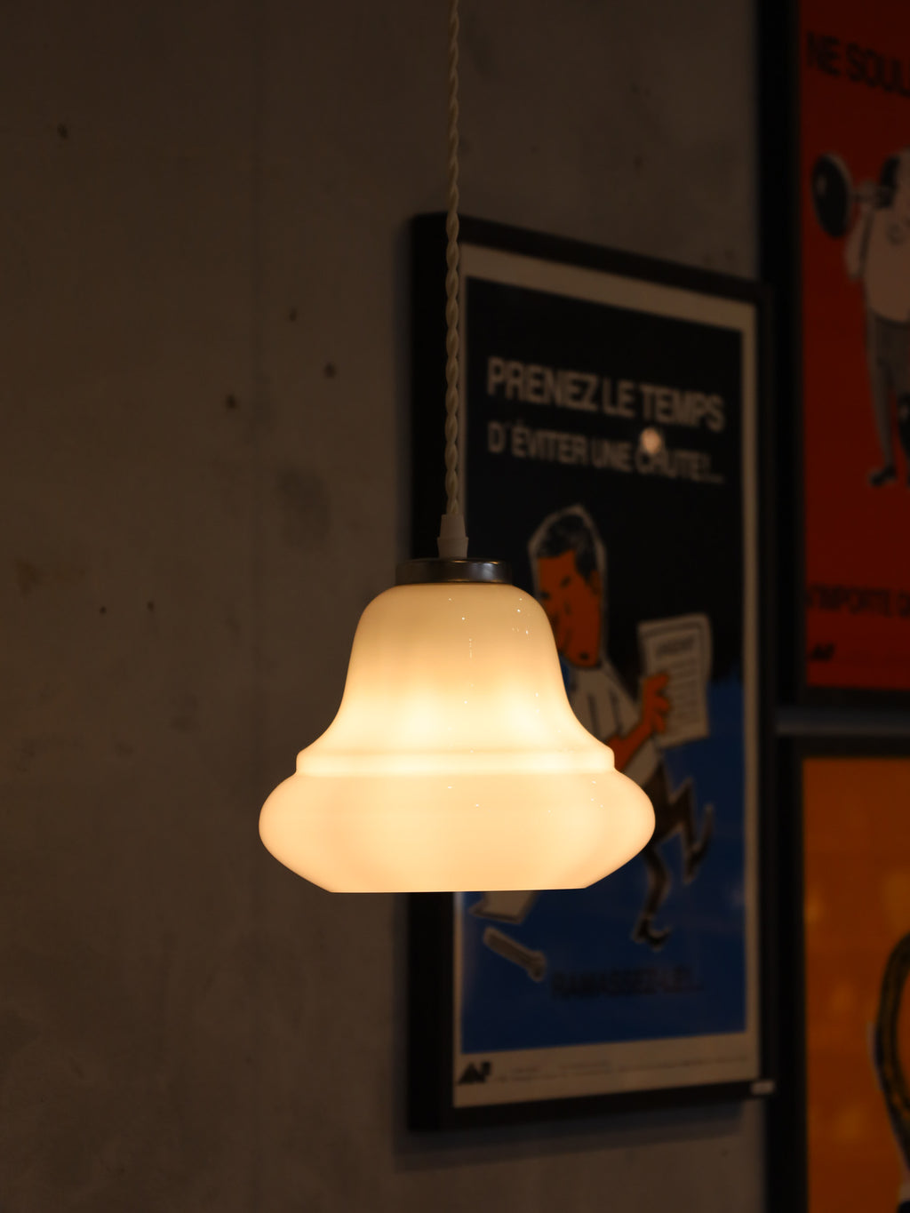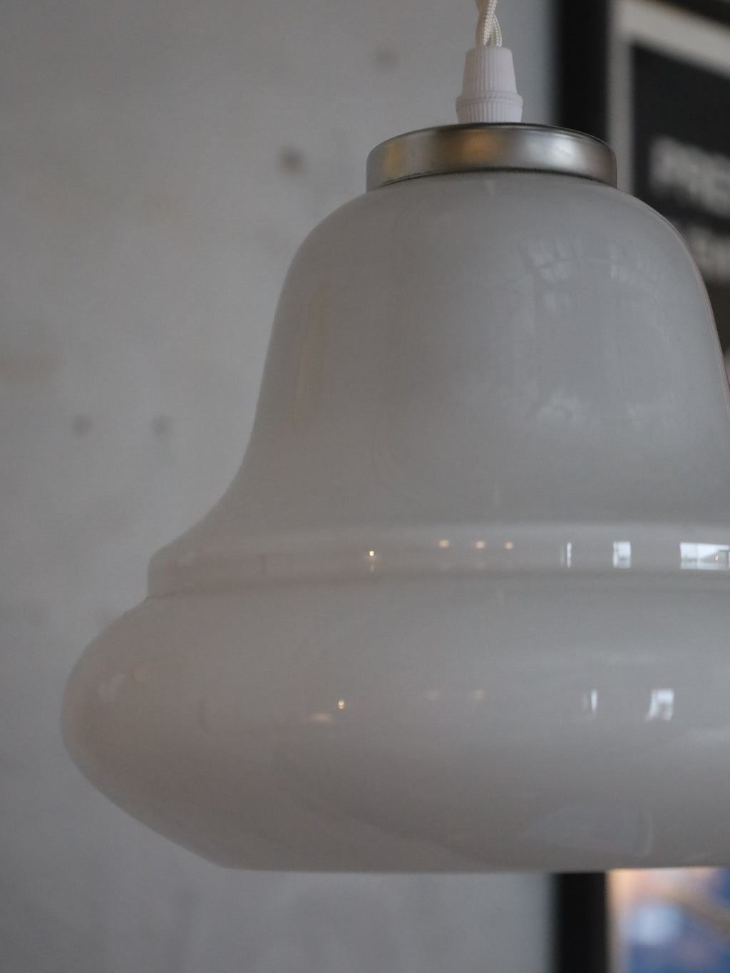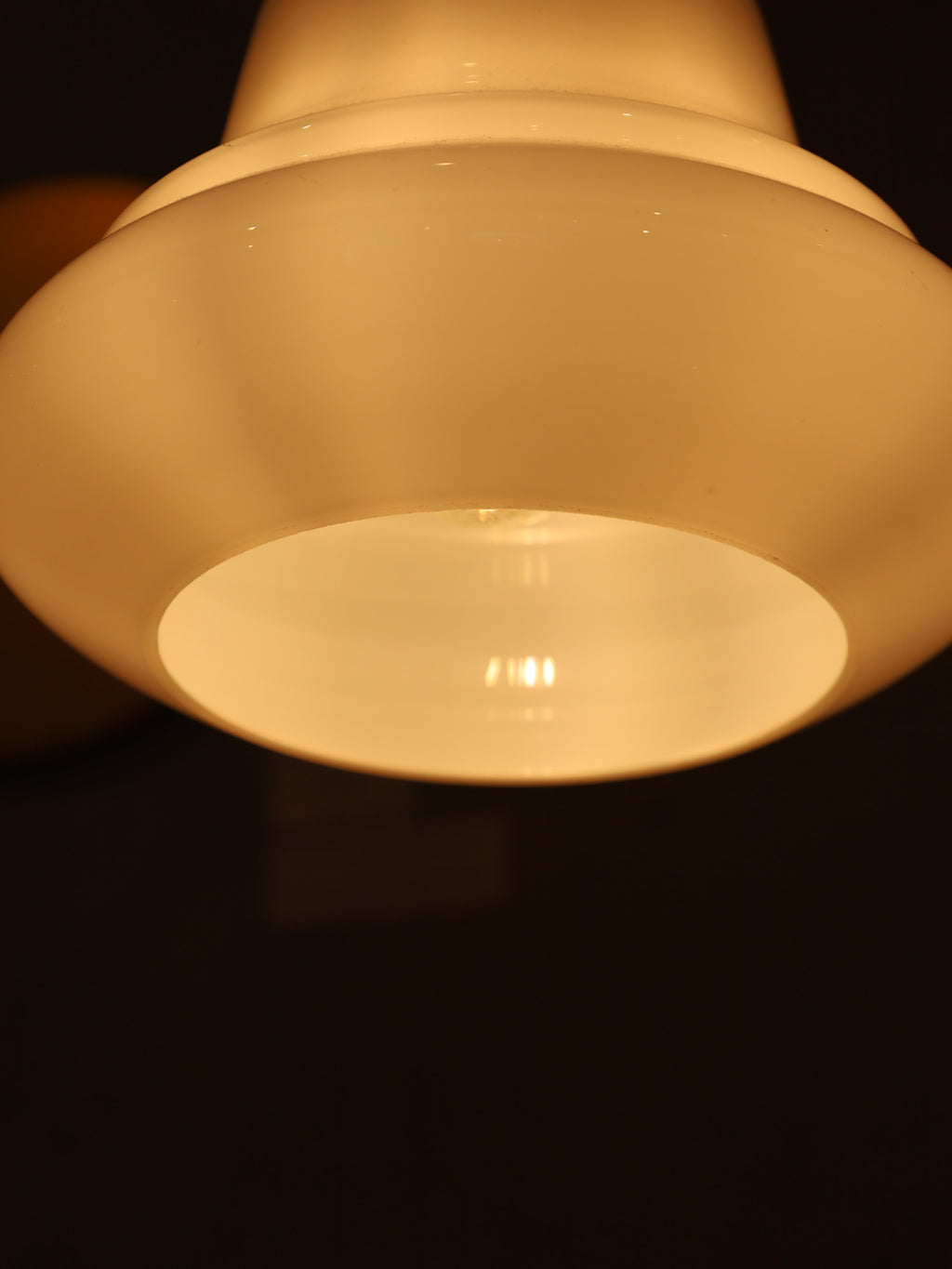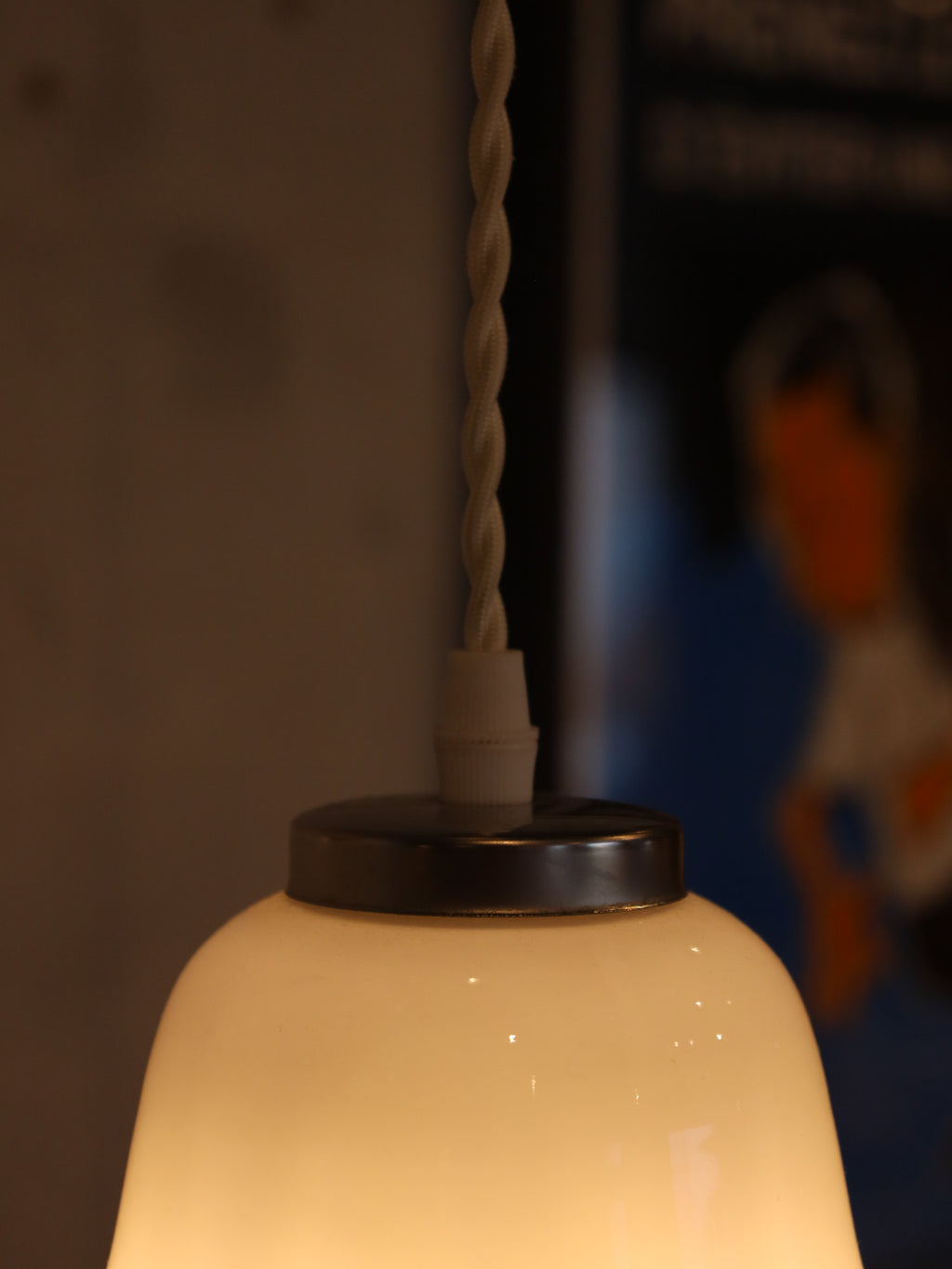 ミルクガラスのシェードが光を均一に拡散し、眩しさを抑えながら温かく柔らかな光を広げます。飽きのこないシンプルなデザインは、北欧ヴィンテージの家具との相性が抜群です。