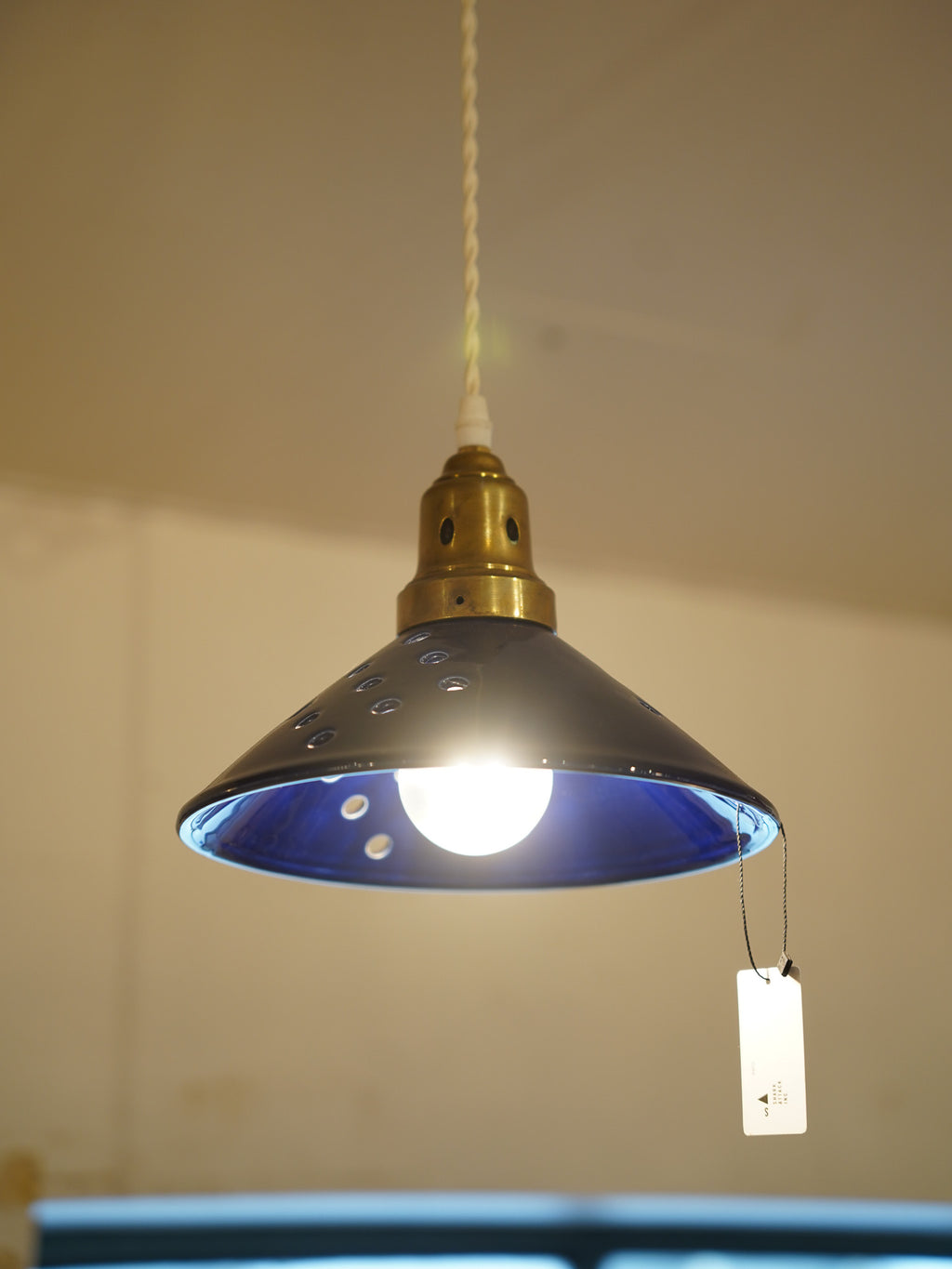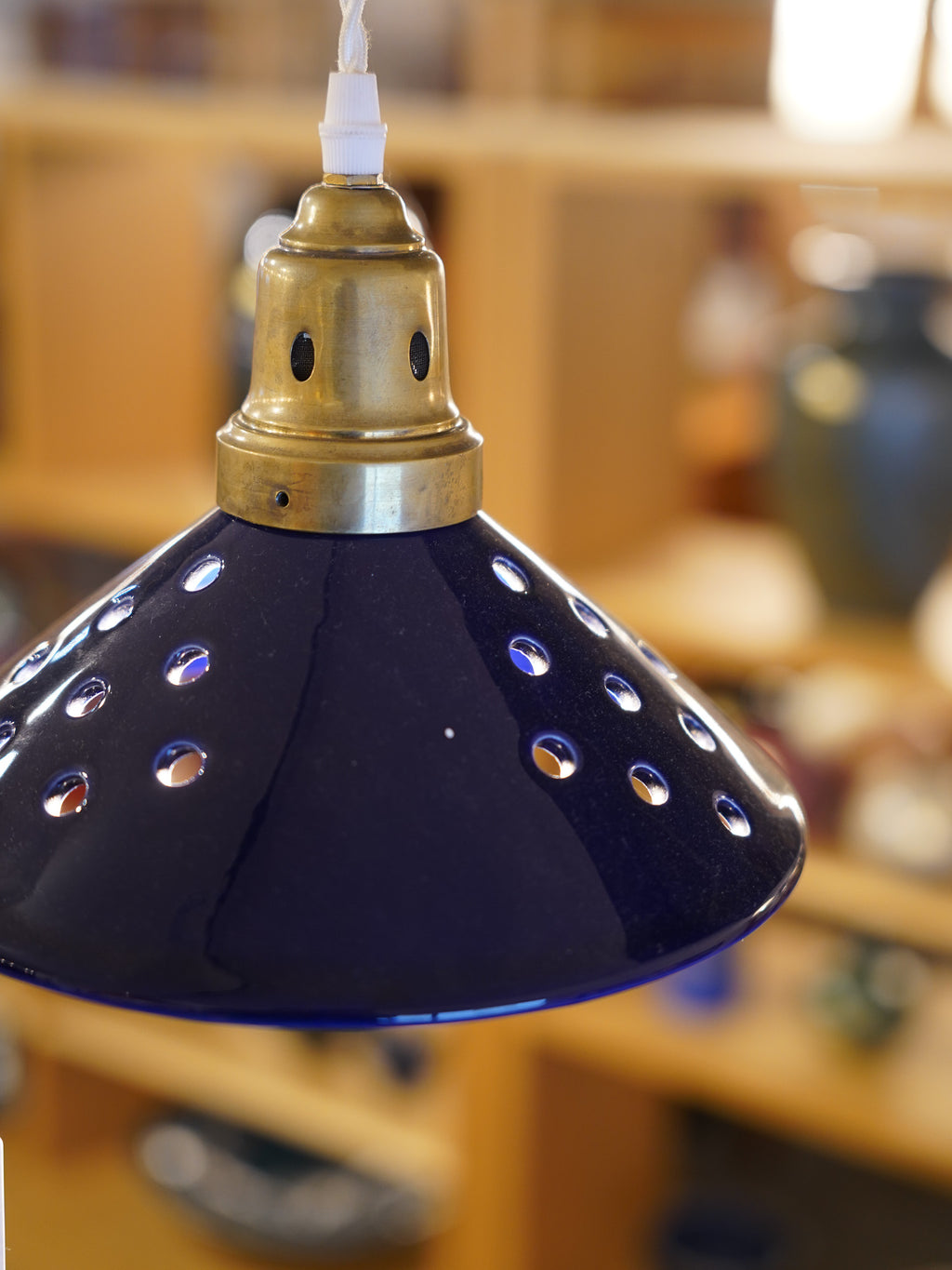 深みのあるブルーの陶器シェードが目を引く、素材の質感が豊かなヴィンテージペンダントランプです。