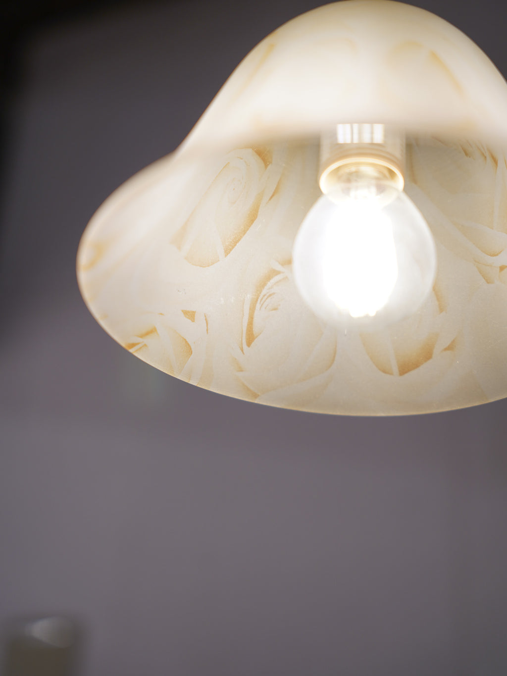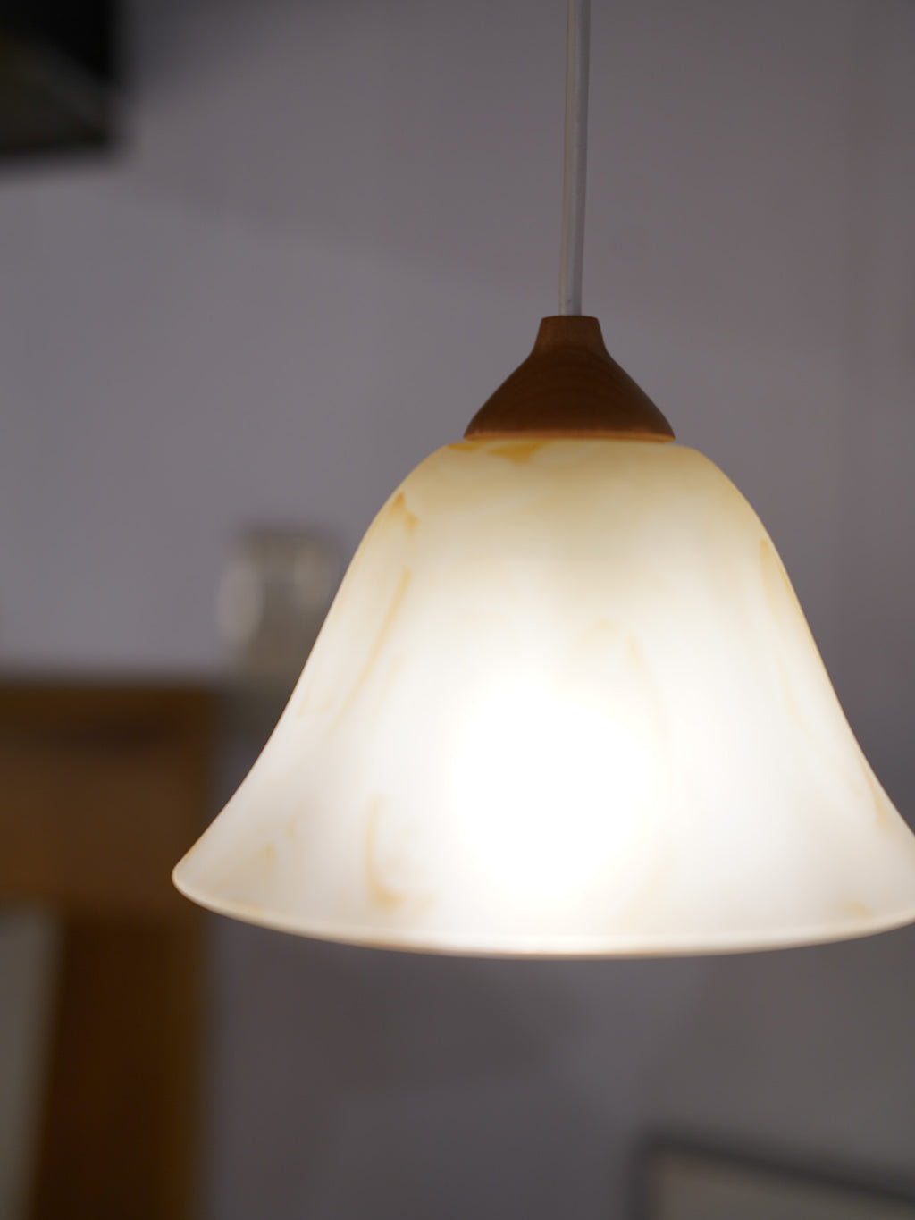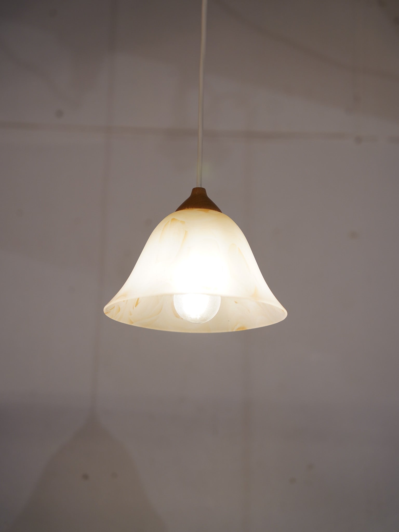 花が開いたようなベル型のガラスシェードには、淡いベージュのマーブル模様が溶け込んでおり、点灯すると空間全体を温かく優しく包み込みます。