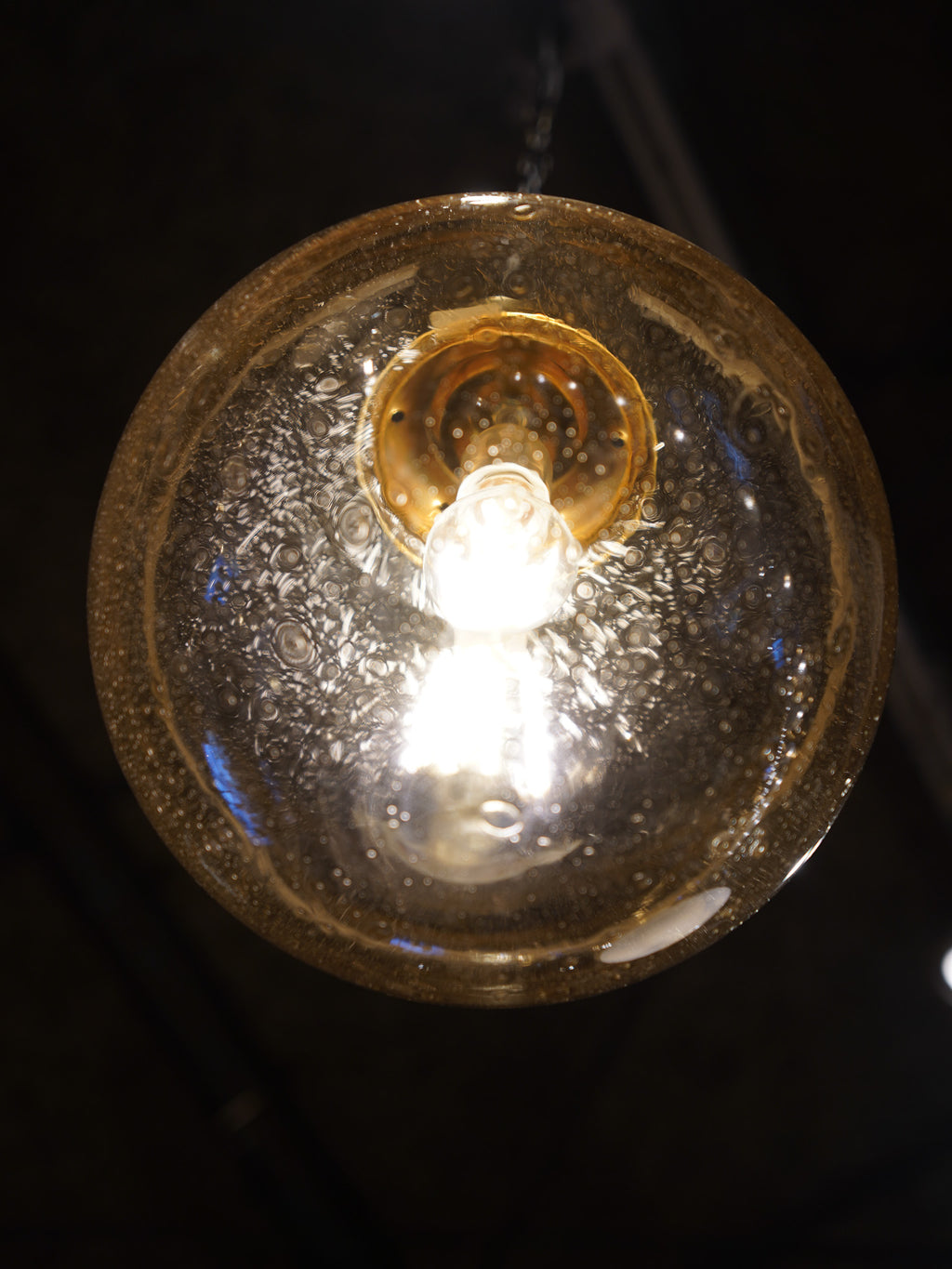シェード全体にランダムに閉じ込められた無数の気泡が、一つとして同じものがない独特の表情を生み出しています。点灯すると、ガラスの濃淡と気泡を通して光が屈折し、空間全体に水面のような揺らぎと、心地よい温かみのある色を広げます。上部の金具には真鍮を採用し、ヴィンテージ感をより一層引き立てています。