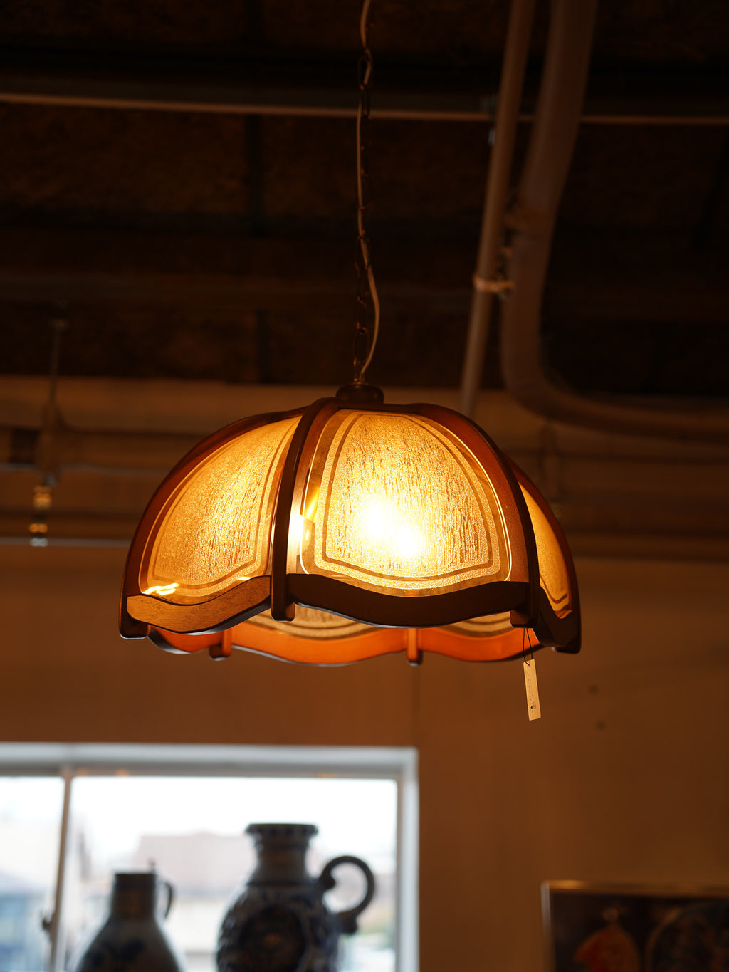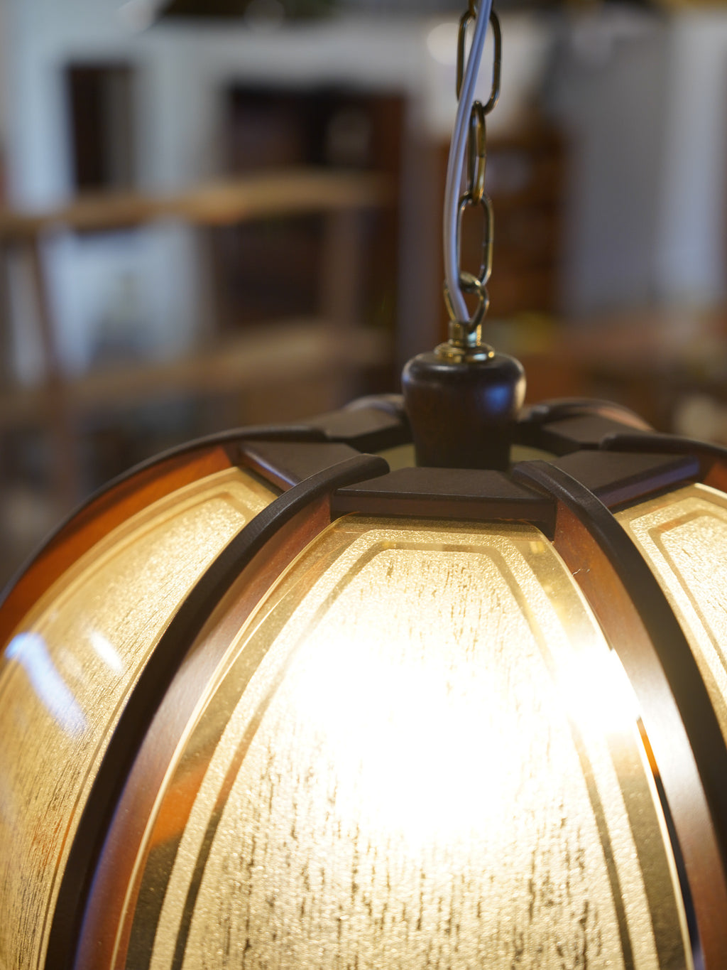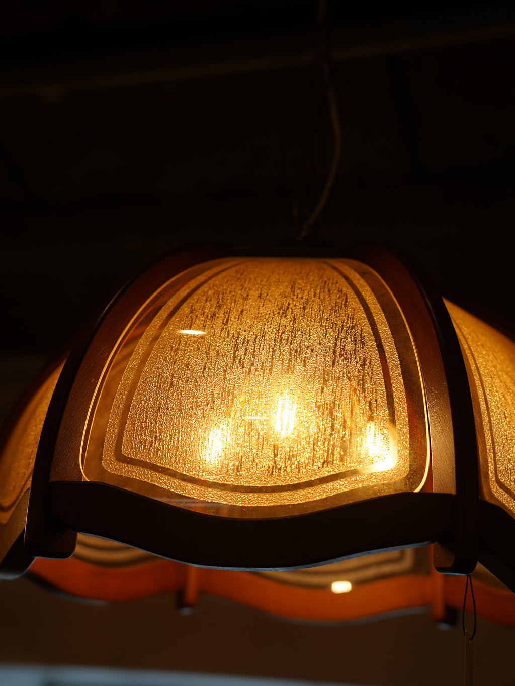 濃い色味の木製フレームが多角形のドーム型シェードを構成し、その間に嵌め込まれたガラスパネルは、表面にランダムな凹凸を持つことで、光を優しく拡散します。点灯すると、ガラスを透過した光は温かみのある琥珀色を帯び、心地よいムードを醸し出します。