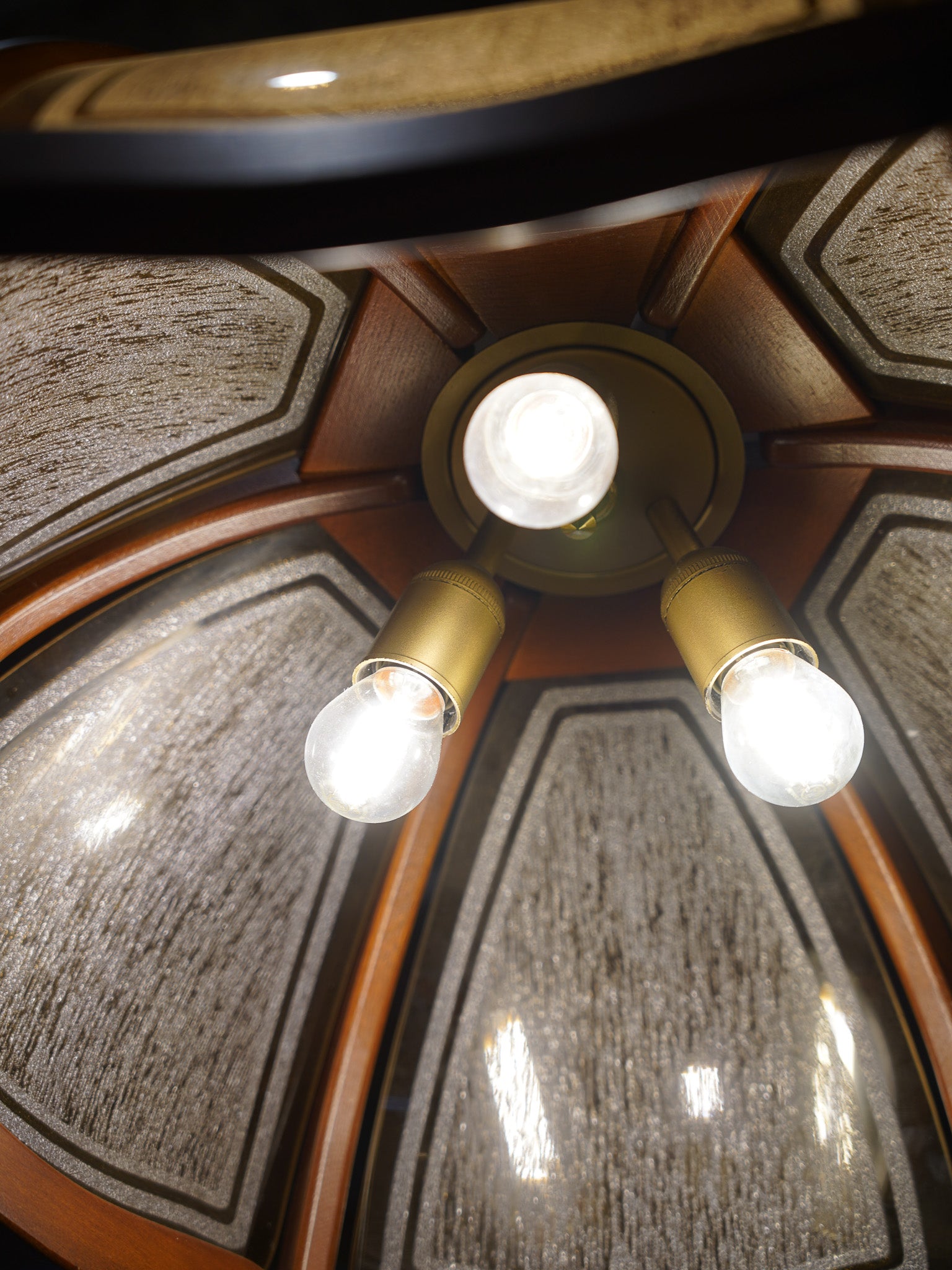 シェード内には3つの光源が配置されており、下方をしっかりと照らしつつ、木枠とガラスのコントラストが周囲の壁や天井に格調高い陰影を刻みます。この多面的な光の演出が、インテリアを単なる明るさだけでなく、重厚で豊かな表情を与えてくれます。