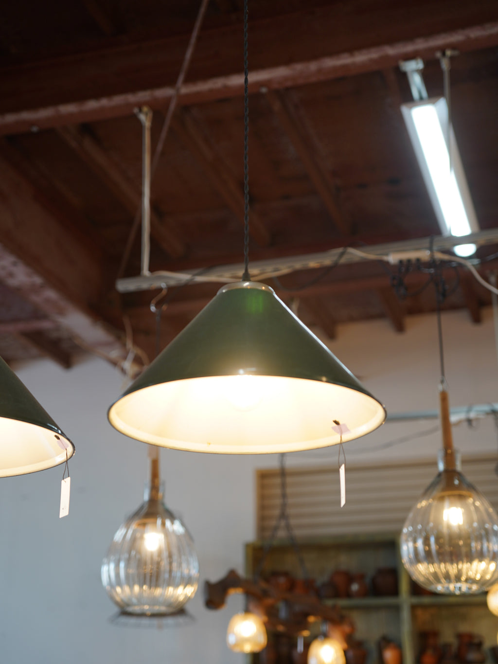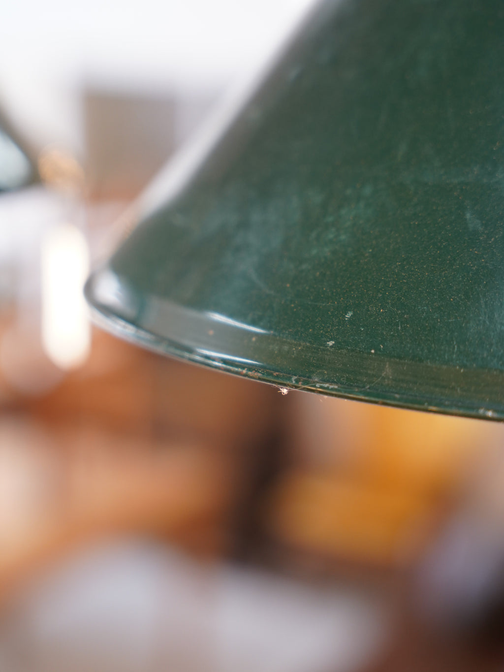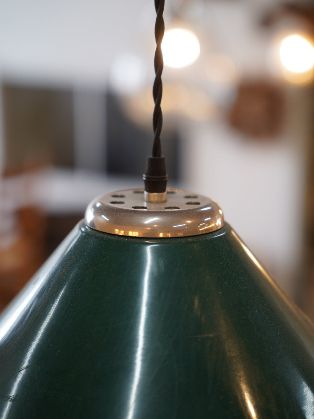 グリーンのホーローと真鍮色の組み合わせがインダストリアルな雰囲気のペンダントランプ。