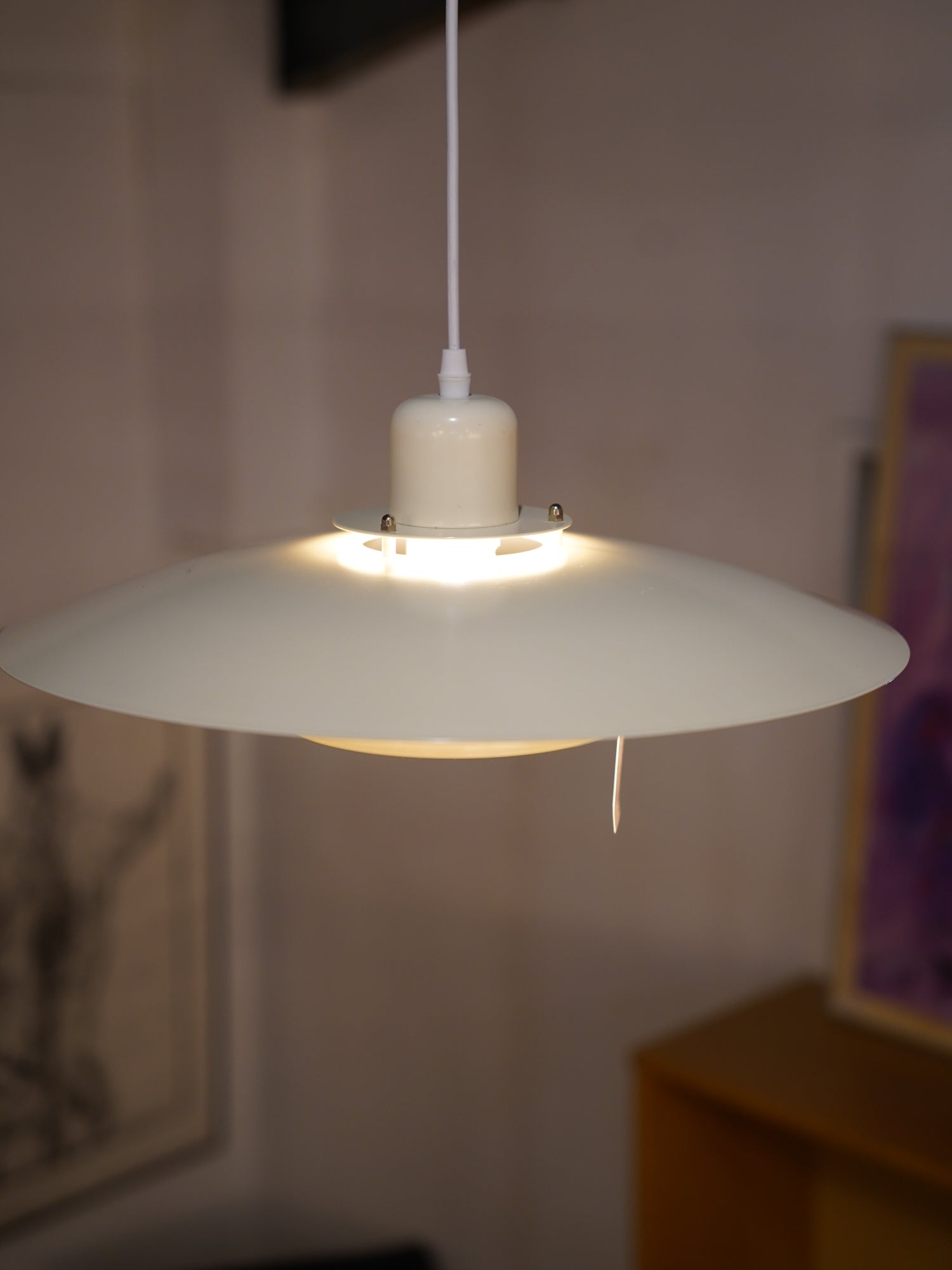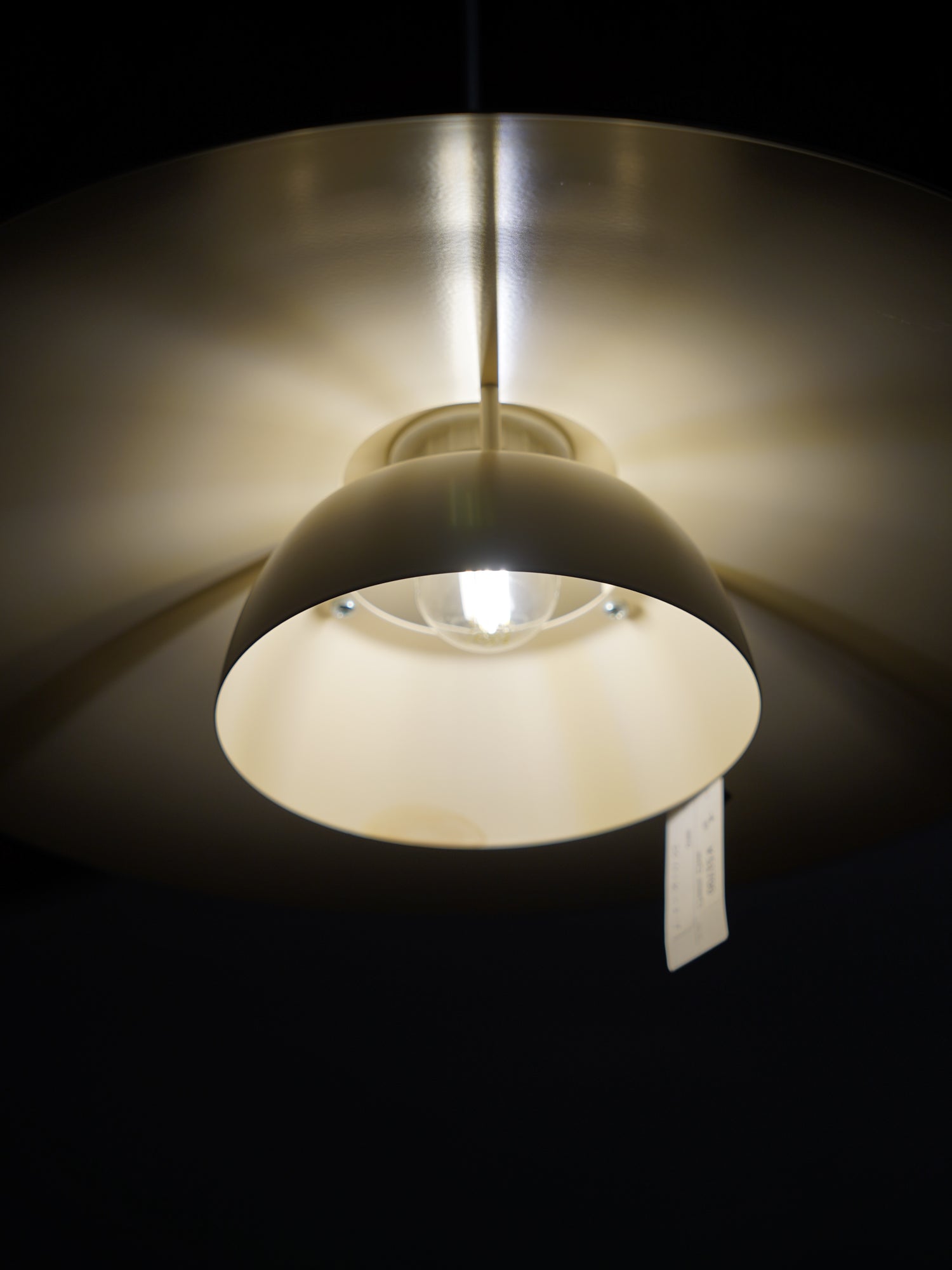 最大の魅力は、柔らかな光と機能的なフォルムの調和にあります。ランプシェードは、緩やかなカーブを描く円盤状の二重構造となっており、光源を完全に覆うことなく、上からも下からも優しく光を拡散します。これにより、光が直接目に入ることがなく、空間全体を均一で温かい間接光で包み込みます。