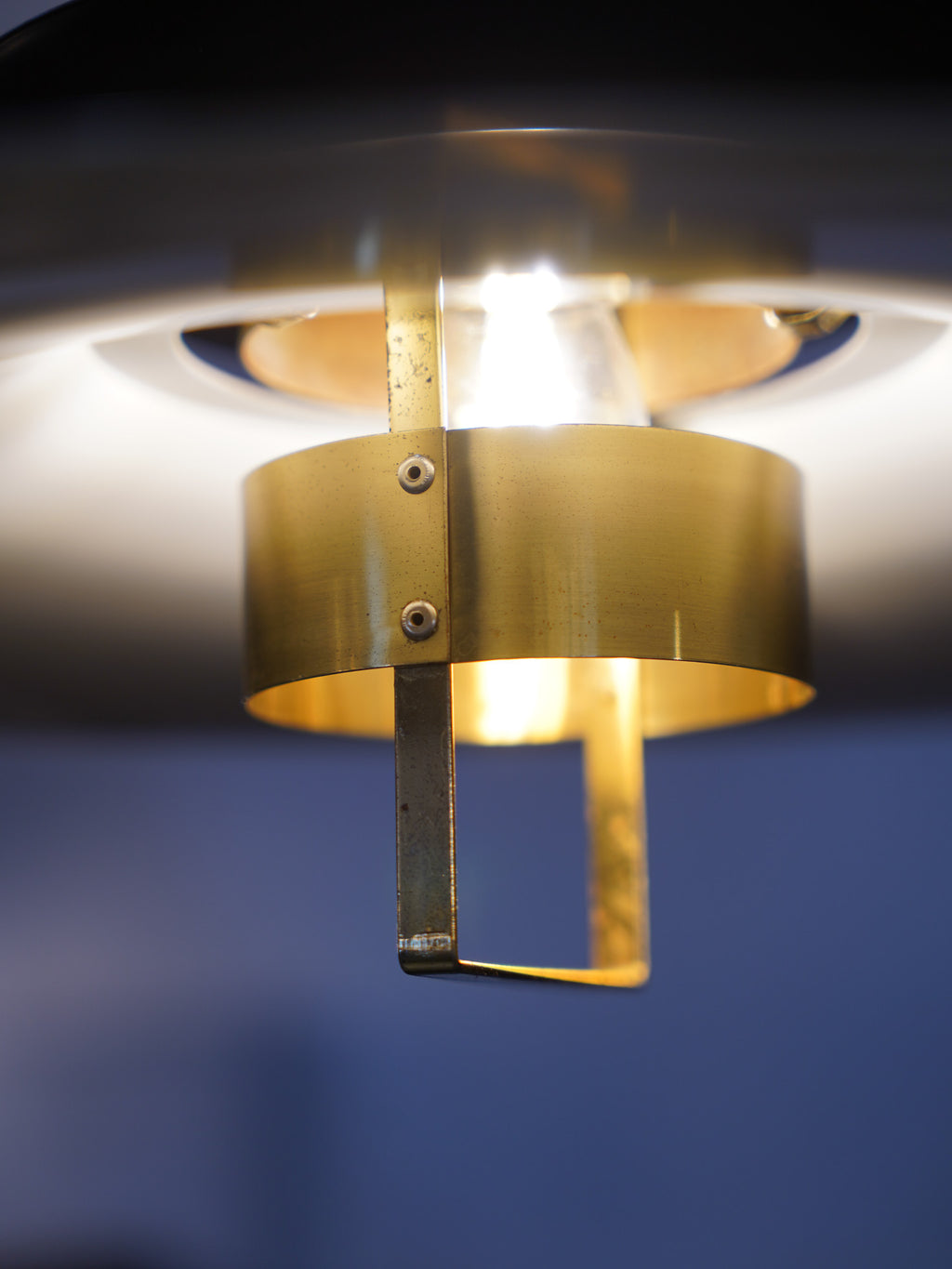 電球部を覆う上部には光沢のある素材が使われ、その下に複数のダークカラーのシェードを組み合わせた多層構造が特徴です。