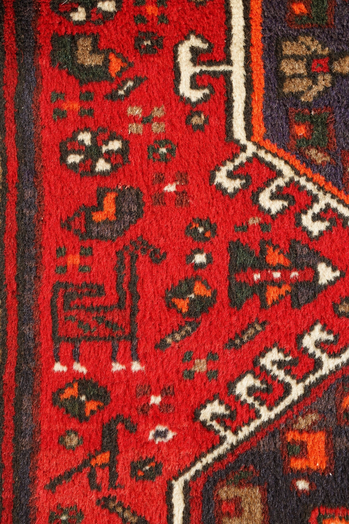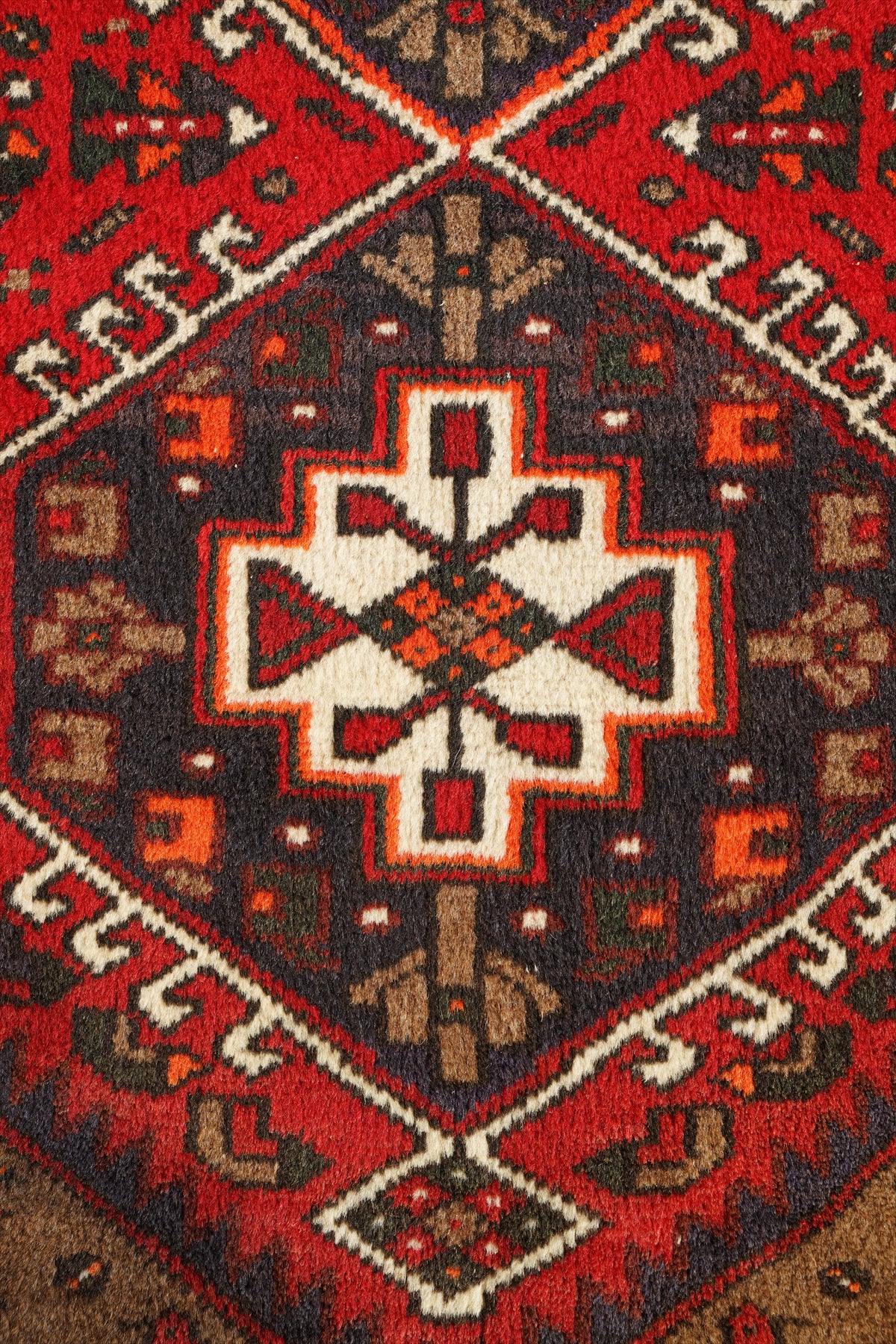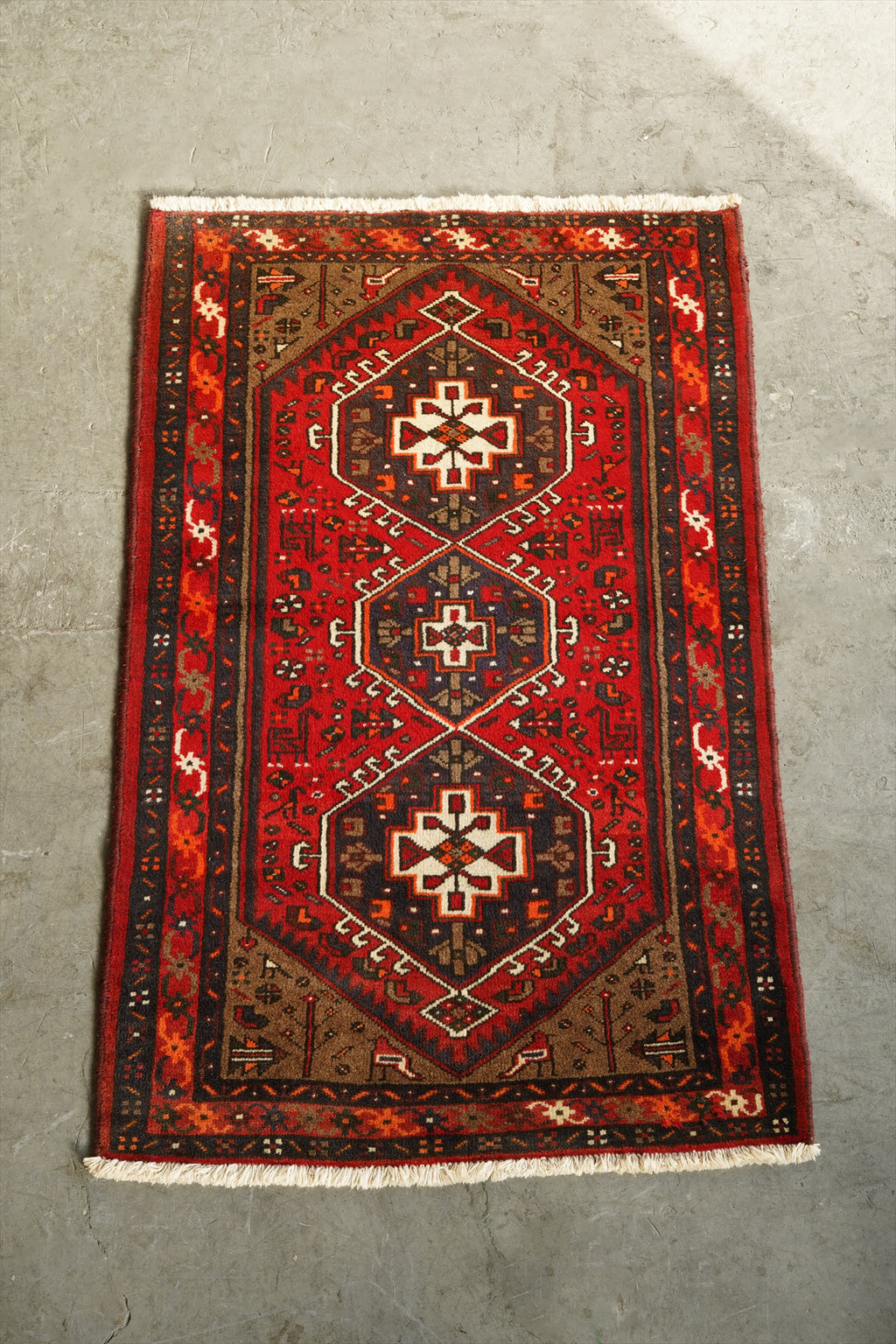中央には、バルーチ絨毯に特徴的な菱形が縦に連なる幾何学模様が大胆に配置され、その中には、魔除けや豊穣などの願いが込められた部族のシンボルが細かく織り込まれています。
