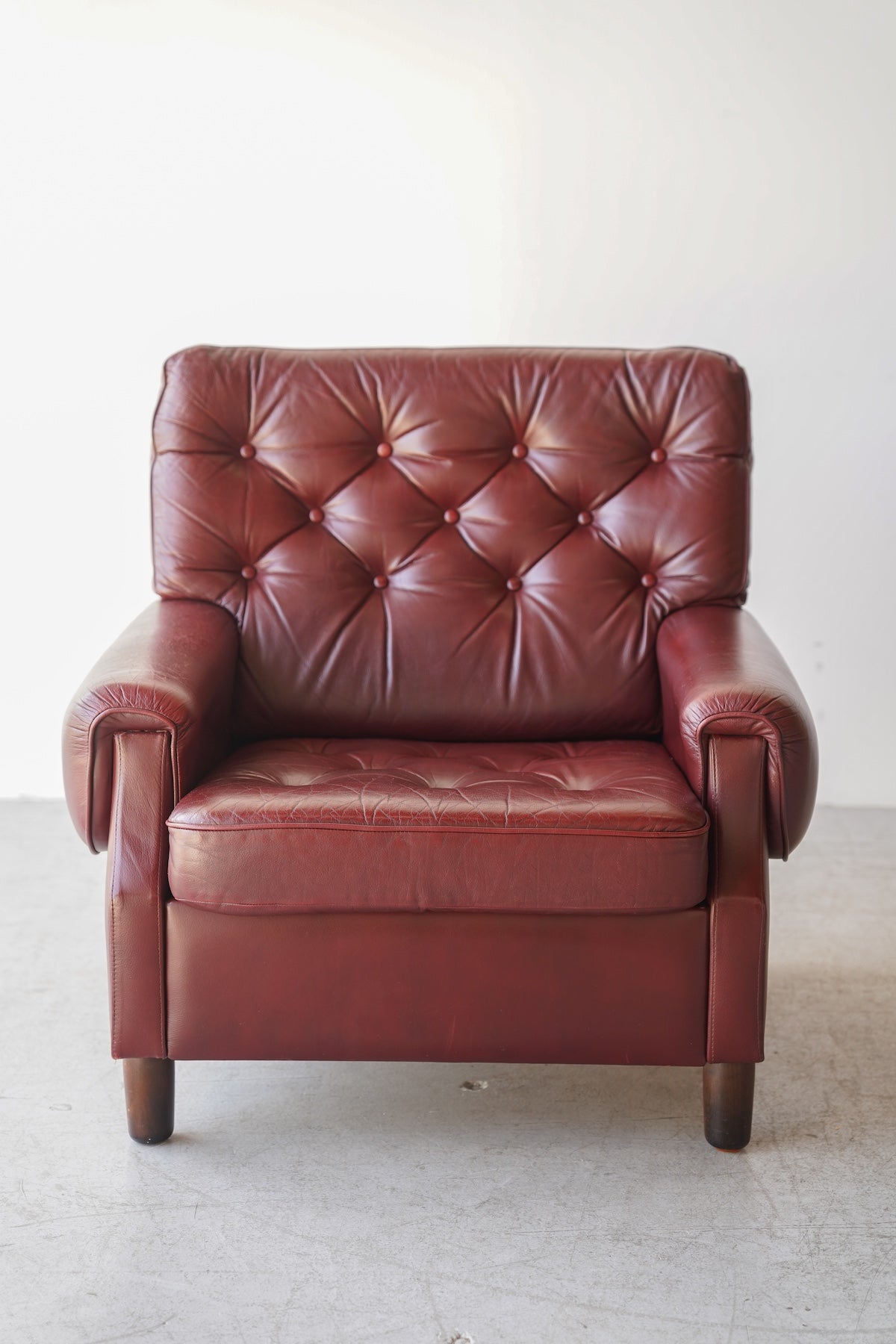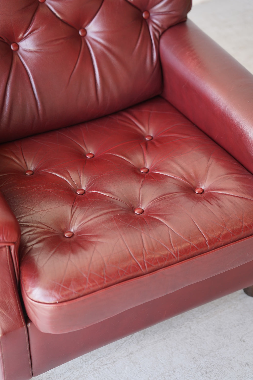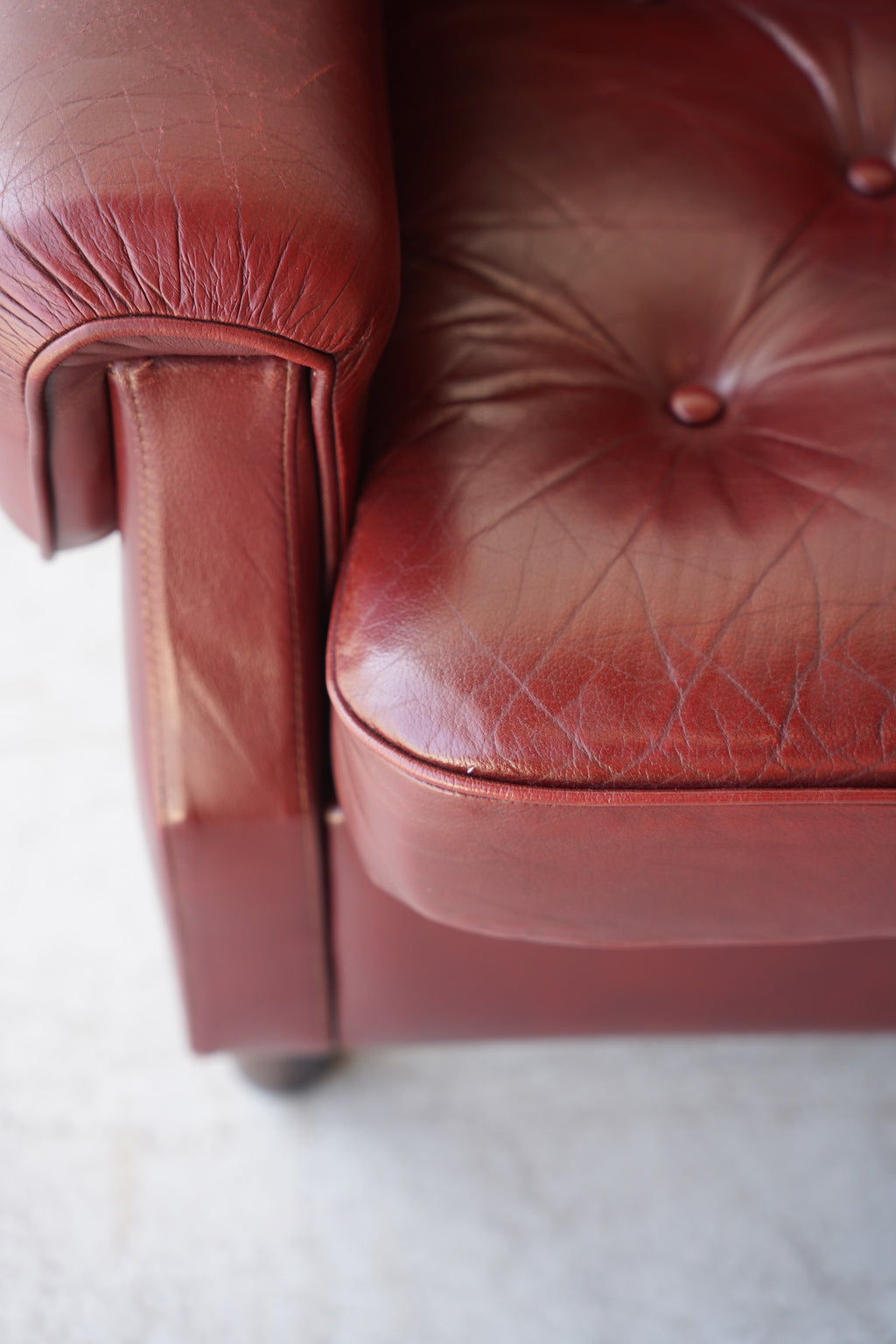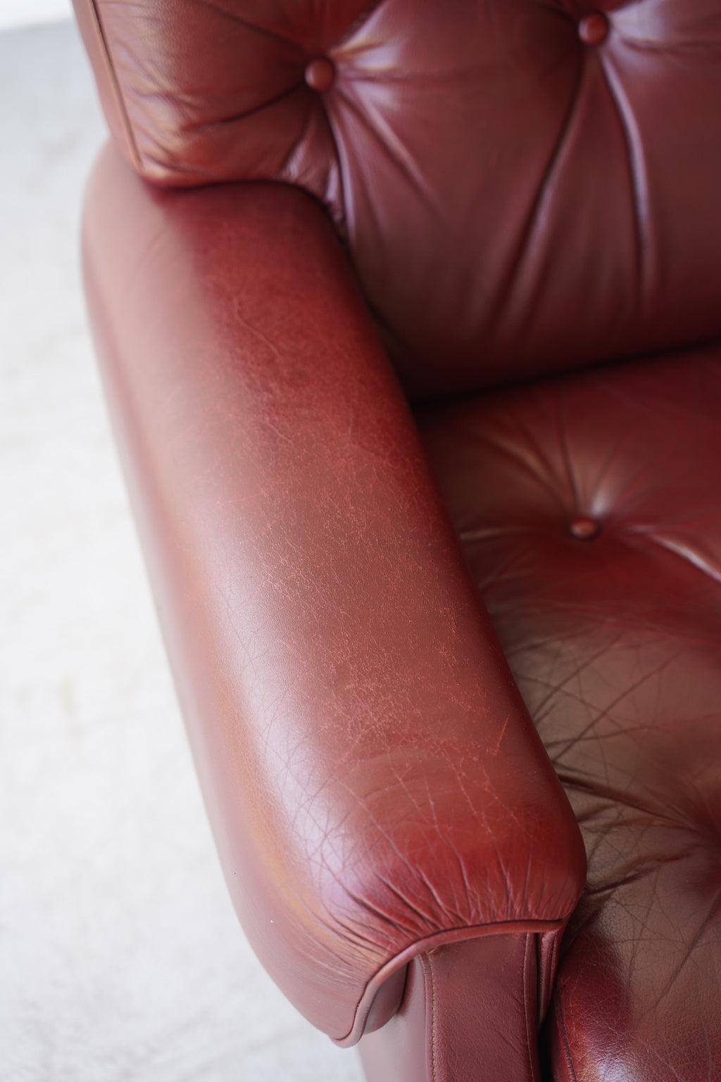 このアームチェアの最大の魅力は、そのゆったりとした座り心地と、長年愛用されてきた本革の豊かな風合いにあります。深く美しい赤茶色のレザーは、背もたれと座面にボタン締めのタフティング加工が施されており、デザインのアクセントとなると同時に、体を包み込むような快適な座り心地を提供します。