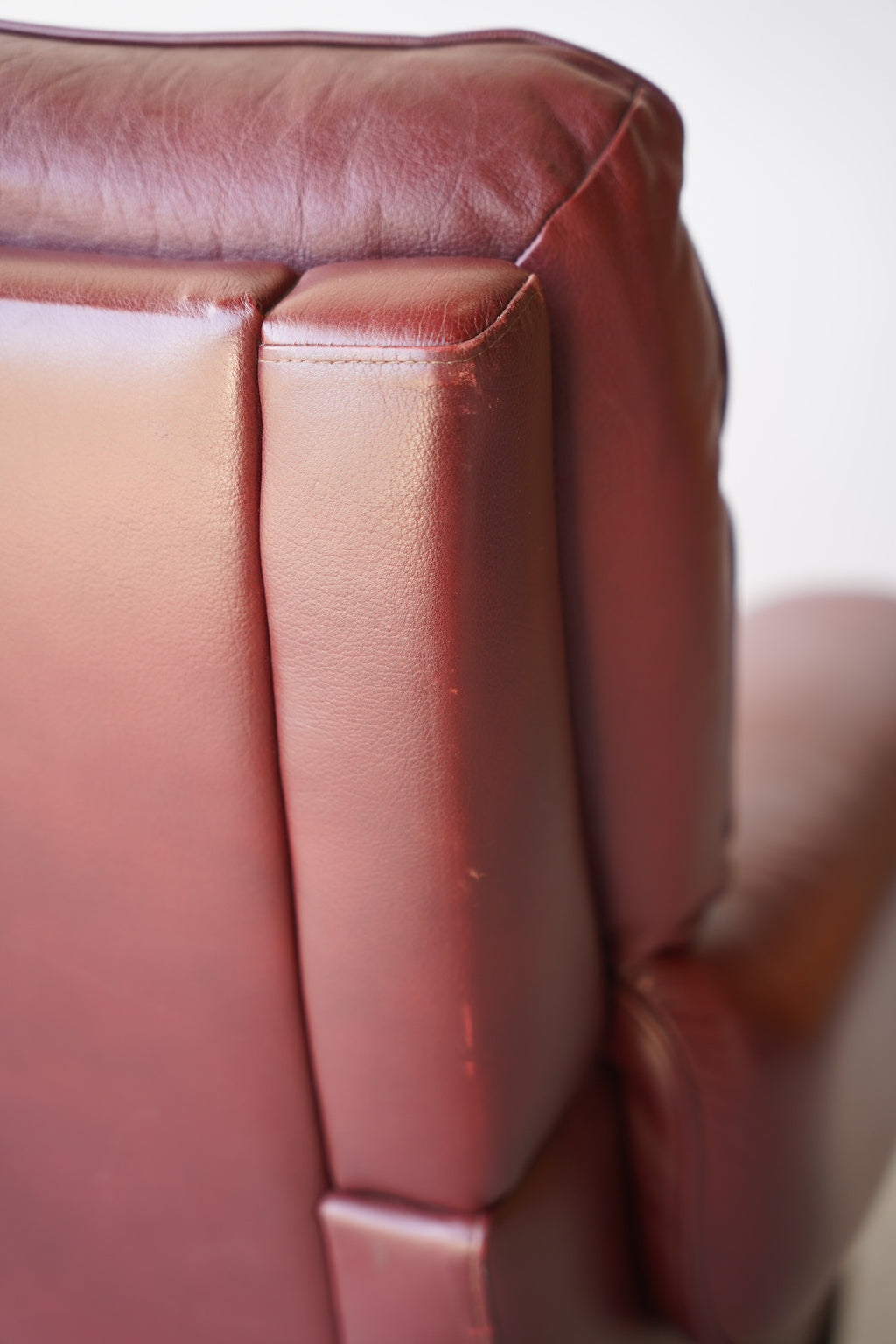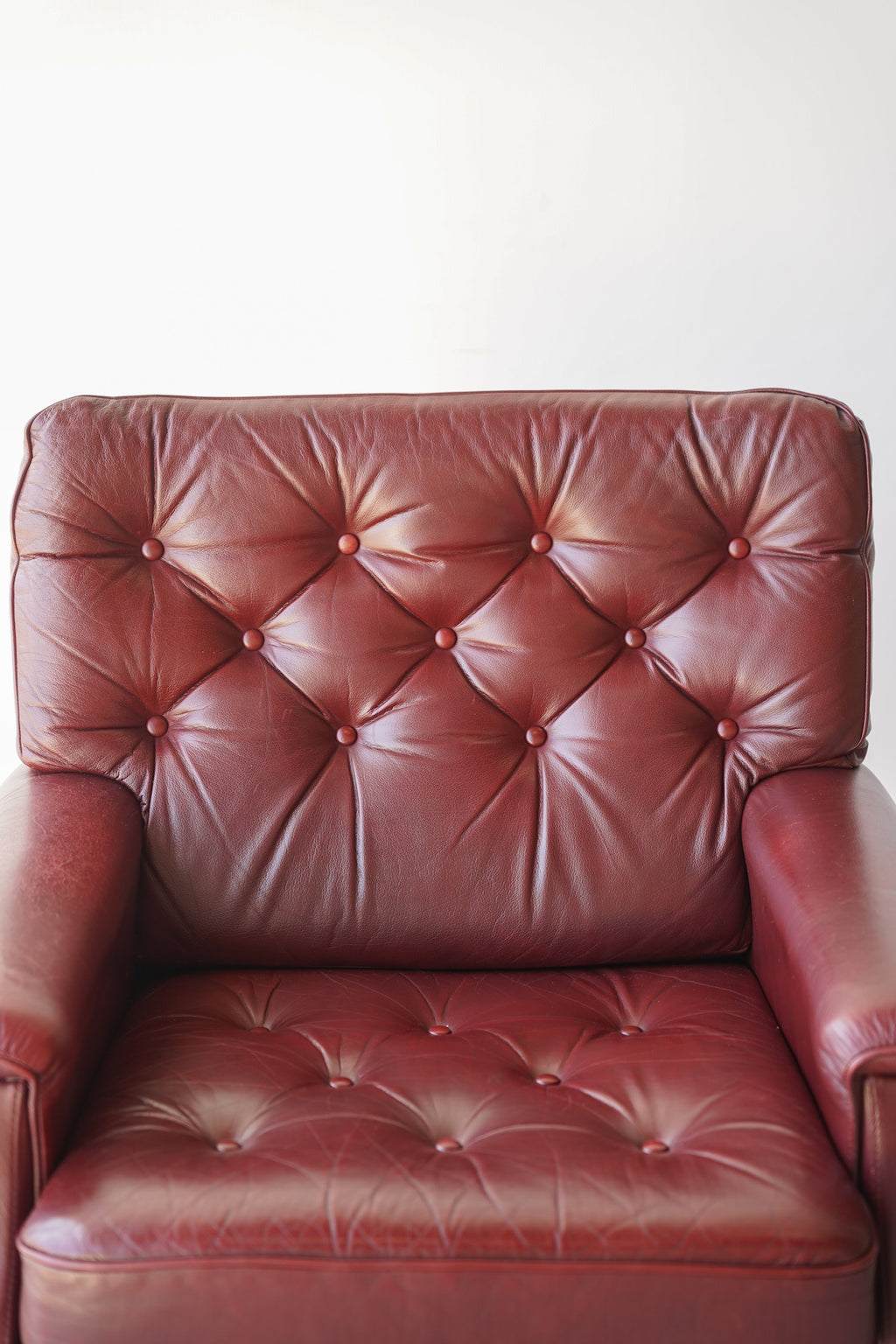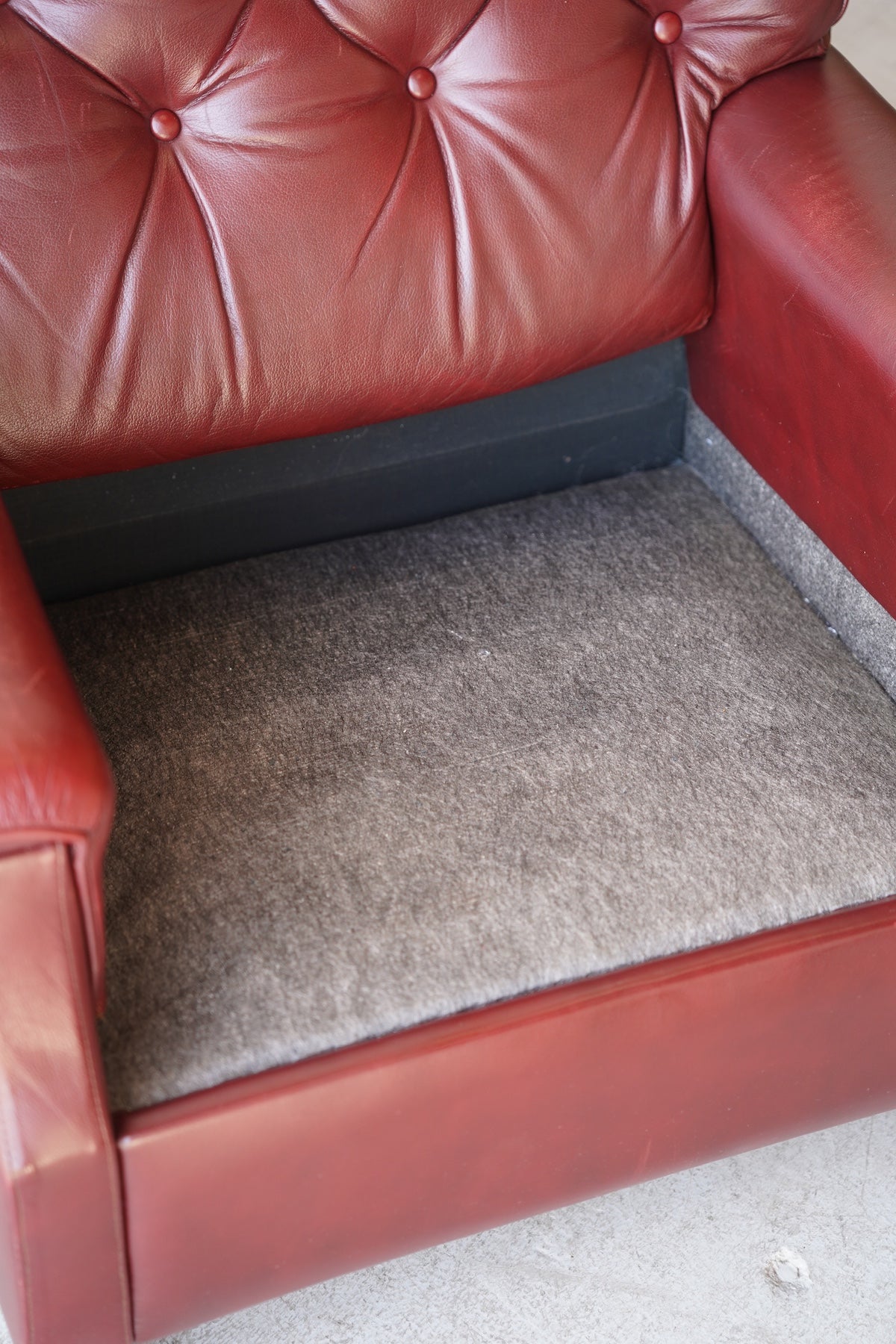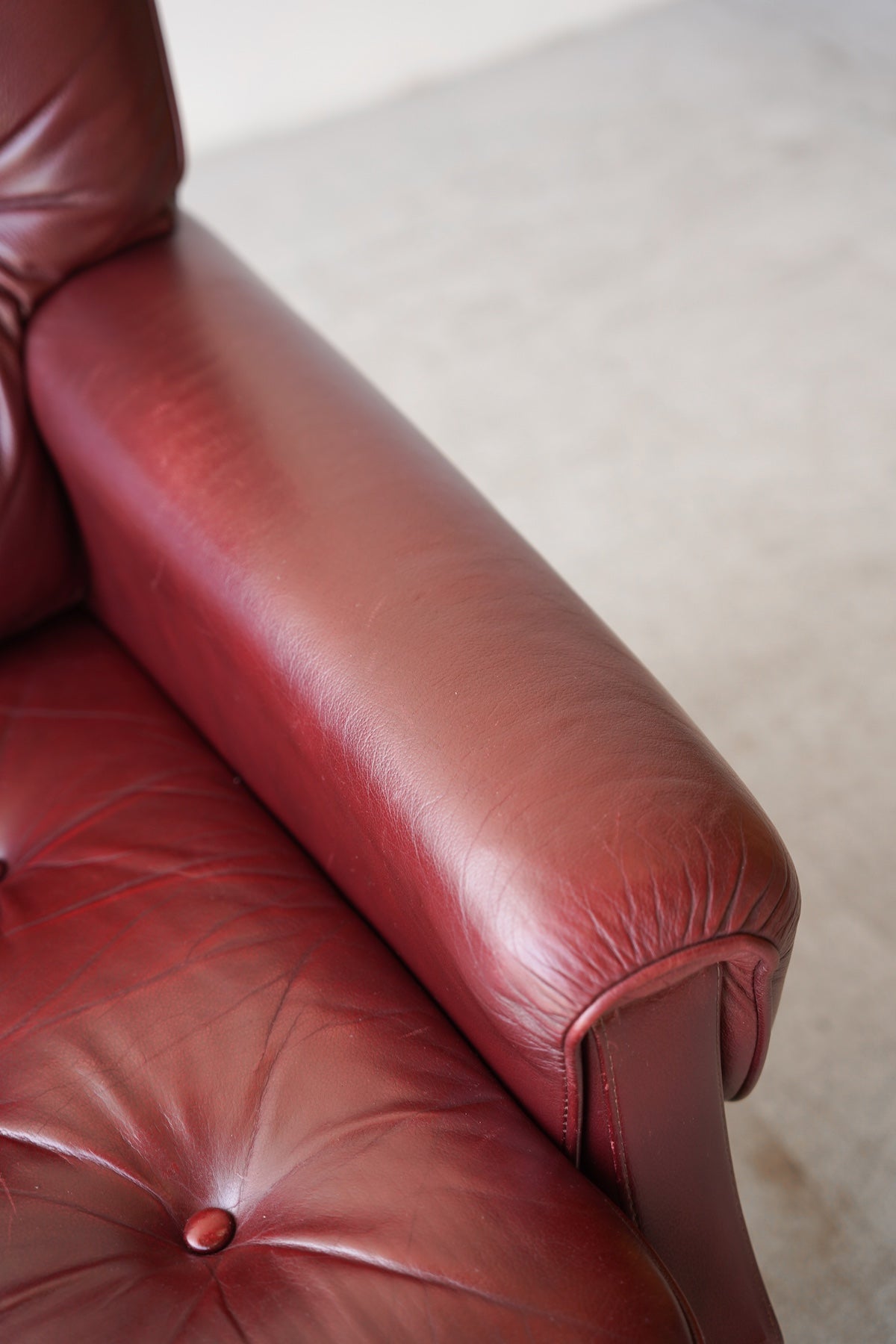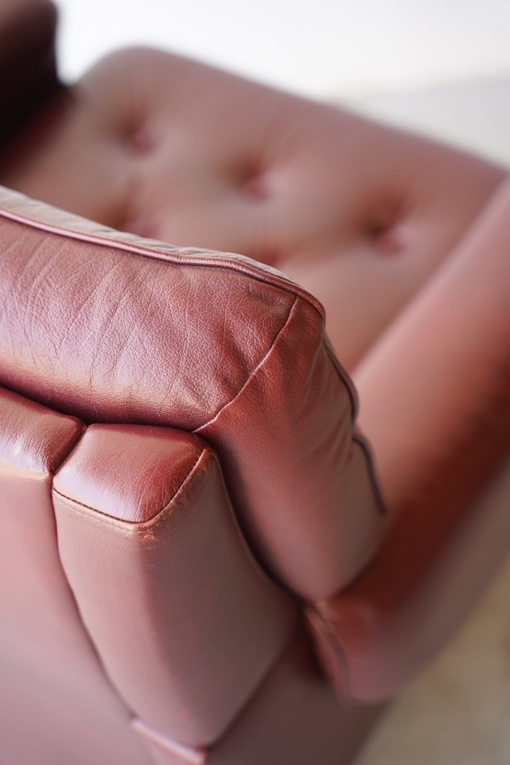 このアームチェアの最大の魅力は、そのゆったりとした座り心地と、長年愛用されてきた本革の豊かな風合いにあります。深く美しい赤茶色のレザーは、背もたれと座面にボタン締めのタフティング加工が施されており、デザインのアクセントとなると同時に、体を包み込むような快適な座り心地を提供します。