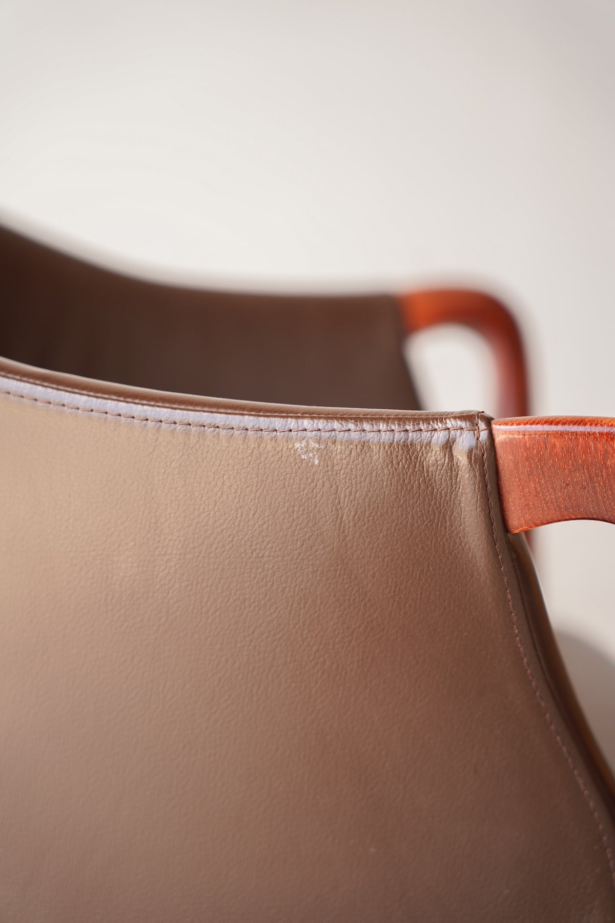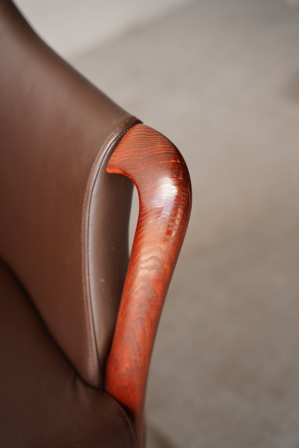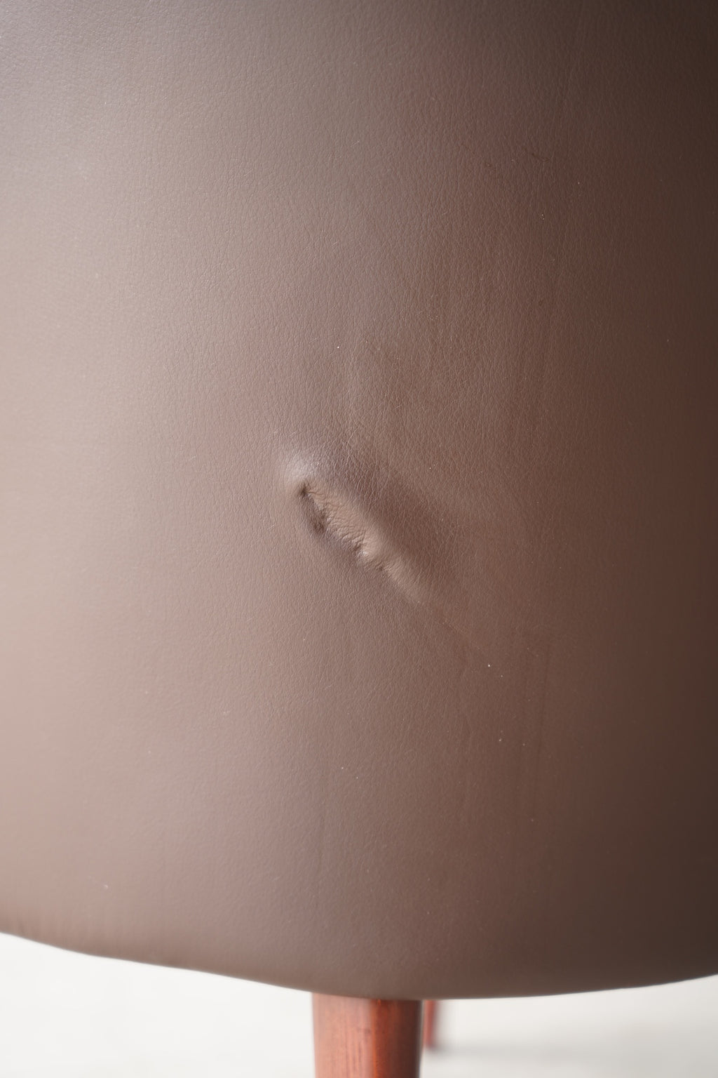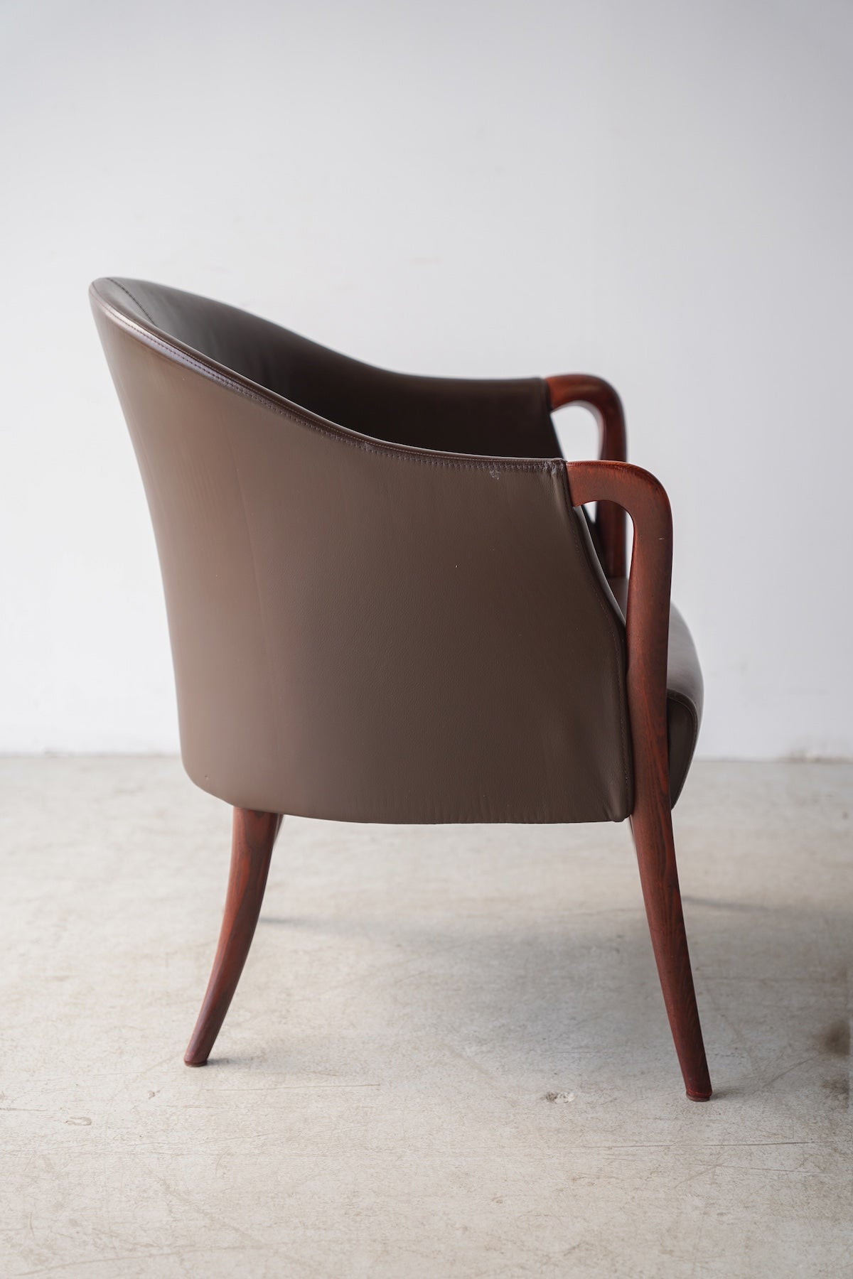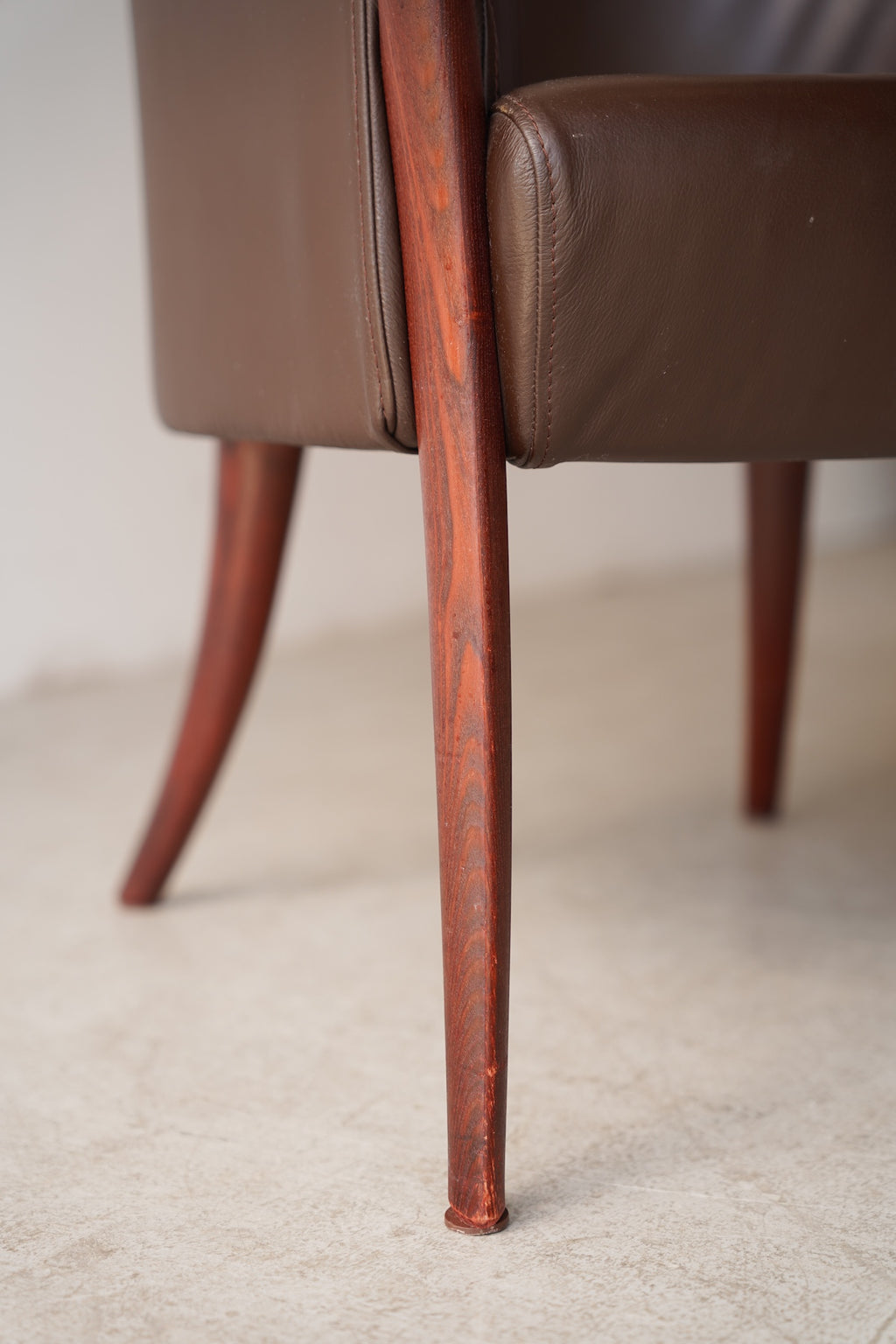 こちらは、1950年代から1960年代頃にデンマークで製造されたとみられる、ヴィンテージのレザーアームチェアです。デンマーク・ミッドセンチュリーデザインらしい、流れるような有機的なフォルムと、質の高い素材が魅力の一脚です。製造メーカーやデザイナーは不明ですが、その類まれな美しさと、確かな作りが、当時の北欧家具の質の高さを物語っています。