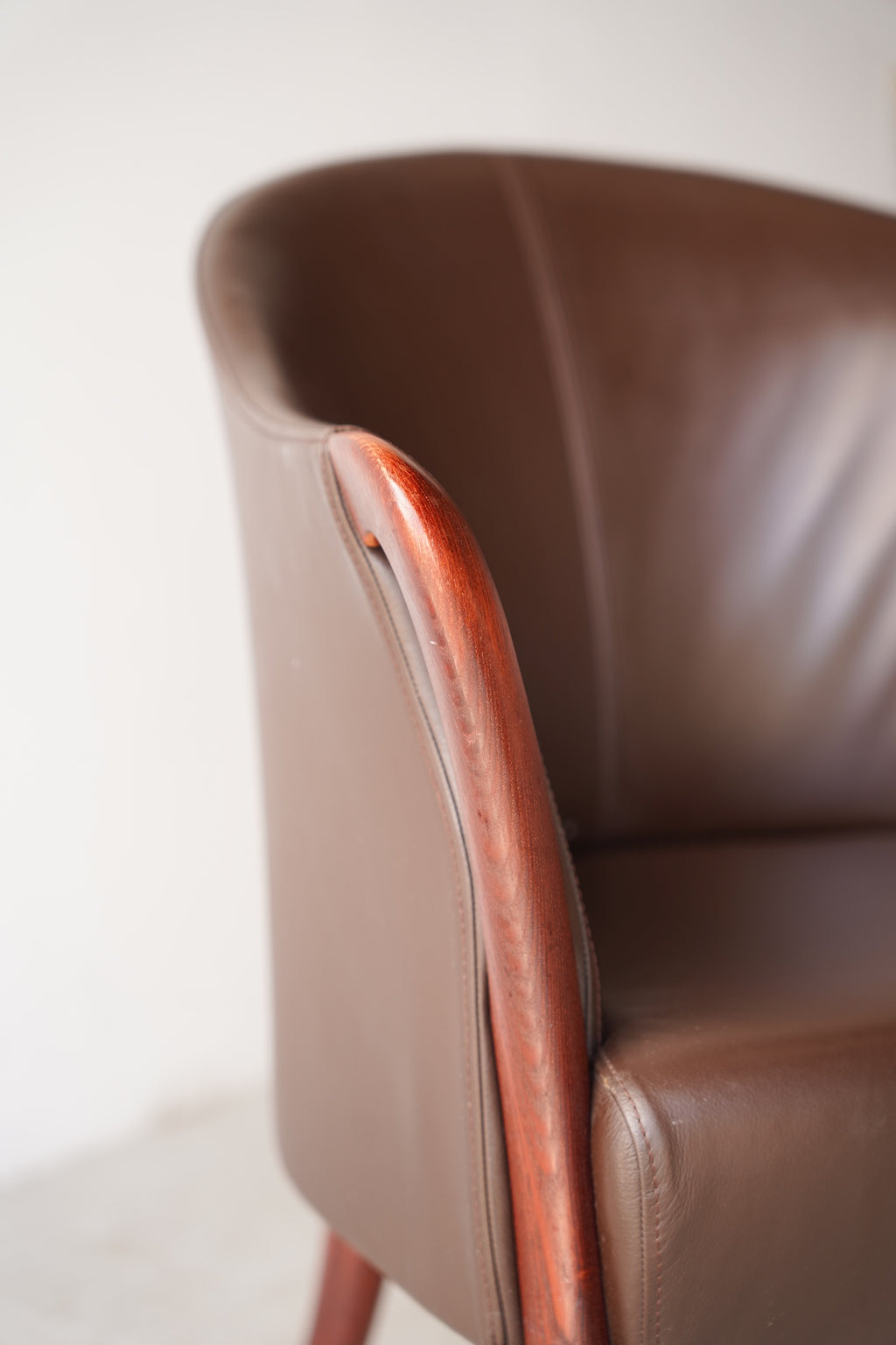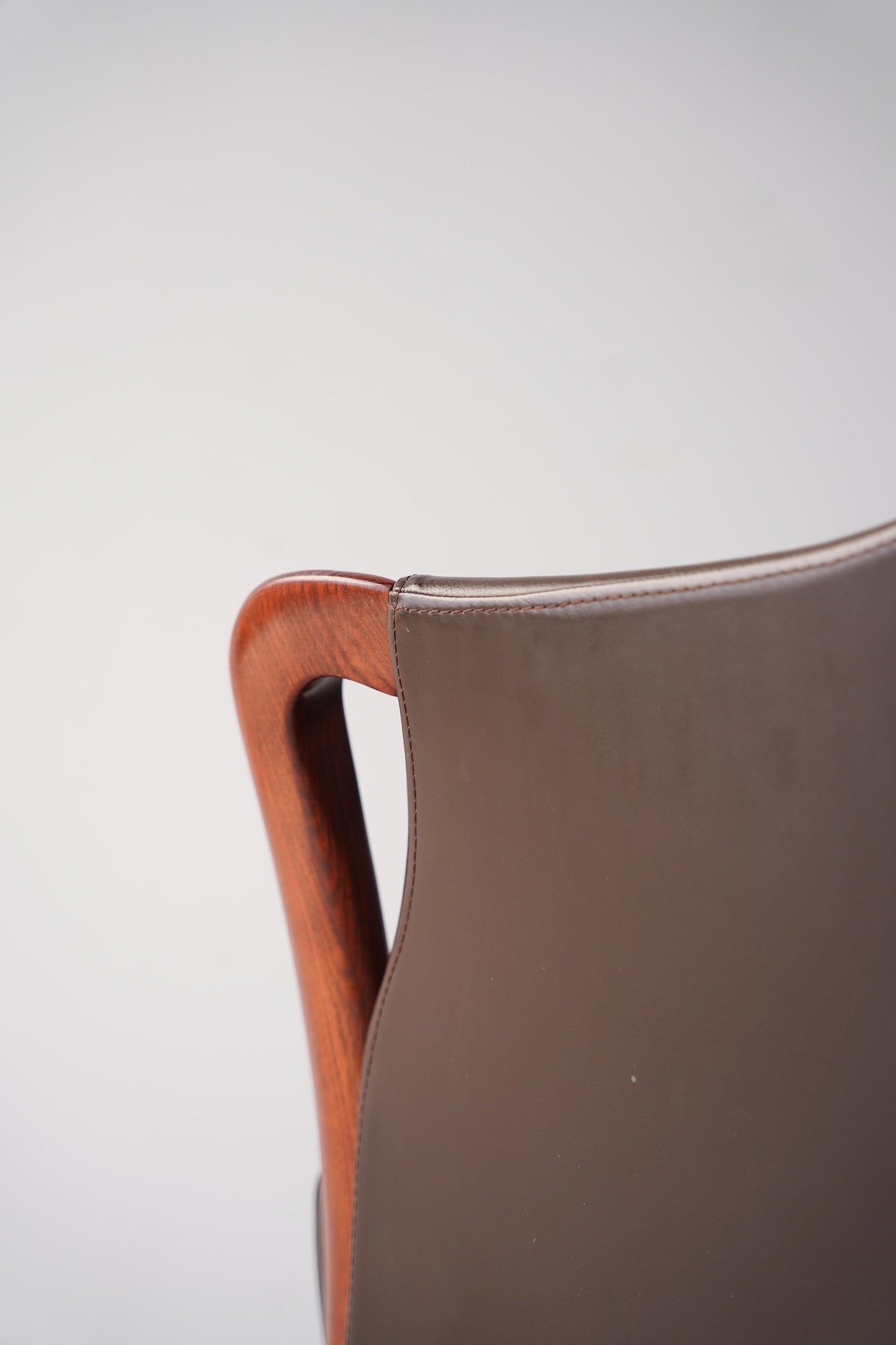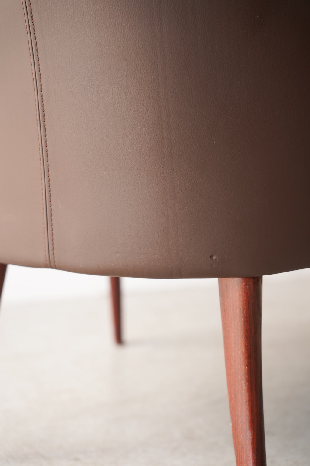 座面と背もたれには、張りのある上質なダークブラウンのレザーが張られており、時を経て得られた深い色合いと風合いが楽しめます。脚部は、本体からすっきりと伸びる、丸くテーパーしたデザインで、全体の軽快な印象を保ちつつ、安定感を確保しています。