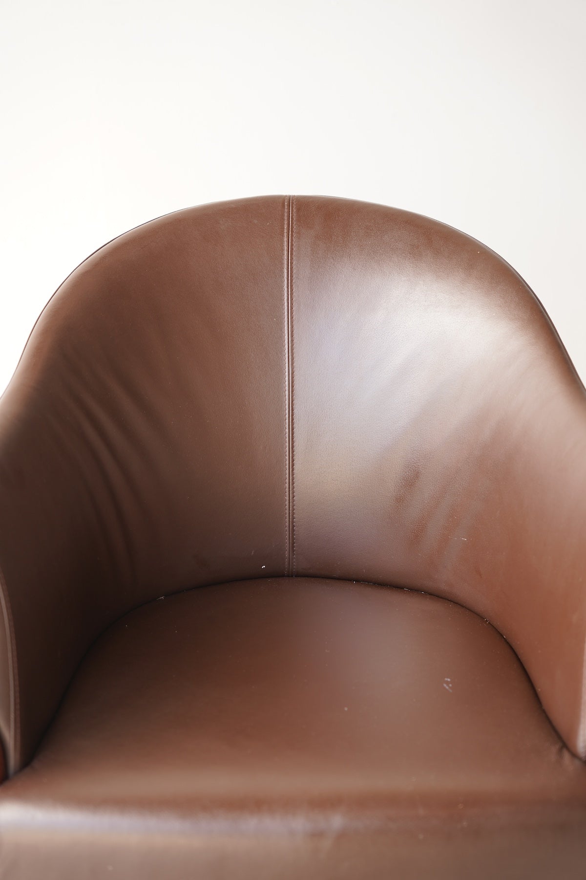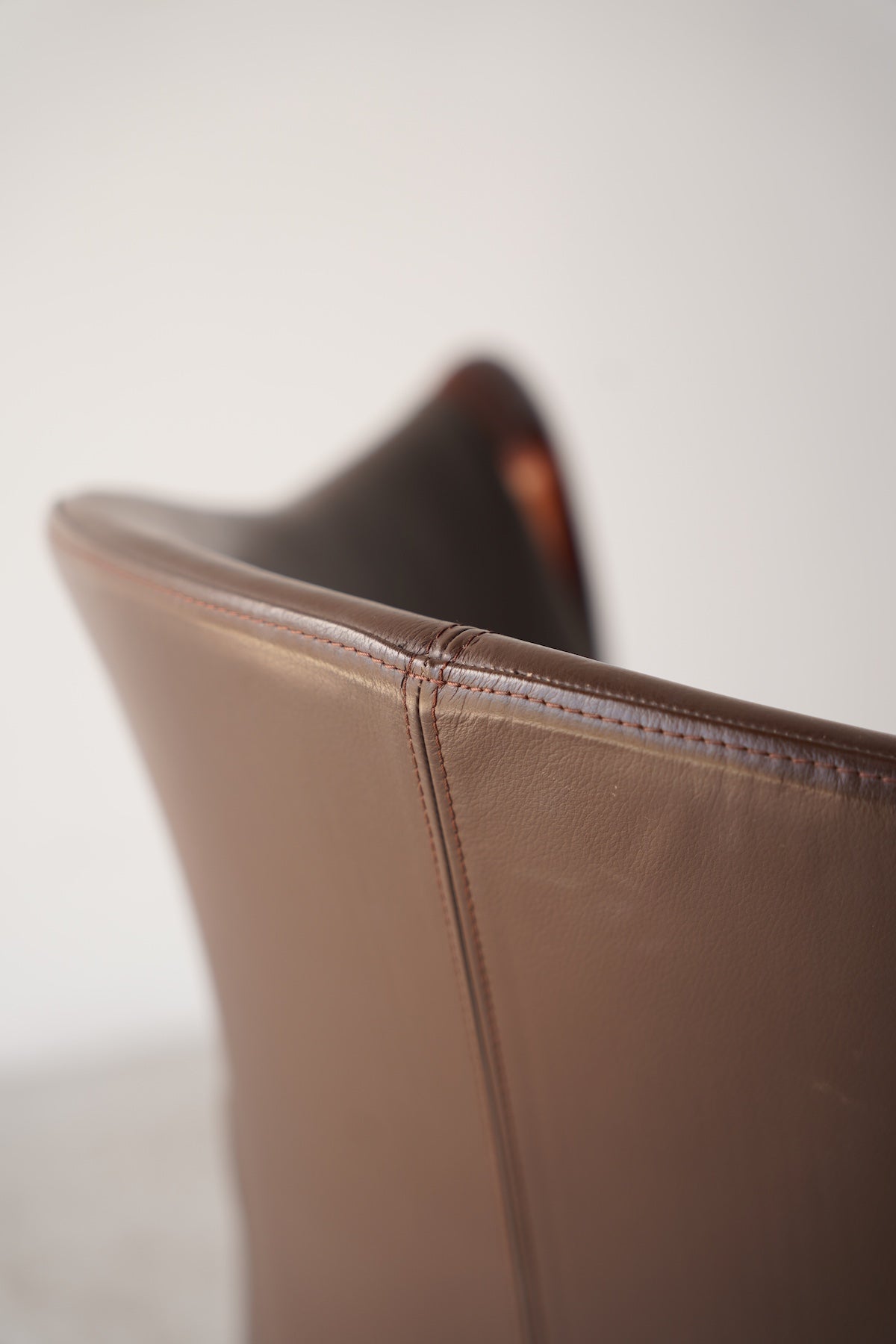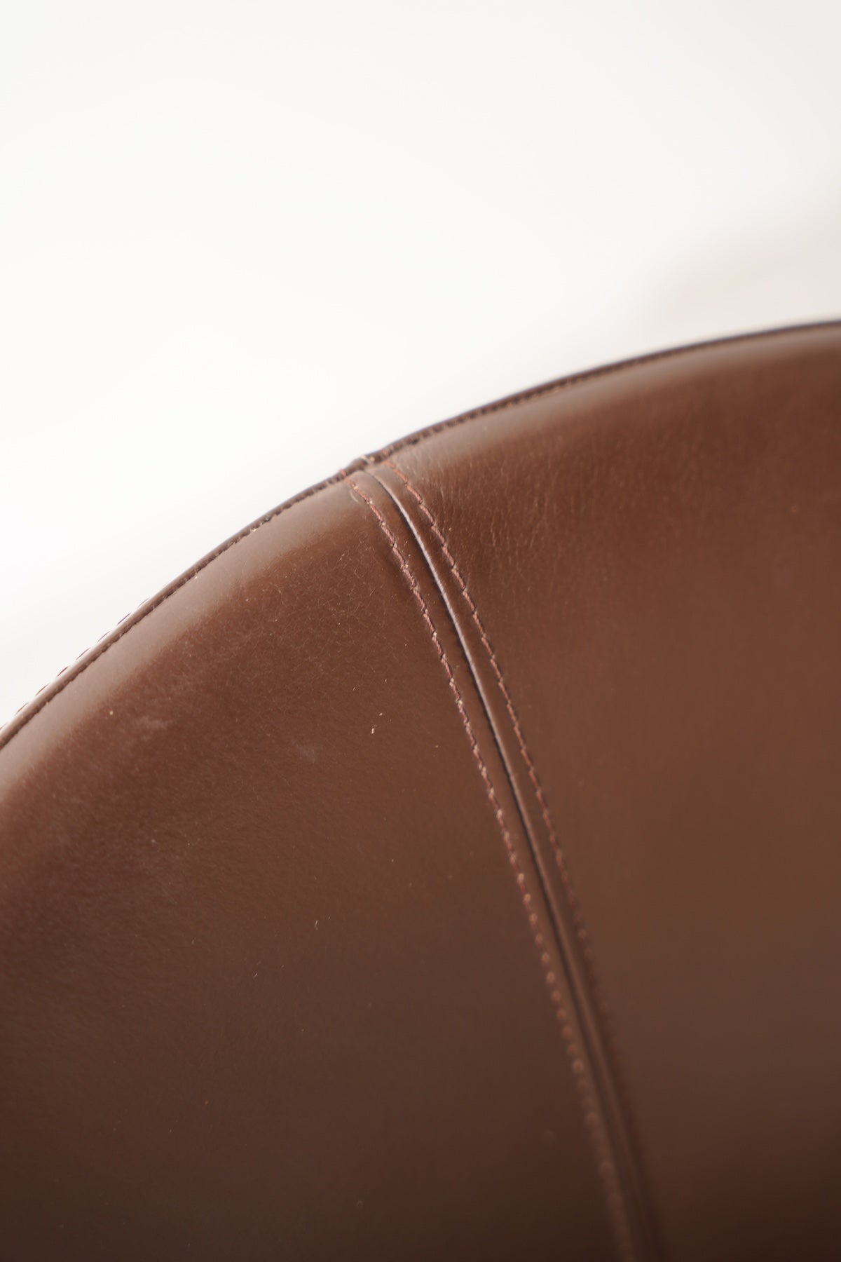 座面と背もたれには、張りのある上質なダークブラウンのレザーが張られており、時を経て得られた深い色合いと風合いが楽しめます。脚部は、本体からすっきりと伸びる、丸くテーパーしたデザインで、全体の軽快な印象を保ちつつ、安定感を確保しています。