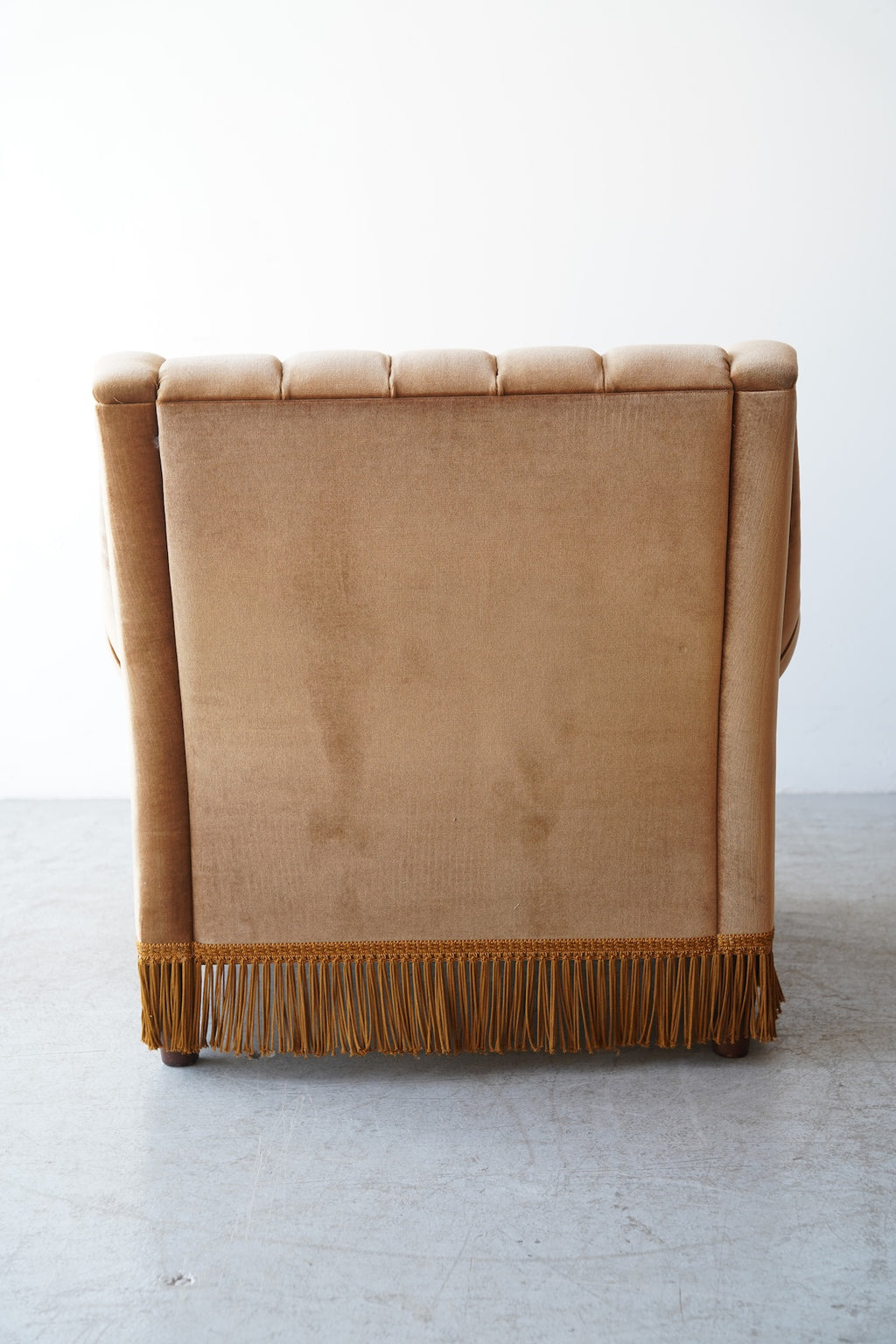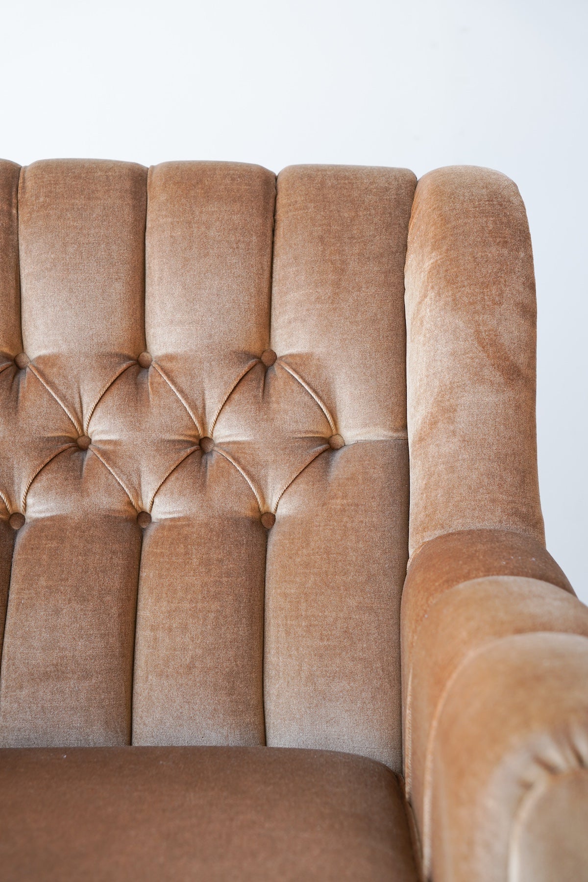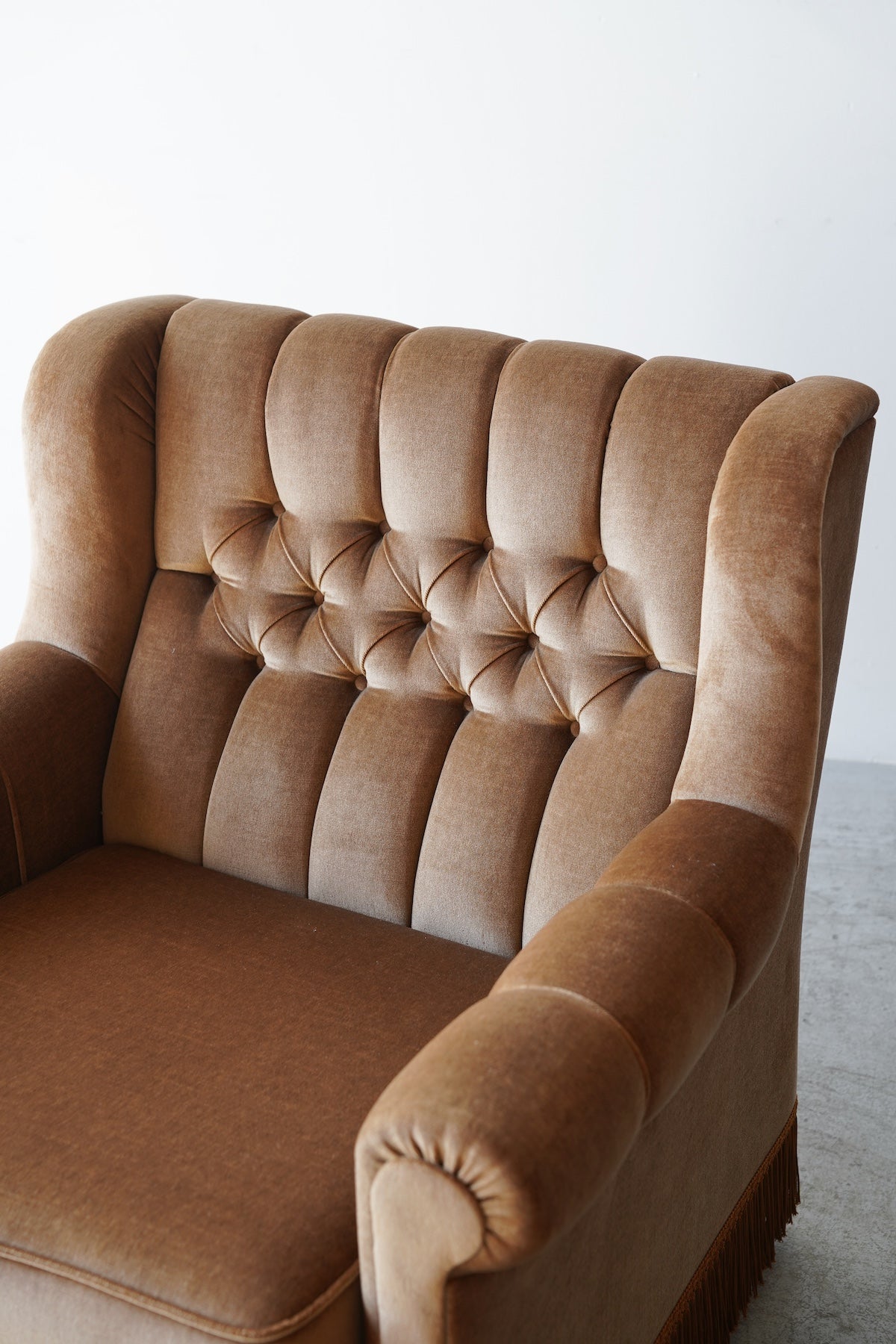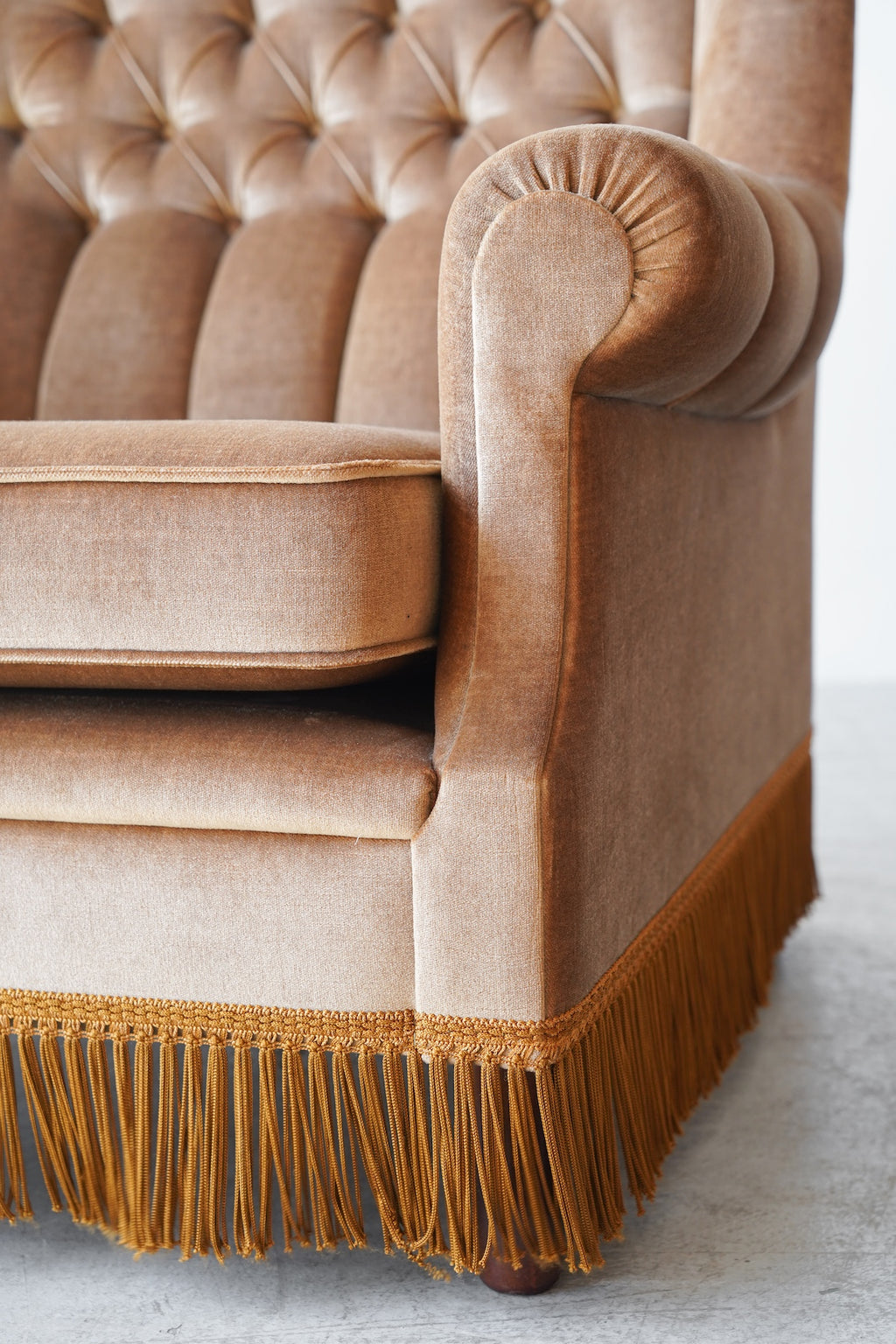 背もたれから座面にかけて丁寧に施されたボタンタフティングはダイヤモンドパターンに配置されたボタンが、生地に豊かな陰影を生み出し、クラシックな雰囲気を一層引き立てます。この細やかな手仕事は、デザイン性だけでなく、座り心地の面でも身体を包み込むような安定感をもたらします。
