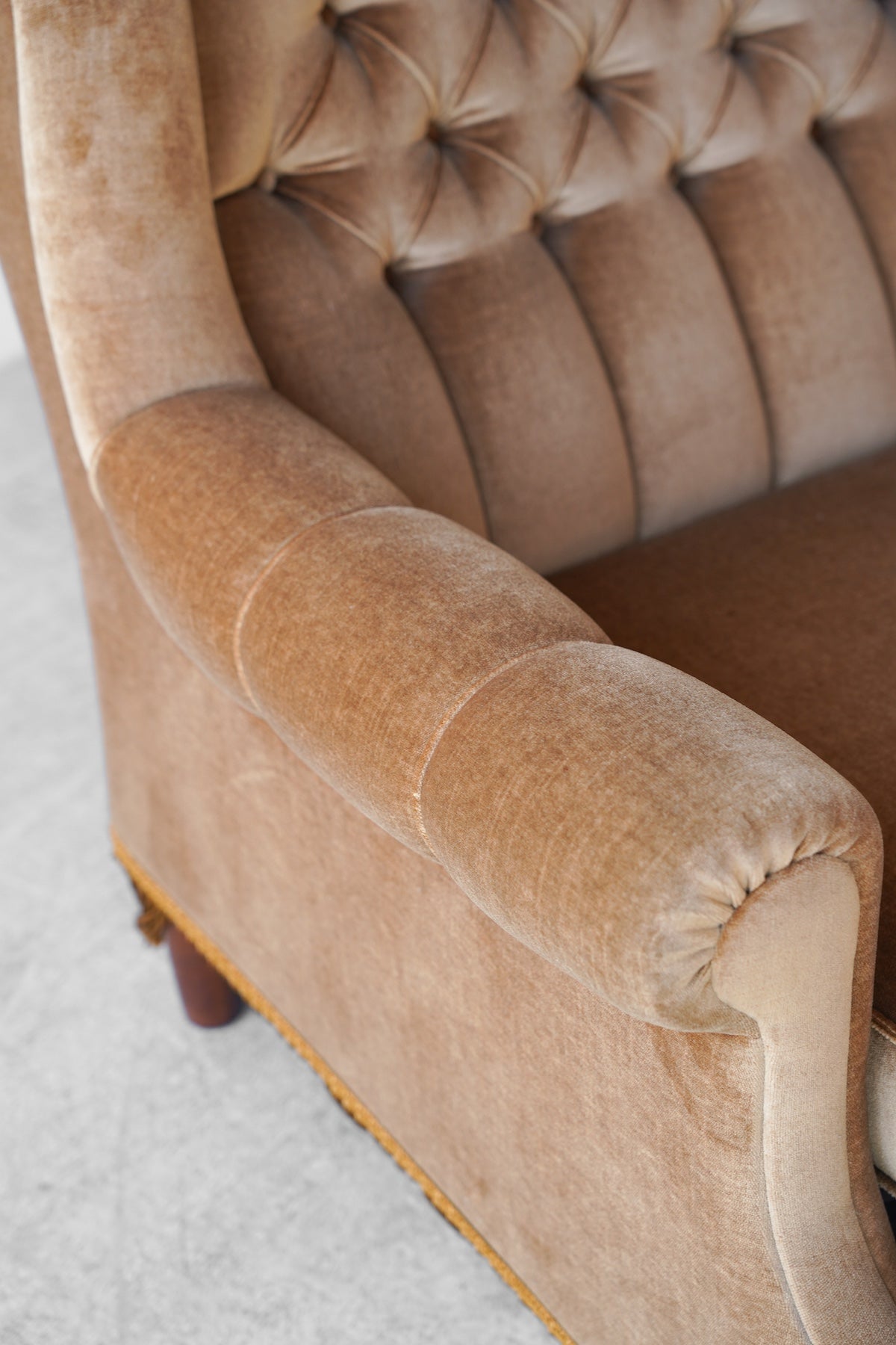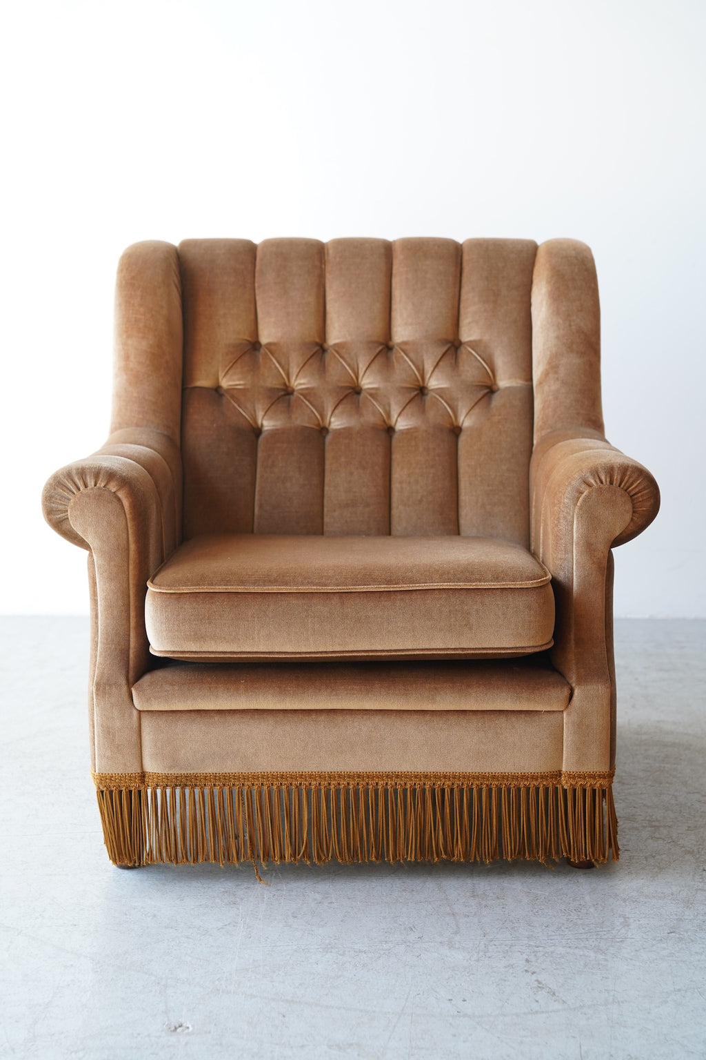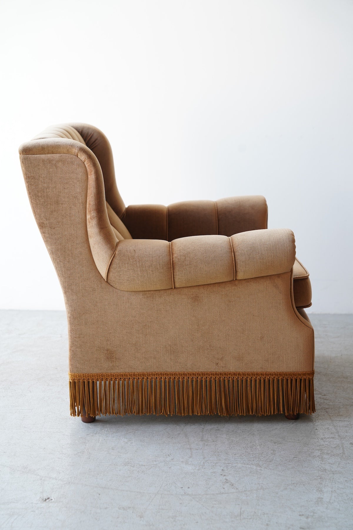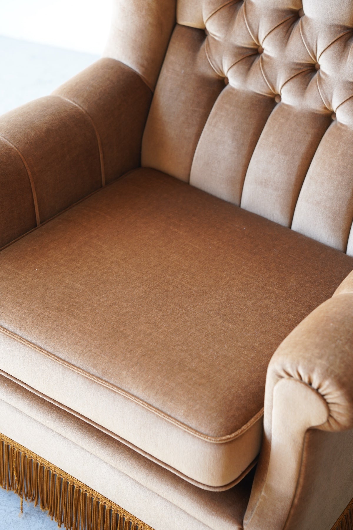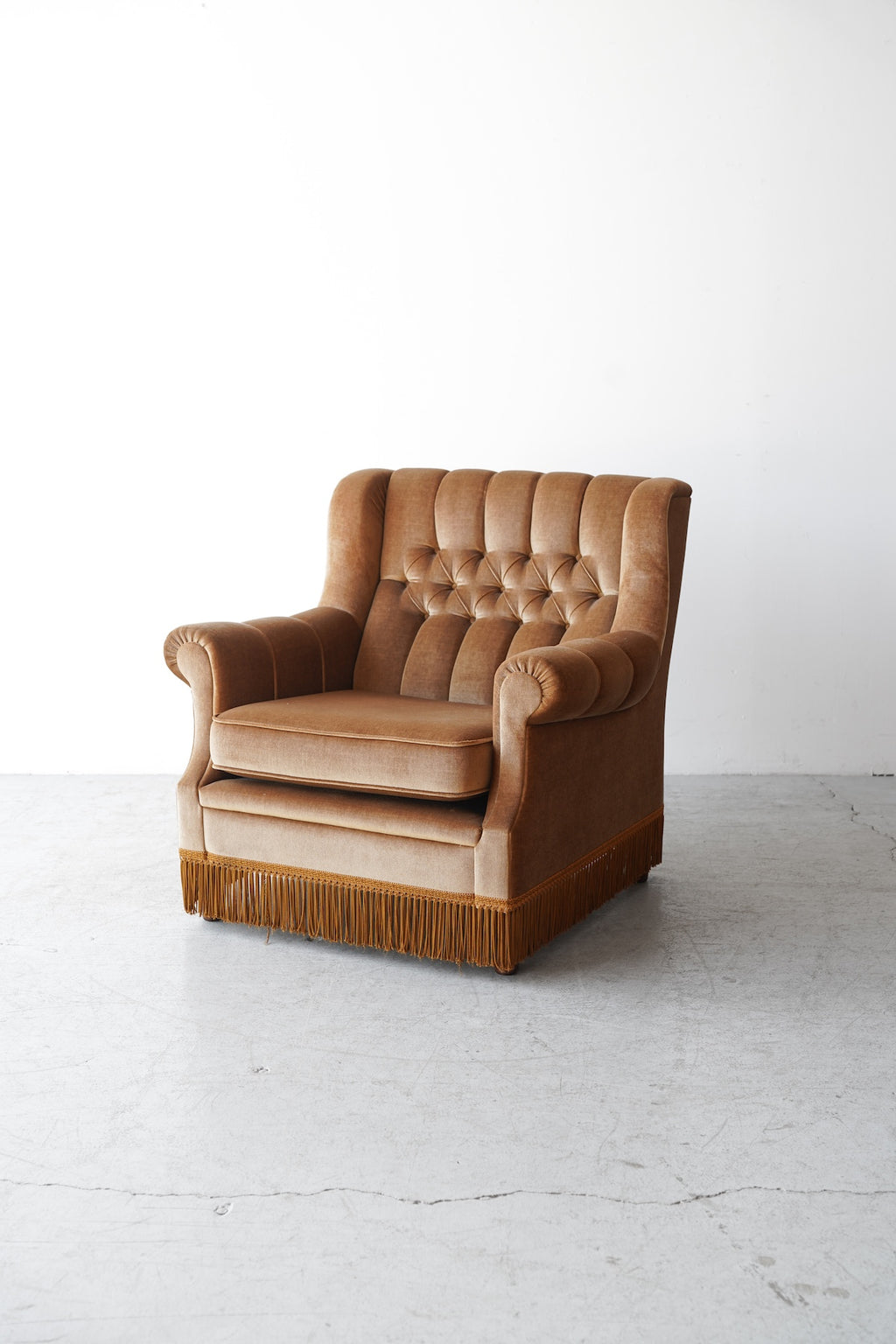 背もたれから座面にかけて丁寧に施されたボタンタフティングはダイヤモンドパターンに配置されたボタンが、生地に豊かな陰影を生み出し、クラシックな雰囲気を一層引き立てます。この細やかな手仕事は、デザイン性だけでなく、座り心地の面でも身体を包み込むような安定感をもたらします。