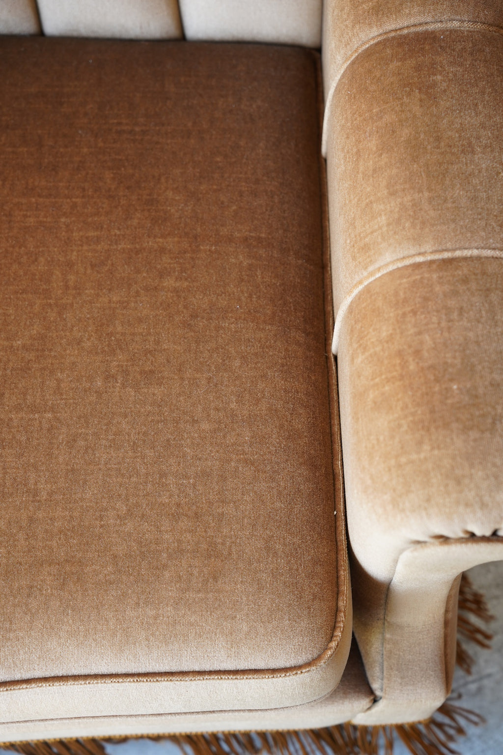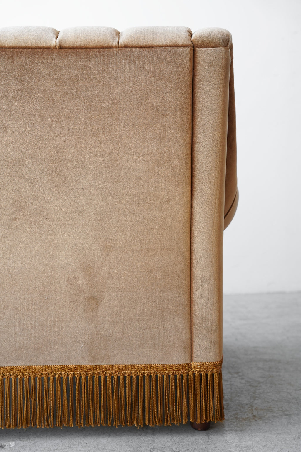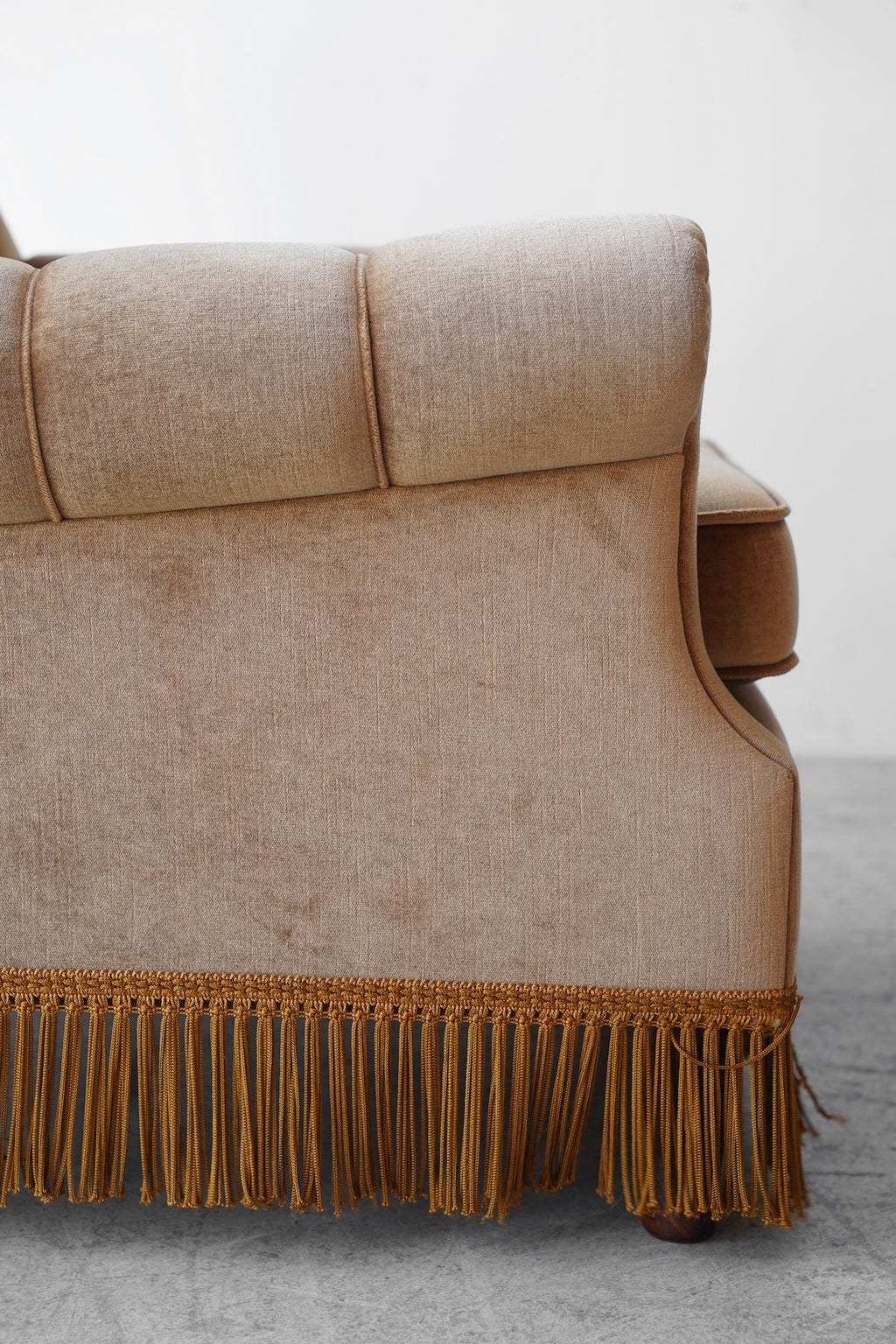 裾を彩るフリンジですは風に揺れるたび、光を受けてきらめくフリンジが、このソファに動きと軽やかさを加えます。この遊び心のあるアクセントが、重厚な印象になりがちなベルベットソファに、程よい抜け感をもたらしています。