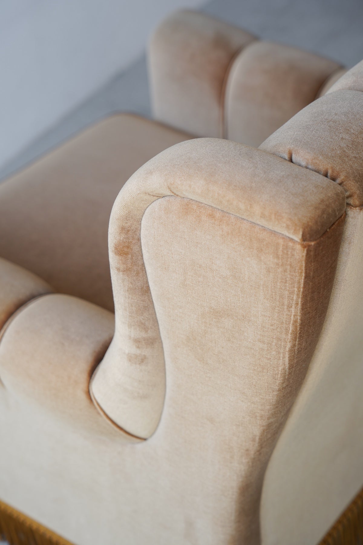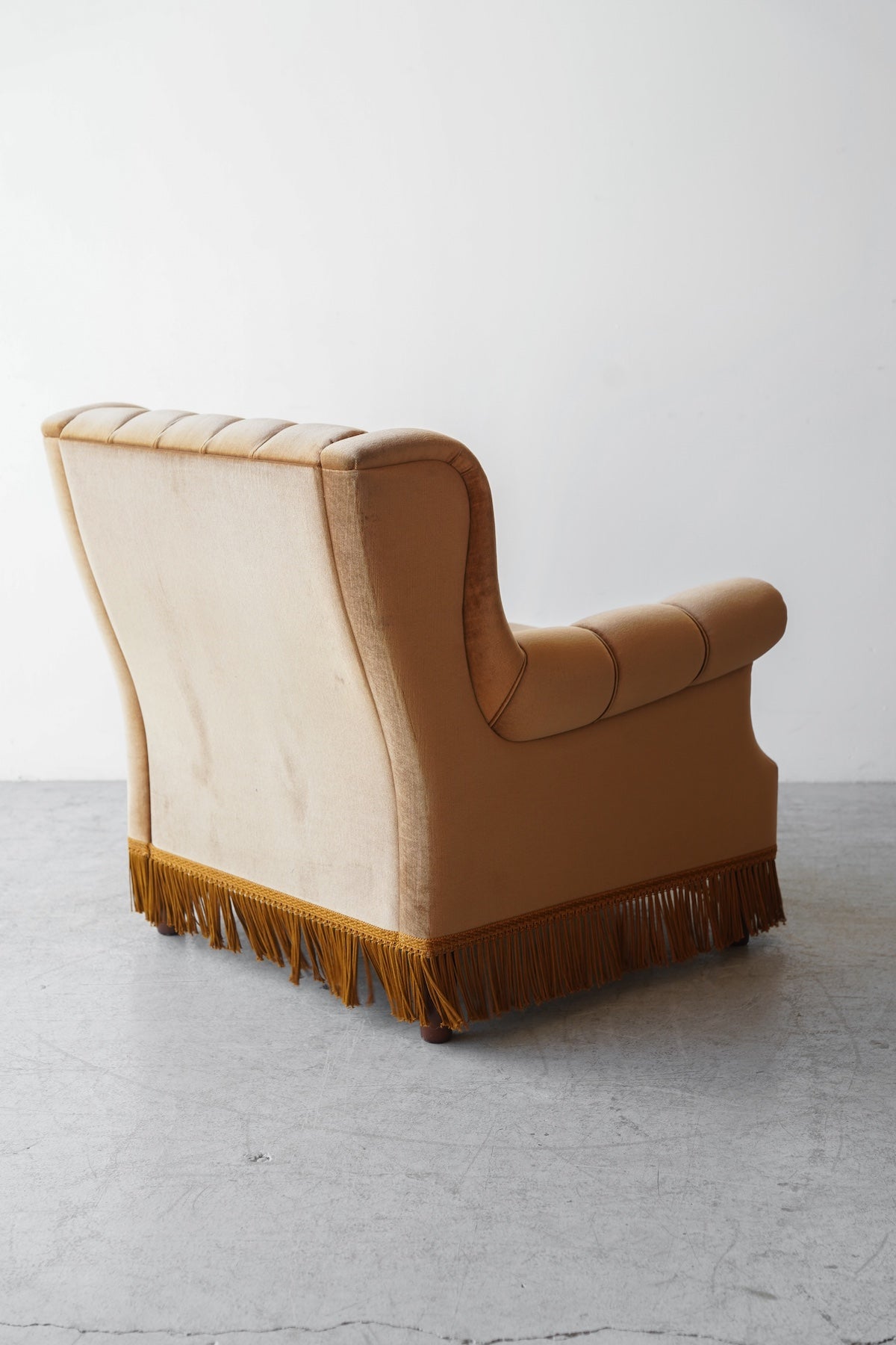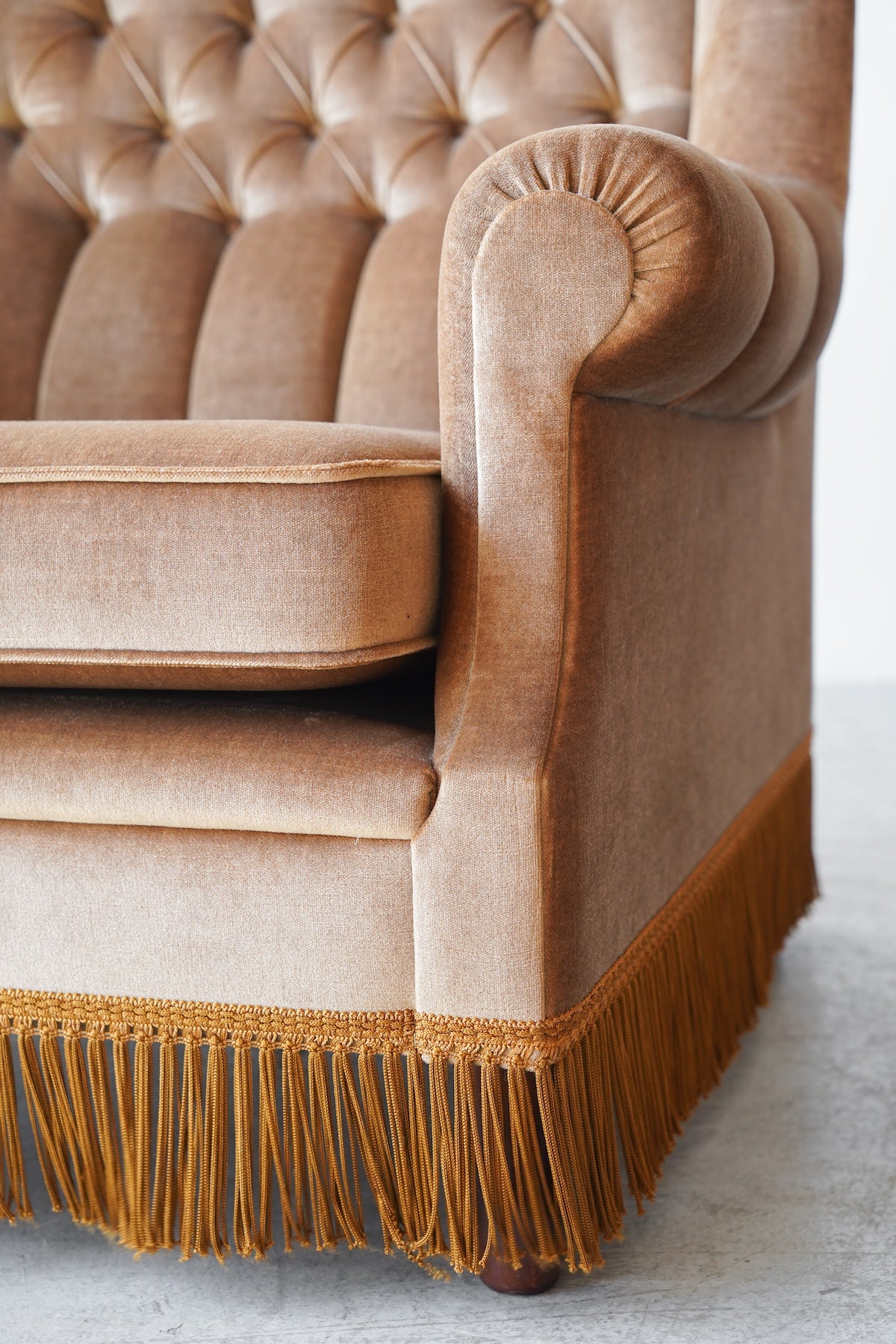 裾を彩るフリンジですは風に揺れるたび、光を受けてきらめくフリンジが、このソファに動きと軽やかさを加えます。この遊び心のあるアクセントが、重厚な印象になりがちなベルベットソファに、程よい抜け感をもたらしています。