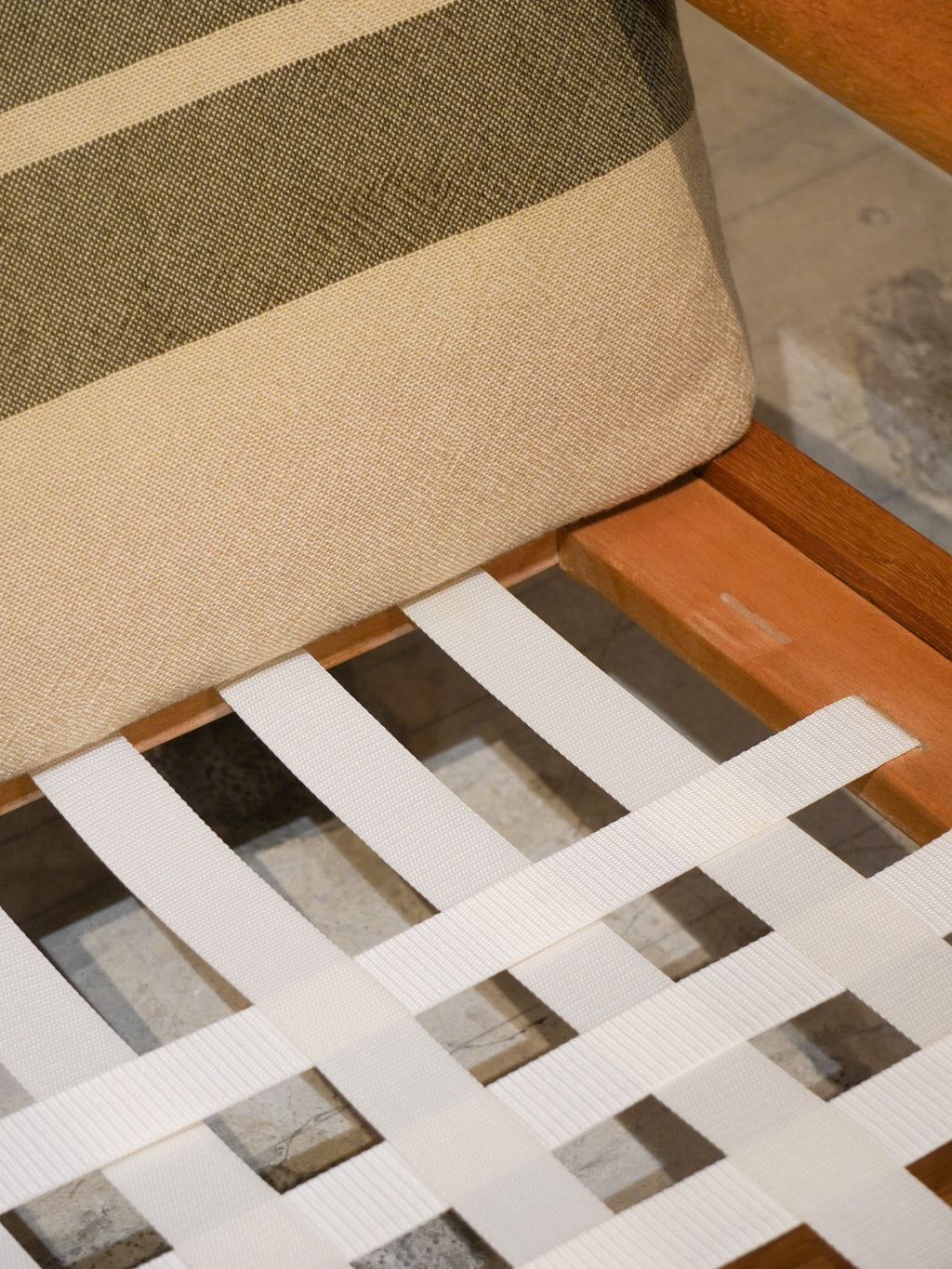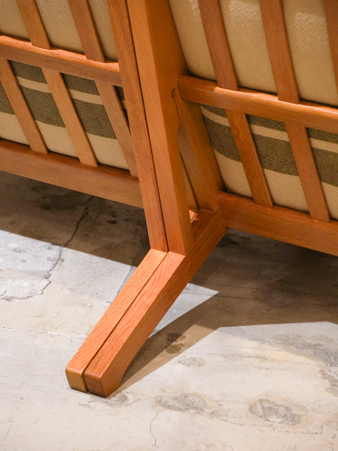 張地はオリジナルのままクラシックながらも現代の空間にすっと溶け込む仕上がりです。デンマークの生地を使用した張り替えも行なっております。ご希望の方はお気軽にお問い合わせください。