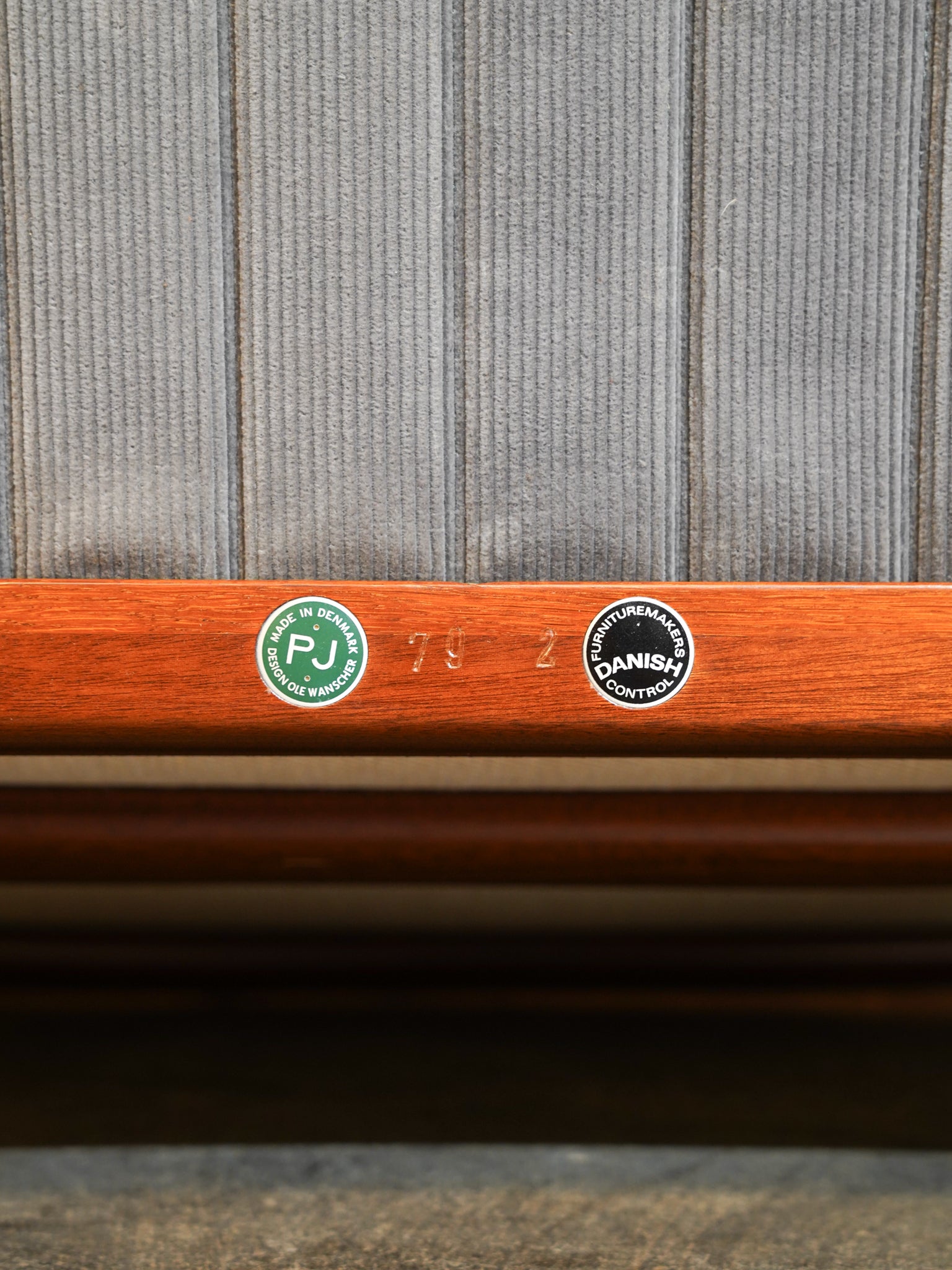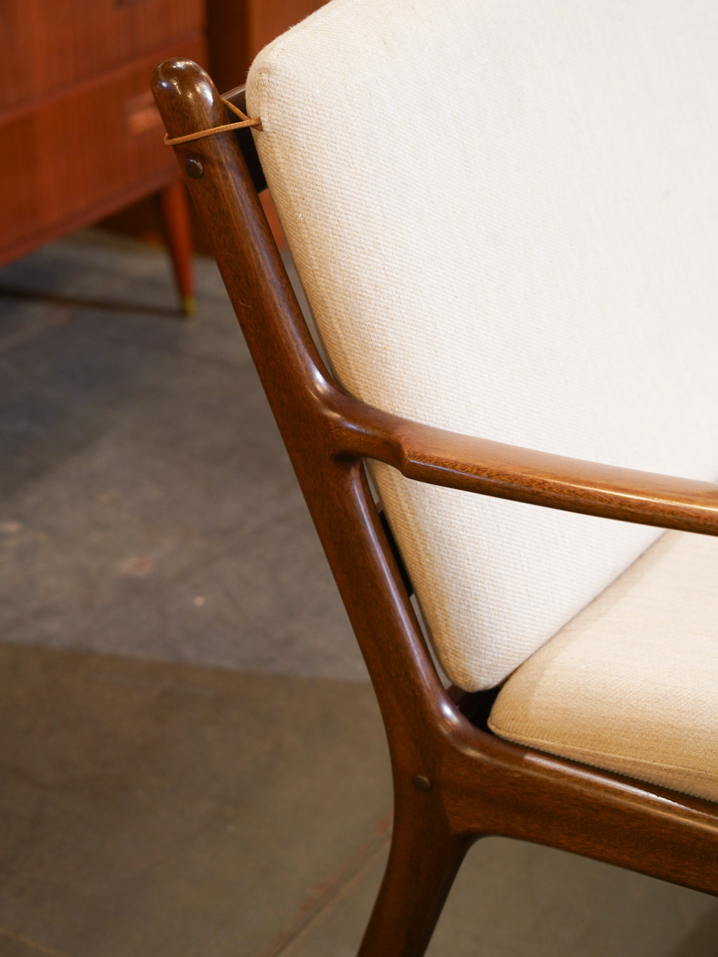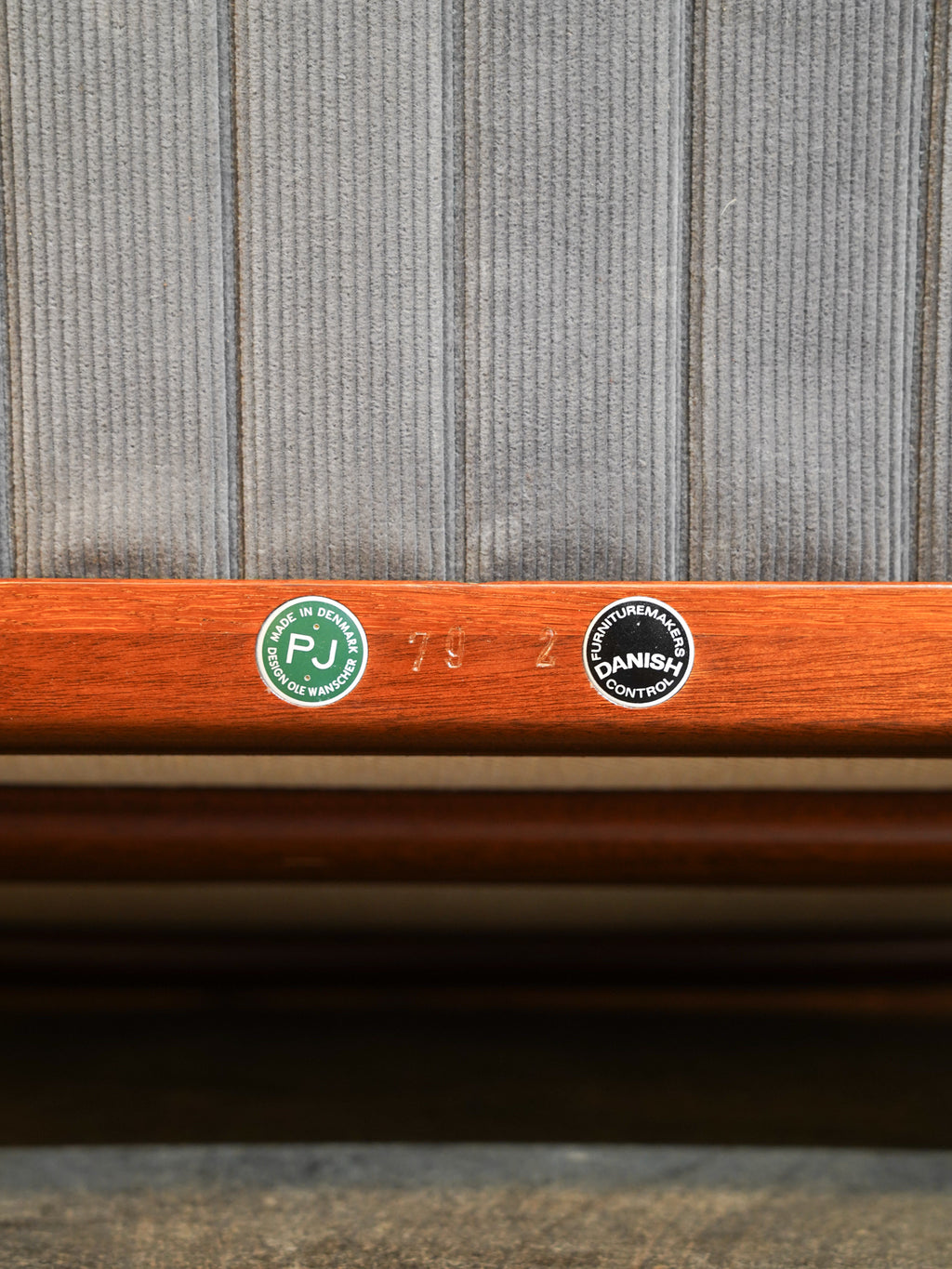 座面と背もたれは身体を優しく受け止める絶妙な角度で設計されており、安らぎに満ちた座り心地を実現しています。フレームには、厳しい品質管理をパスした証である「DANISH CONTROL」のラベルが残り、当時のデンマーク家具工芸の極めて高い水準を証明しています。
