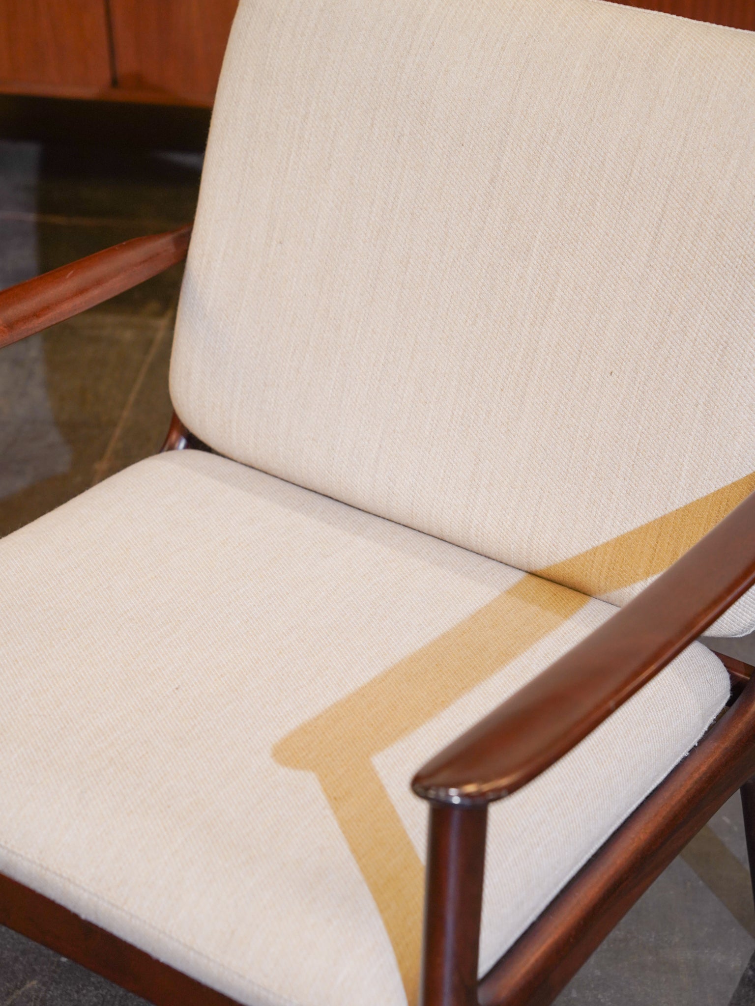 座面と背もたれは身体を優しく受け止める絶妙な角度で設計されており、安らぎに満ちた座り心地を実現しています。フレームには、厳しい品質管理をパスした証である「DANISH CONTROL」のラベルが残り、当時のデンマーク家具工芸の極めて高い水準を証明しています。