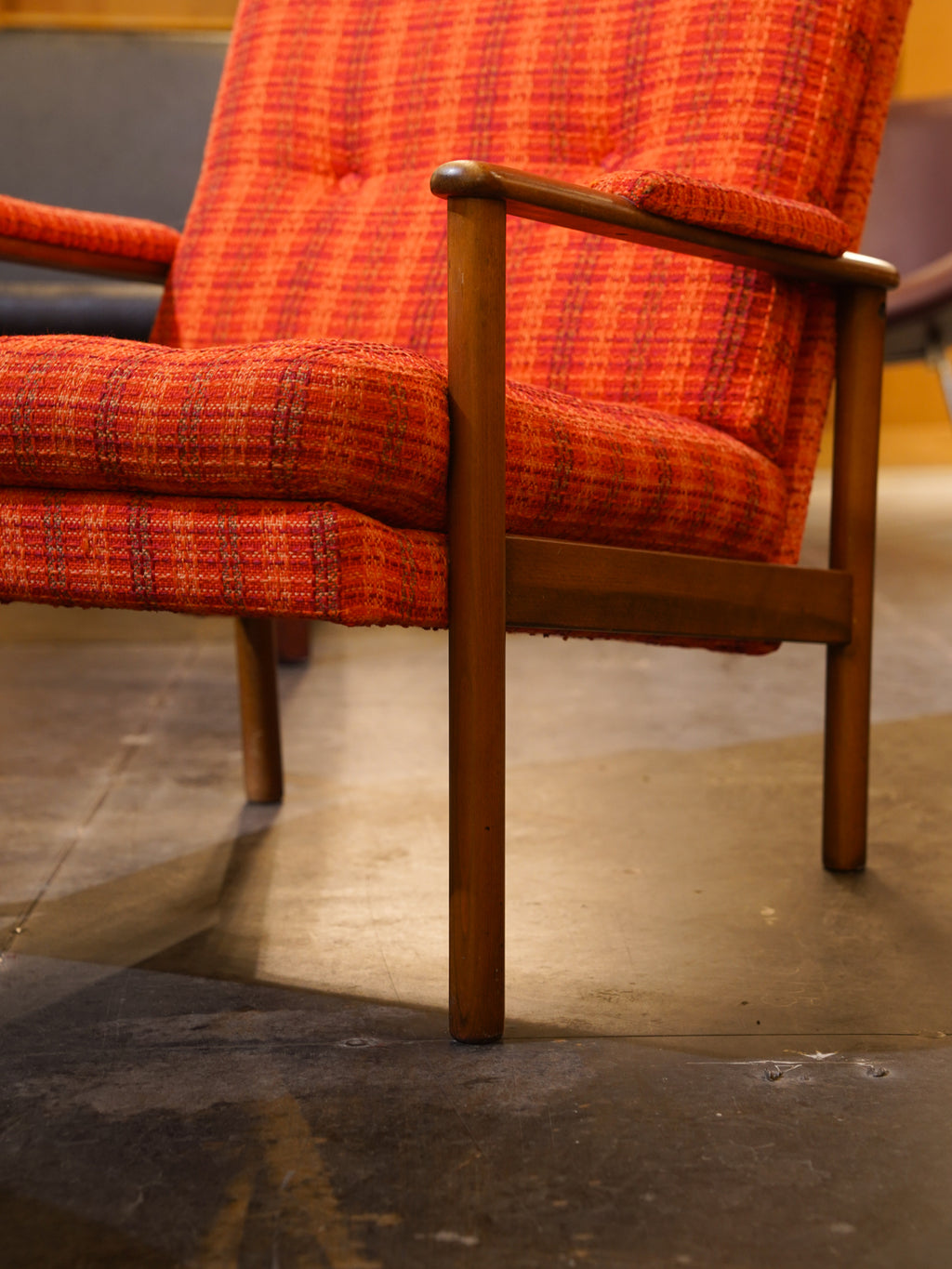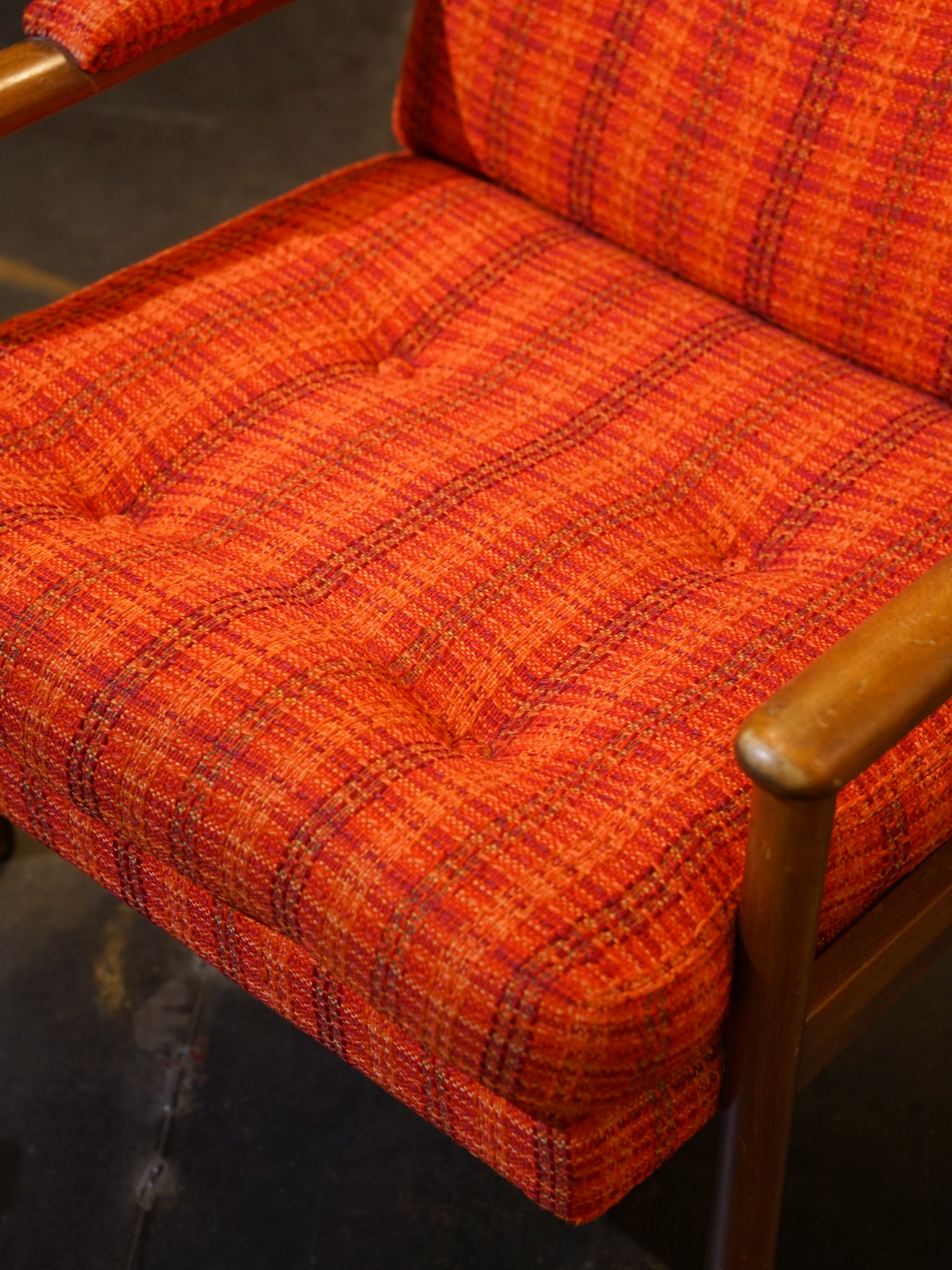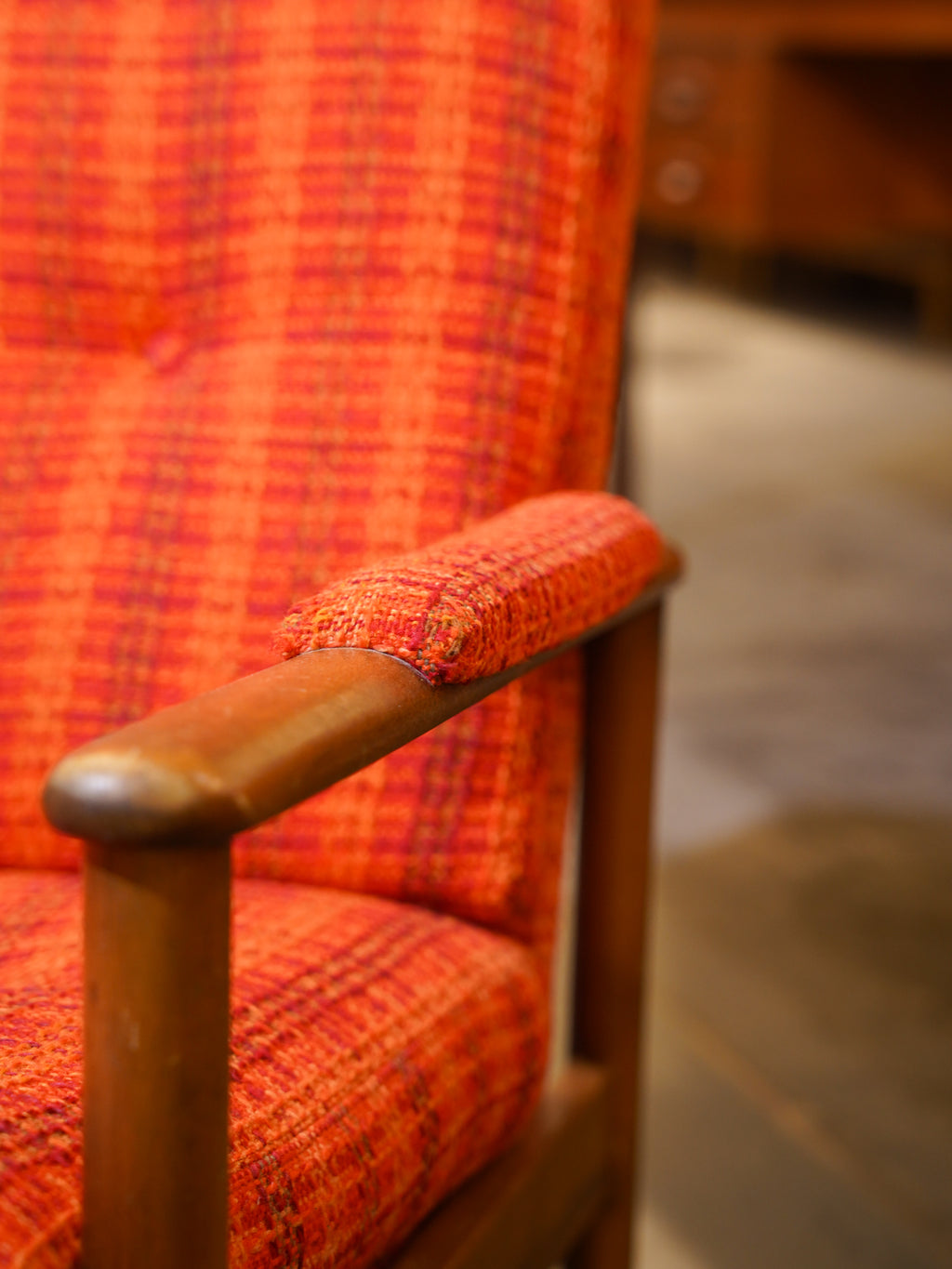 温かみのある木製フレームは、使い込むほどに味わいが増すヴィンテージならではの質感。アーム部分にも共布のパッドがあしらわれており、腕を置いた時の肌当たりも柔らかく、細部まで使い手への思いやりが感じられます。