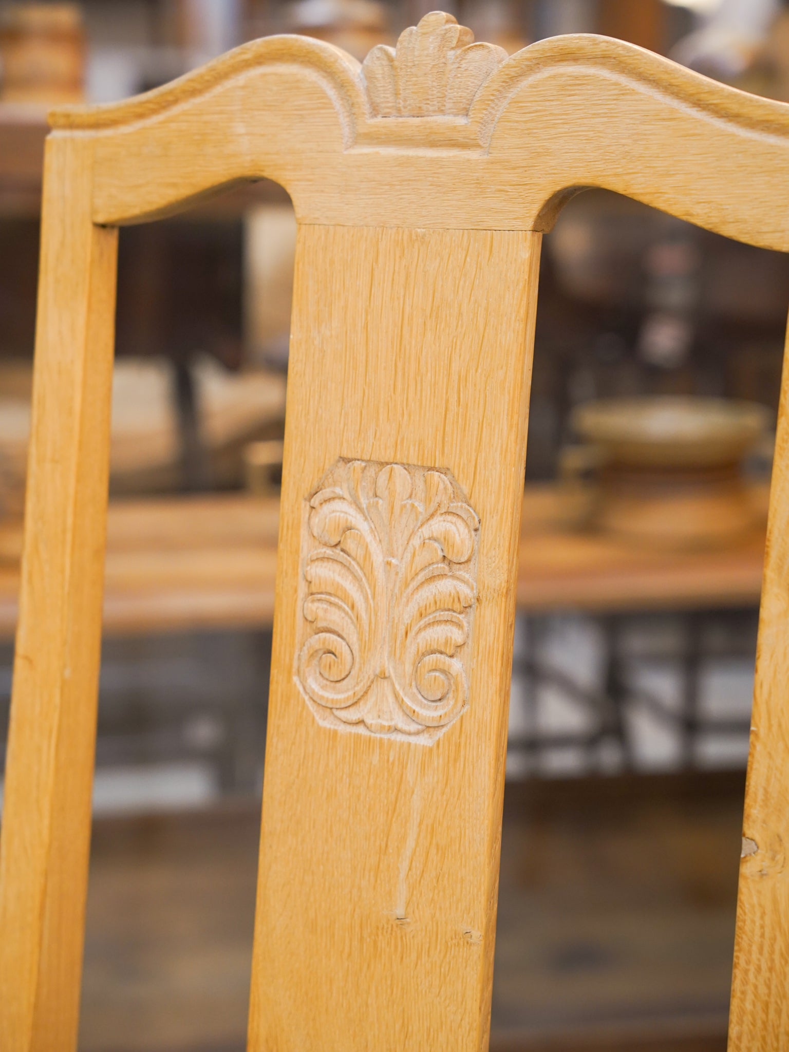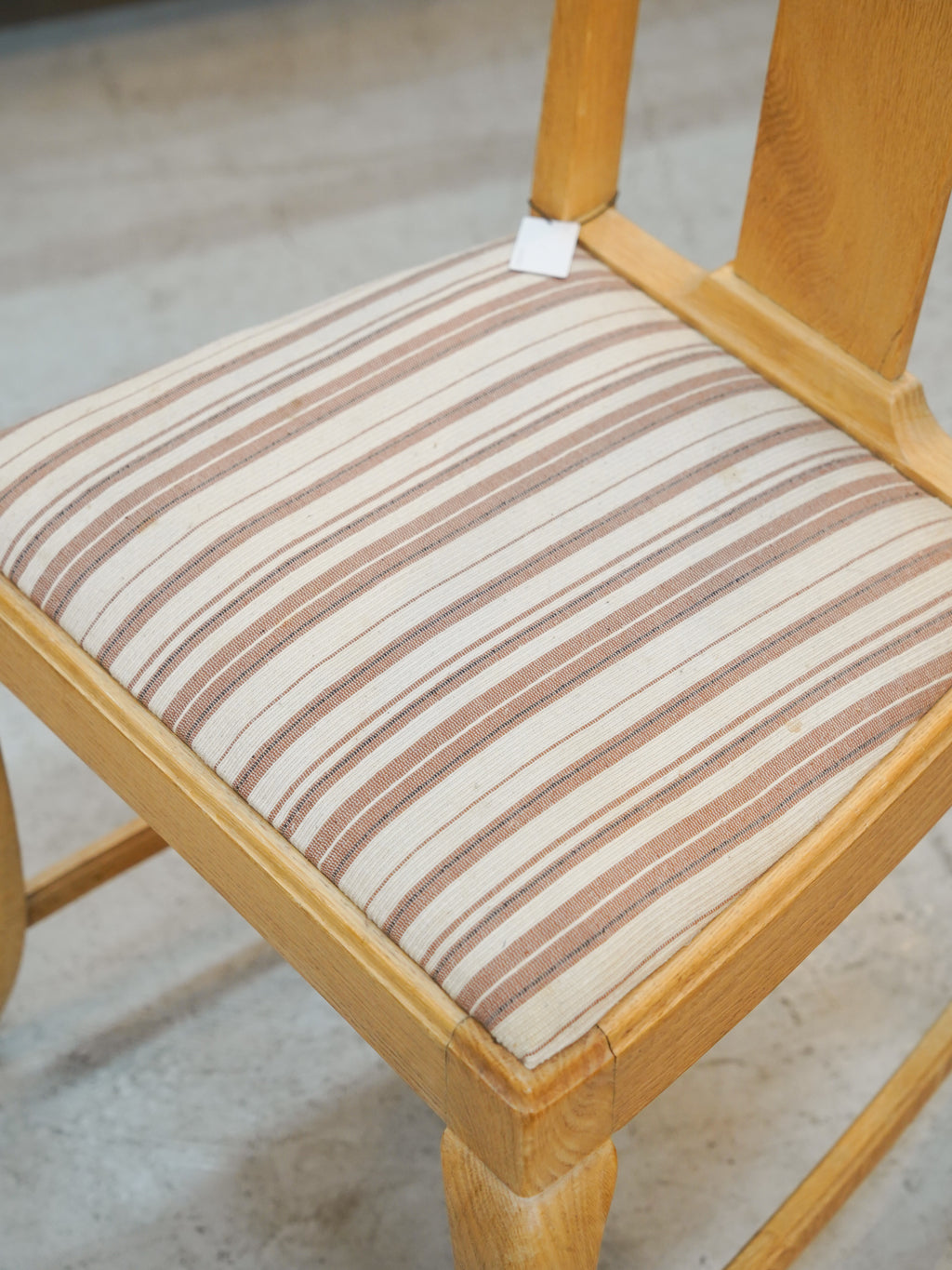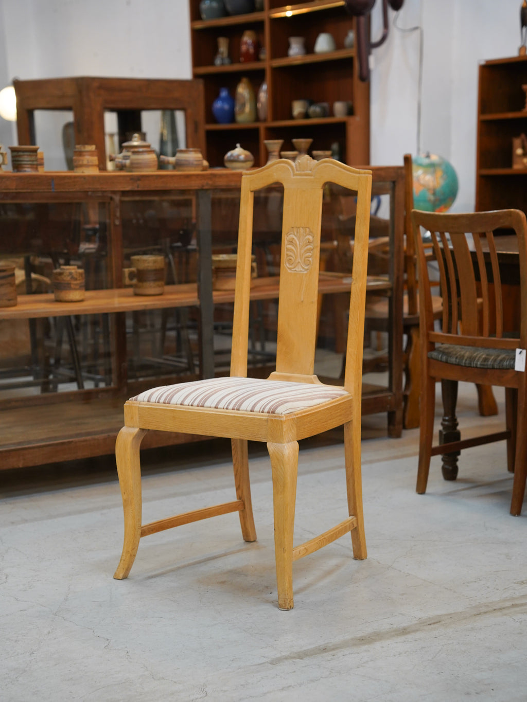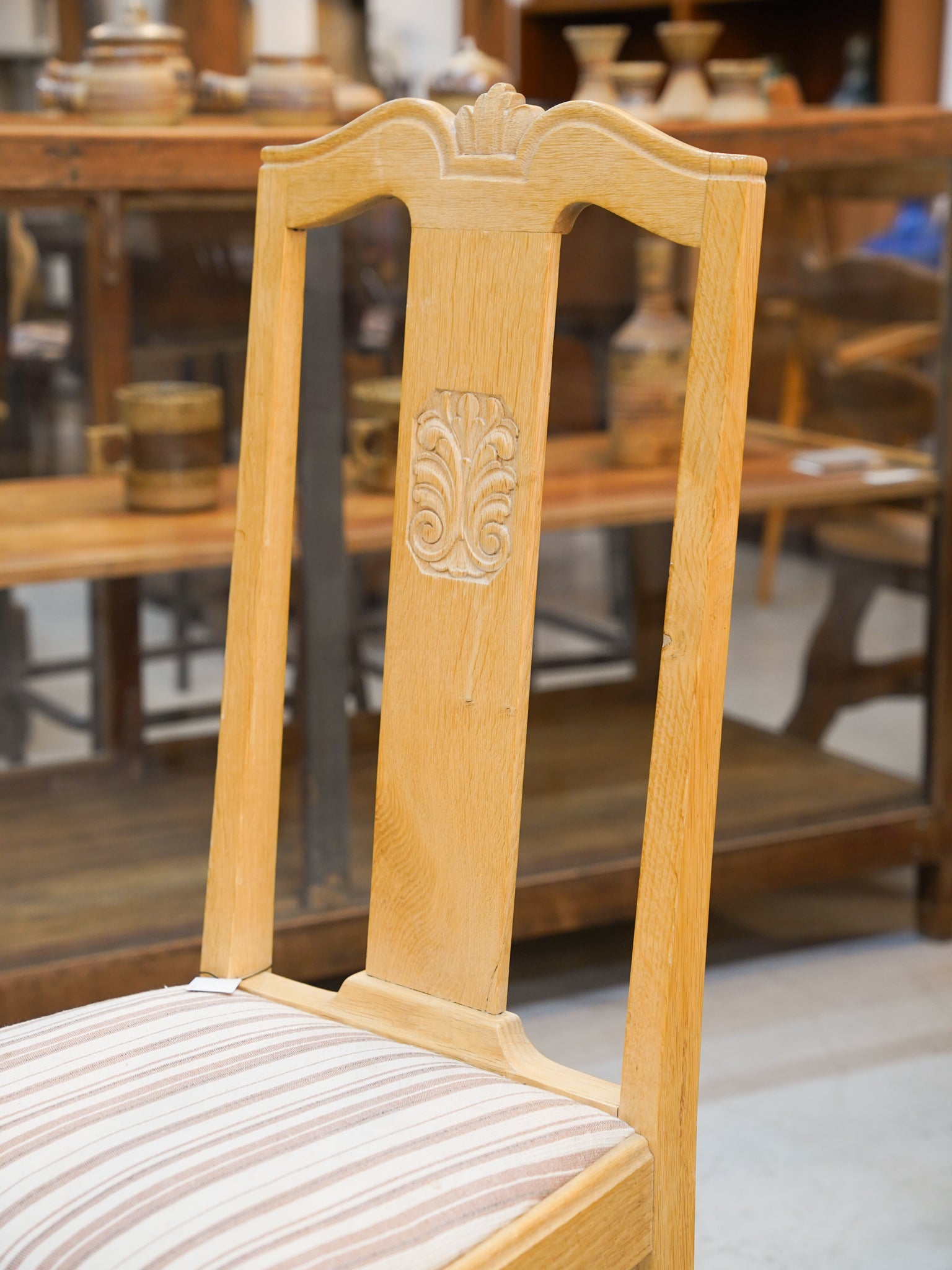 最大の特徴は、背筋をすっと伸ばしてくれる高めの背もたれと、そこに刻まれた緻密なレリーフです。ストライプ柄のファブリックを配した座面は、清潔感があり、北欧風の明るいインテリアからナチュラルなカントリースタイルまで幅広く調和します。