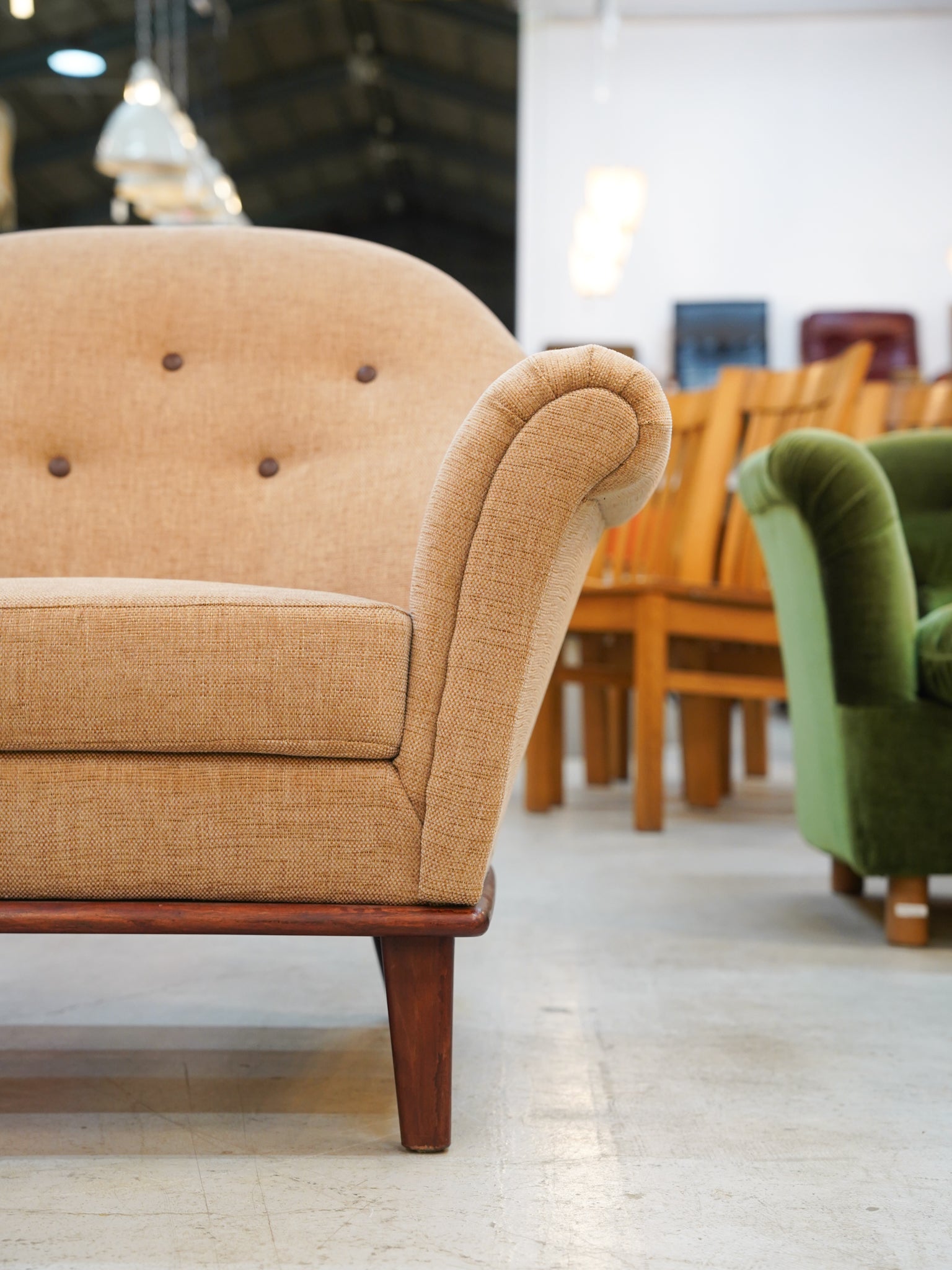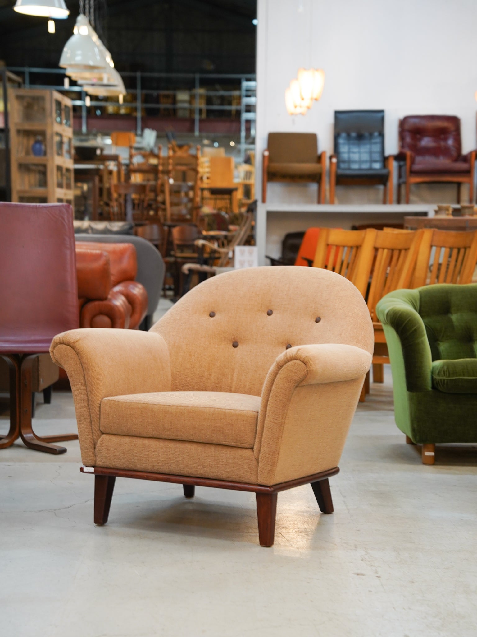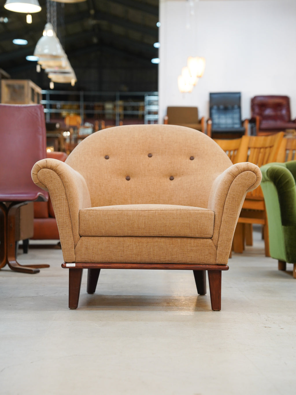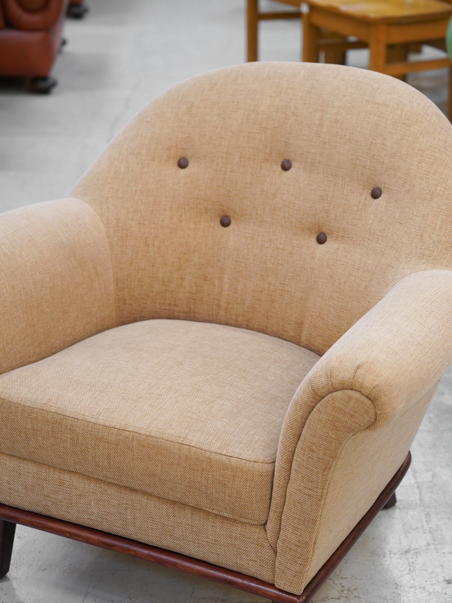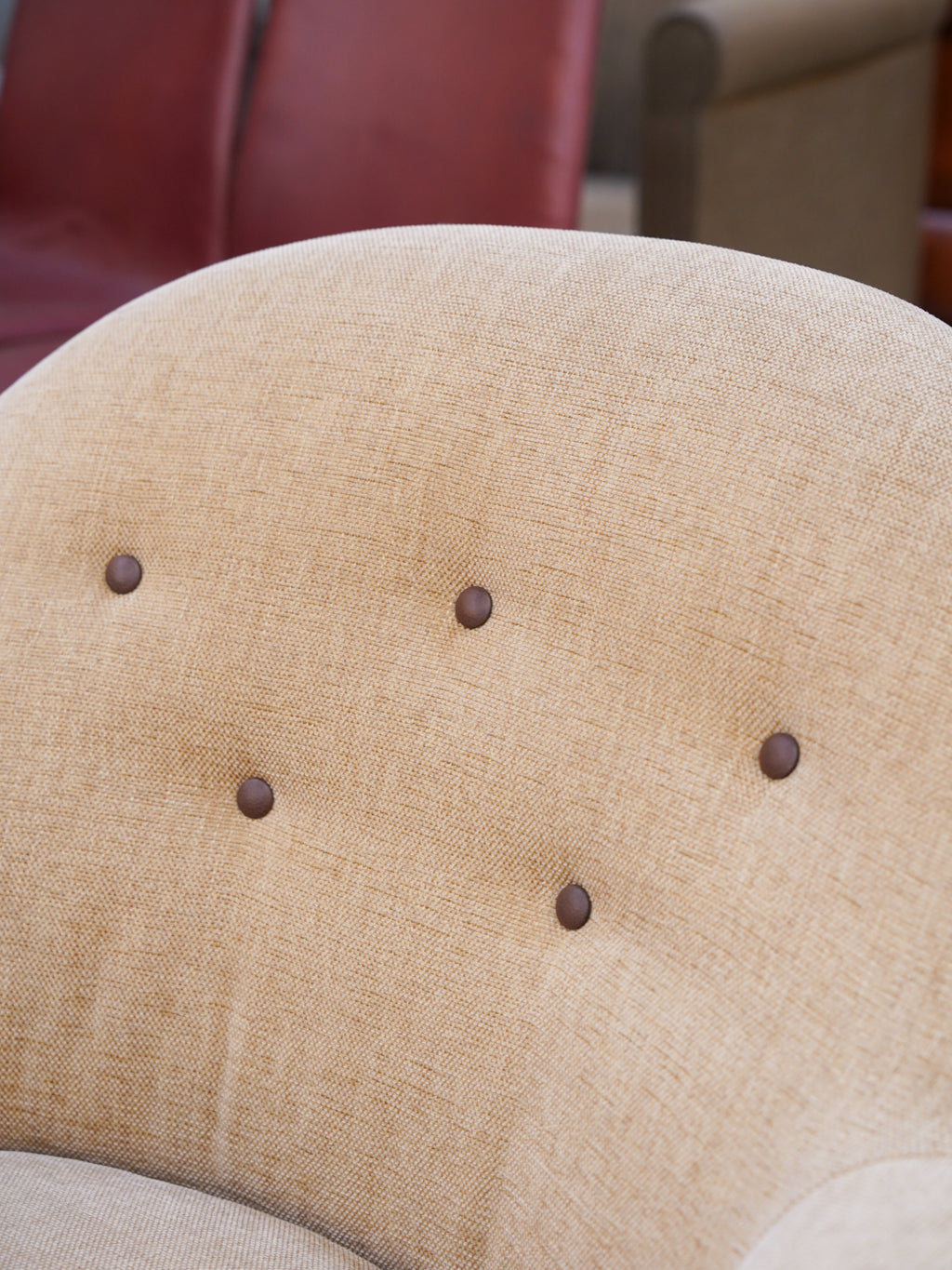丸みを帯びた独創的なフォルムと、温かみのあるベージュカラーのファブリックが調和したこの一脚は、置くだけで空間を柔らかな空気感で満たしてくれます。最大の特徴は、背もたれにリズムよく配置された5つのボタン留めです。このクラシカルなディテールが、ミッドセンチュリー期特有の愛らしさと、丁寧な手仕事を感じさせる上質なアクセントになっています。