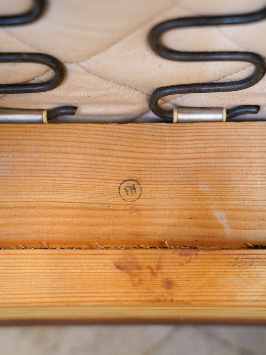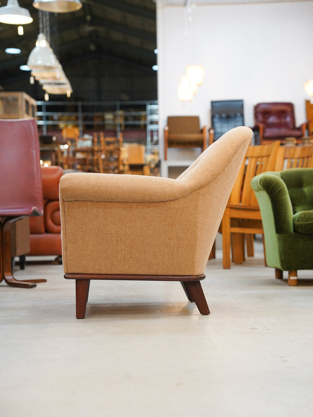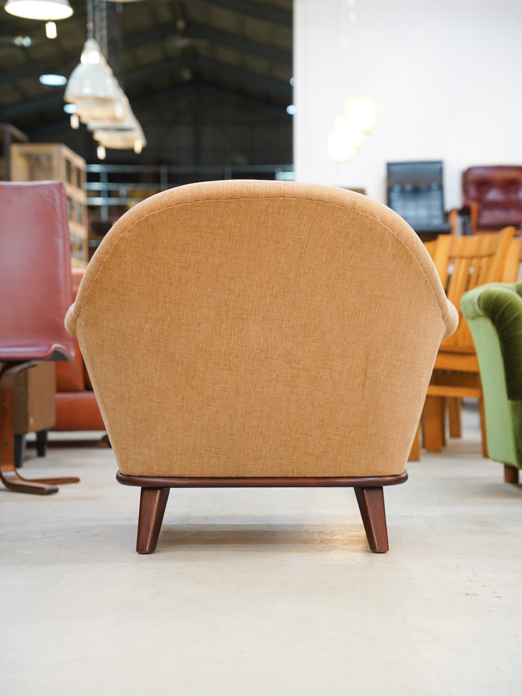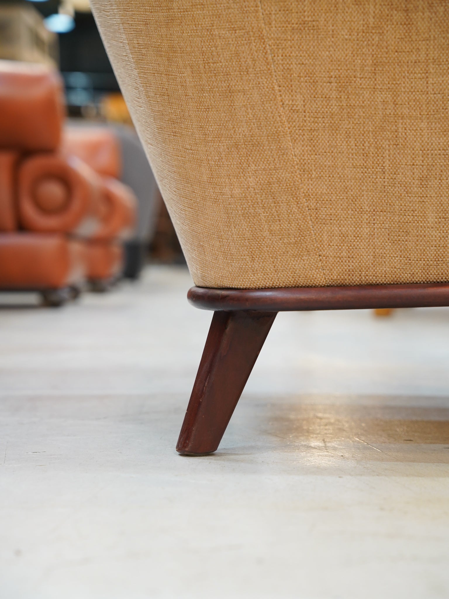 座り心地にも細やかな配慮が息づいています。緩やかに外側へと広がるアームは、腕を自然な位置で支え、深く設計された座面は体を優しく包み込むような安心感を与えてくれます。また、全体を引き締めるのは、深みのある色合いが美しいウッドフレーム。ハの字に開いた脚部は、軽やかな印象を与えつつも、しっかりとした安定感とヴィンテージ家具らしい品格を醸し出しています。