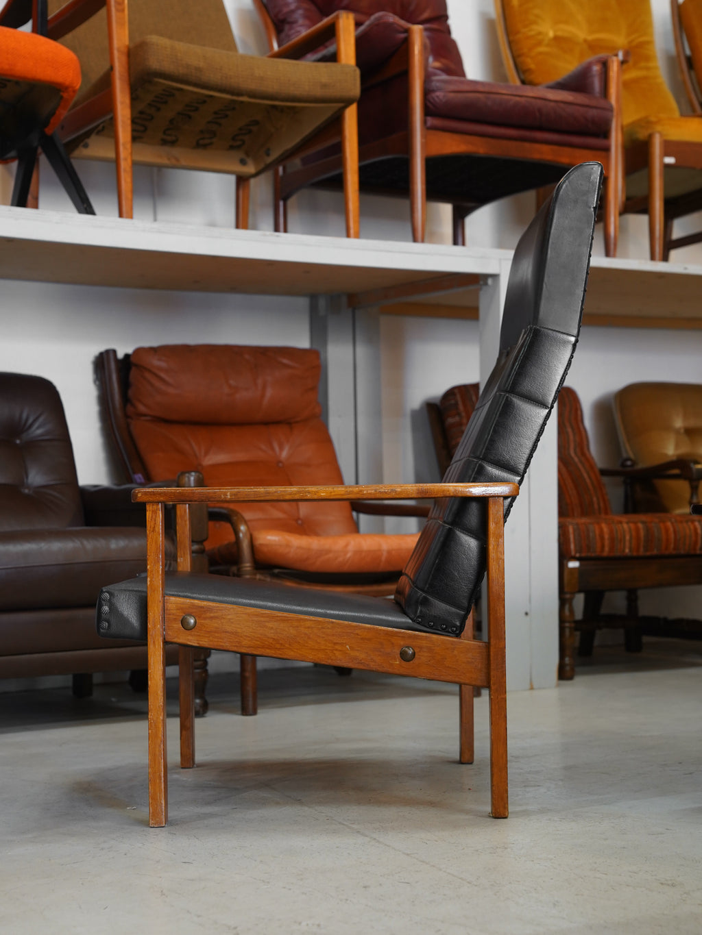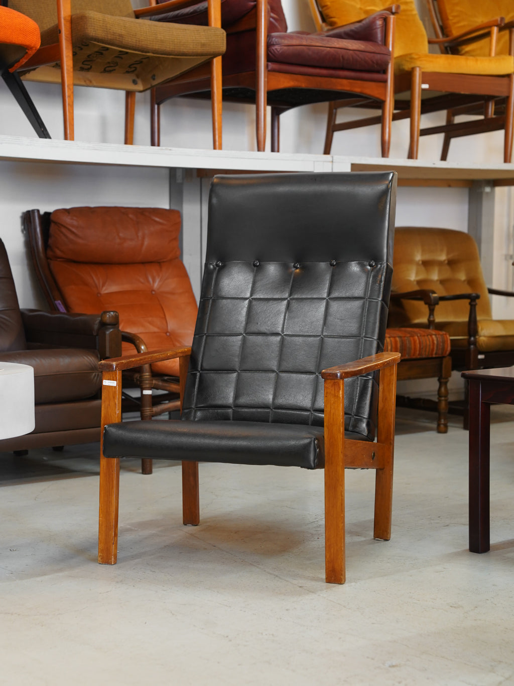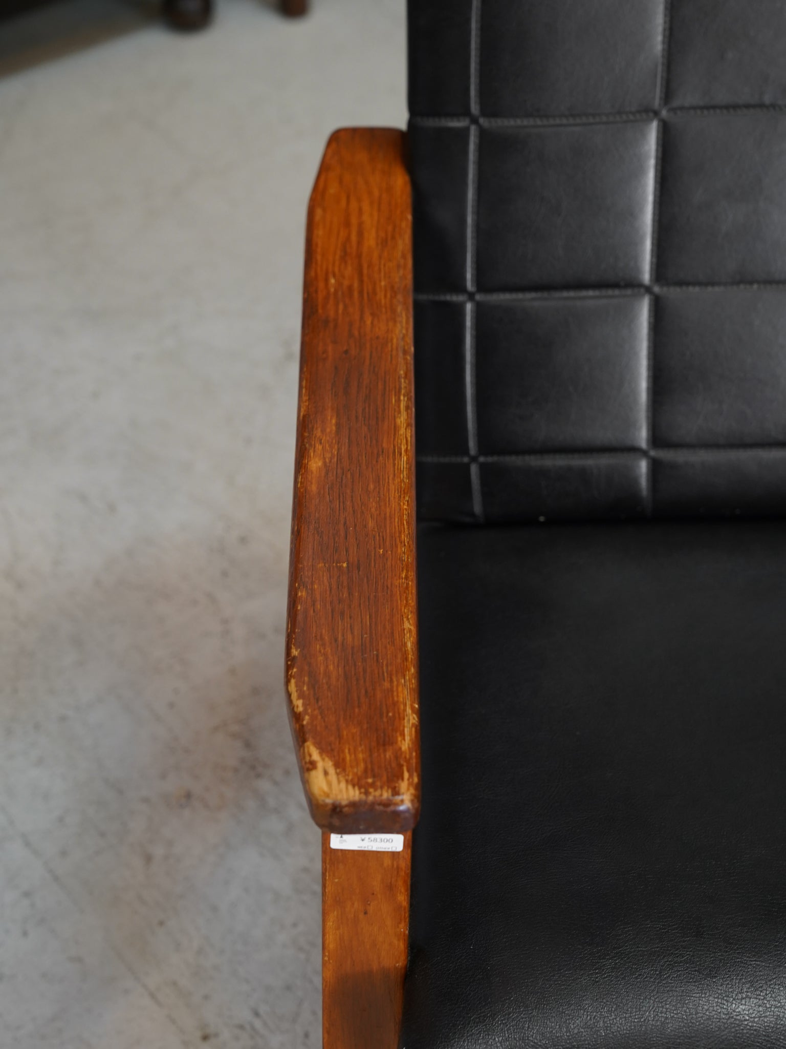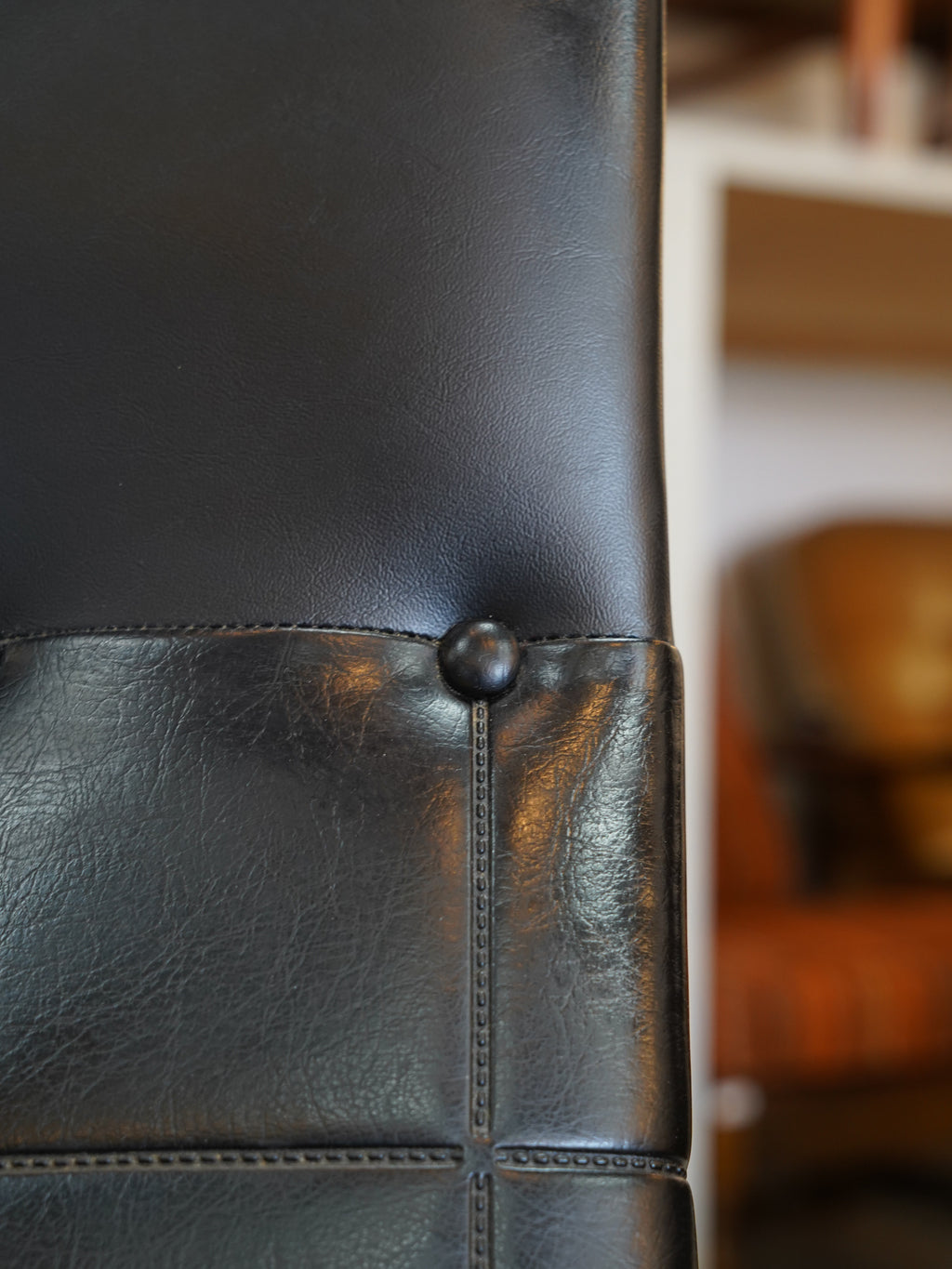 重厚感のあるブラックレザーと、温かみのある木製フレームが絶妙なコントラストを描くハイバック・ラウンジチェアです。