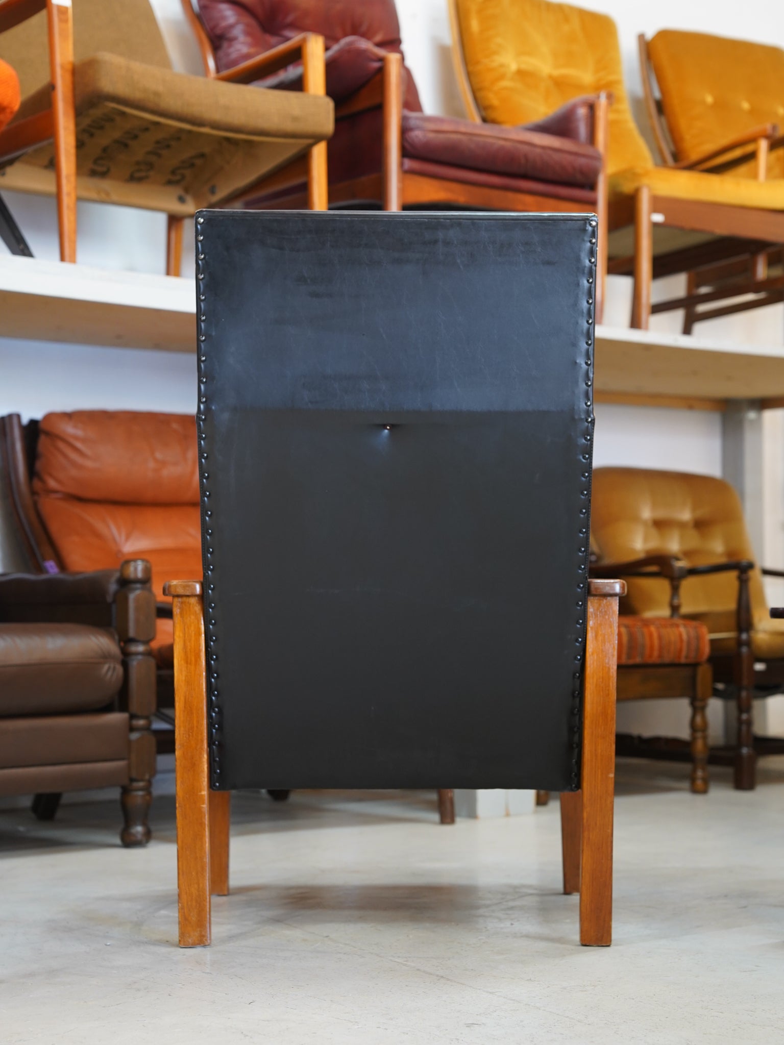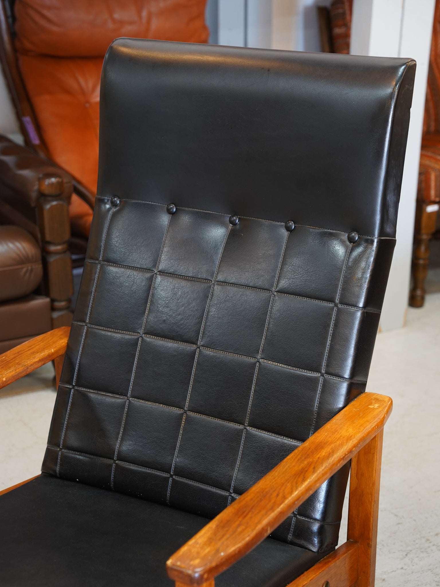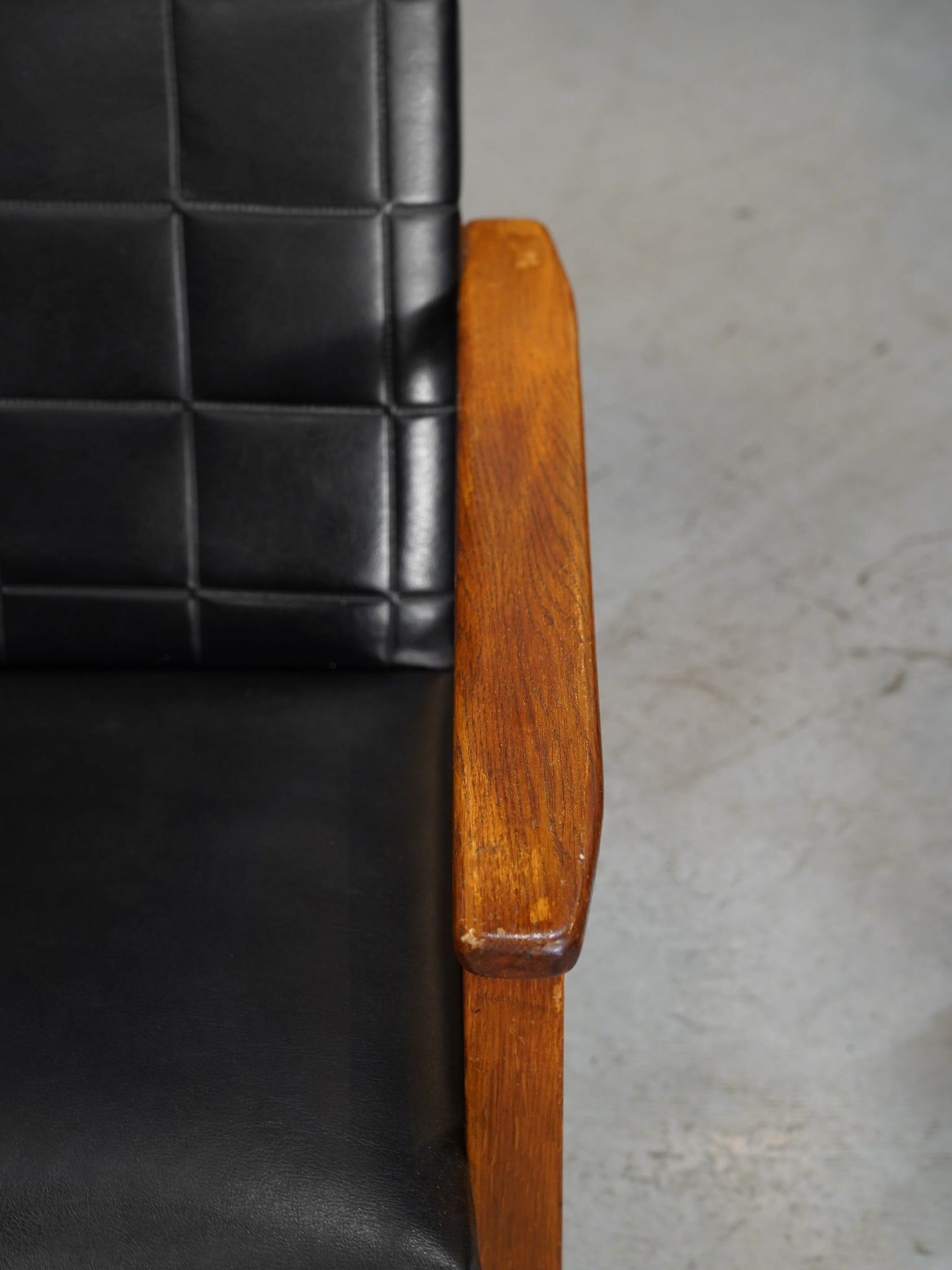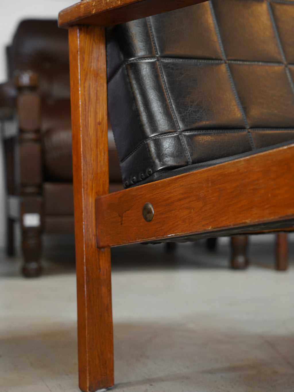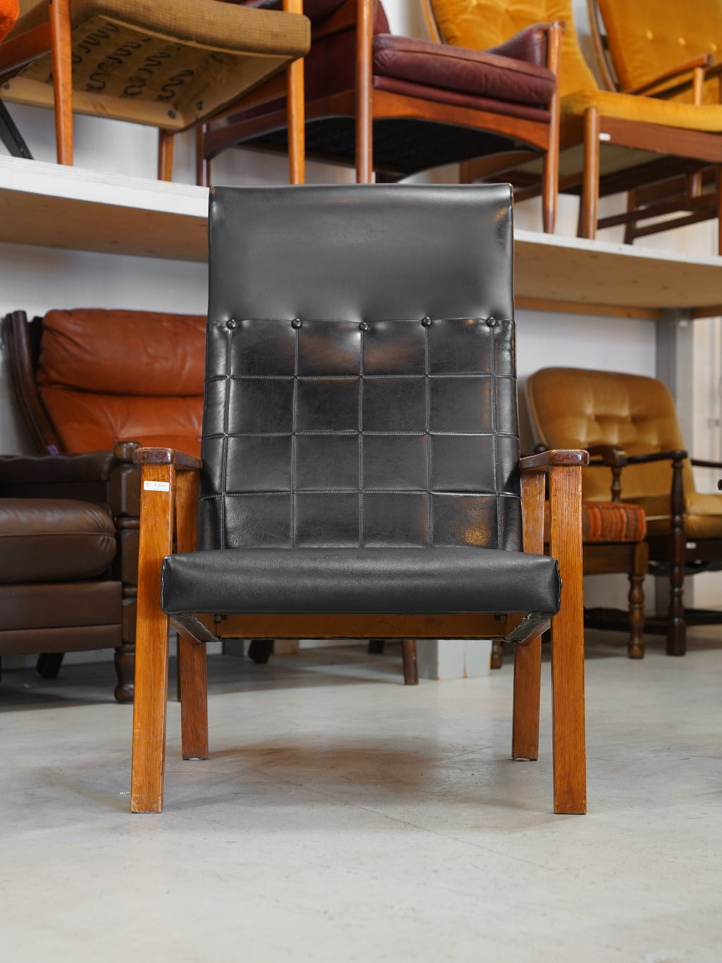 重厚感のあるブラックレザーと、温かみのある木製フレームが絶妙なコントラストを描くハイバック・ラウンジチェアです。