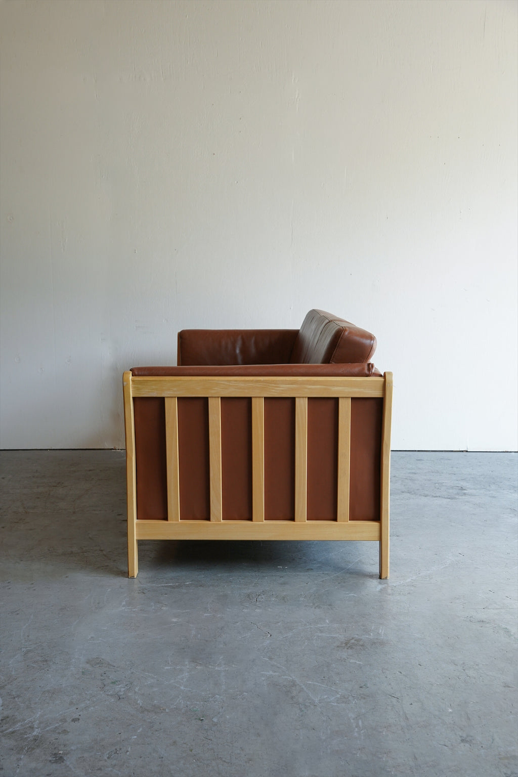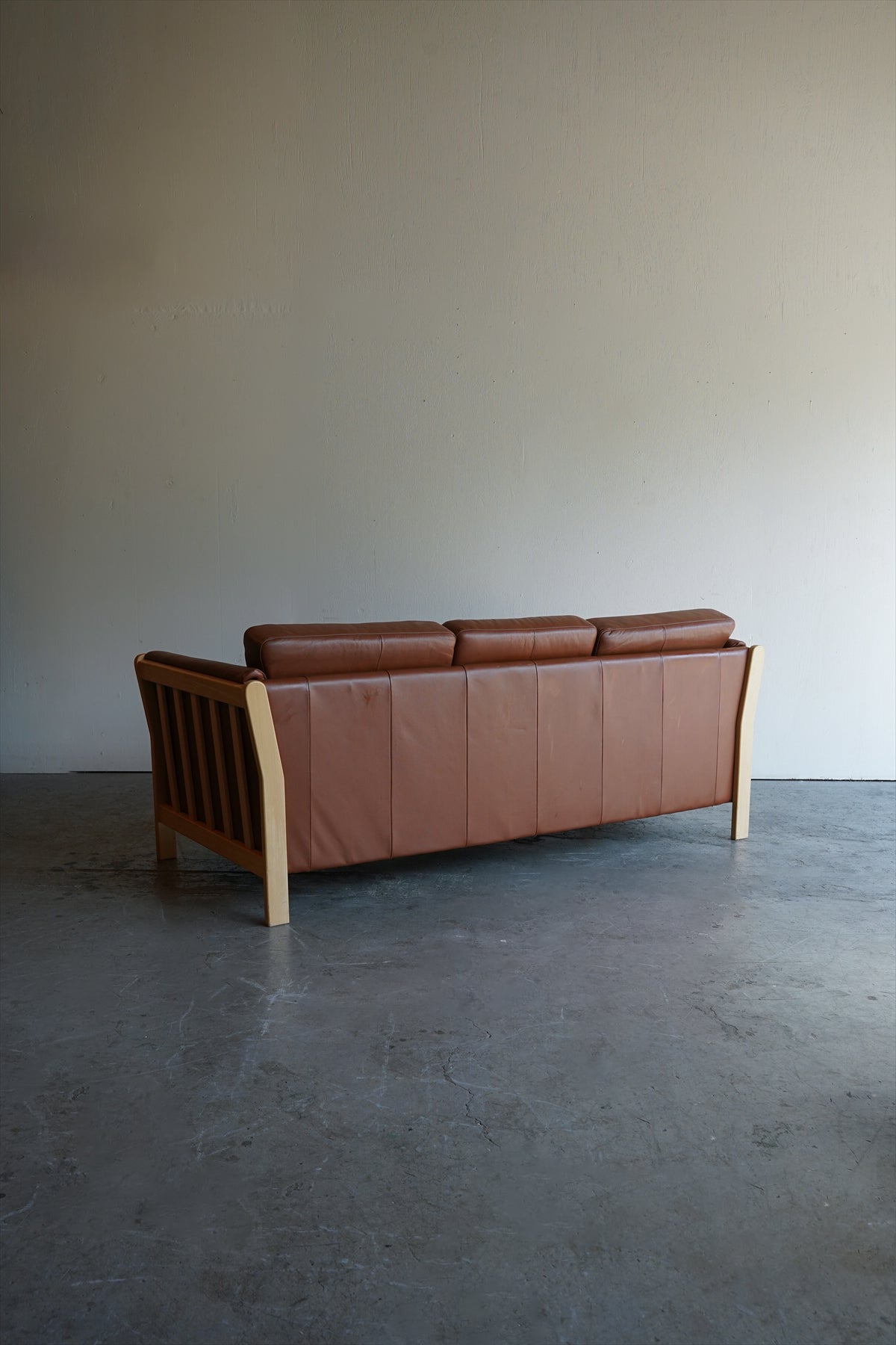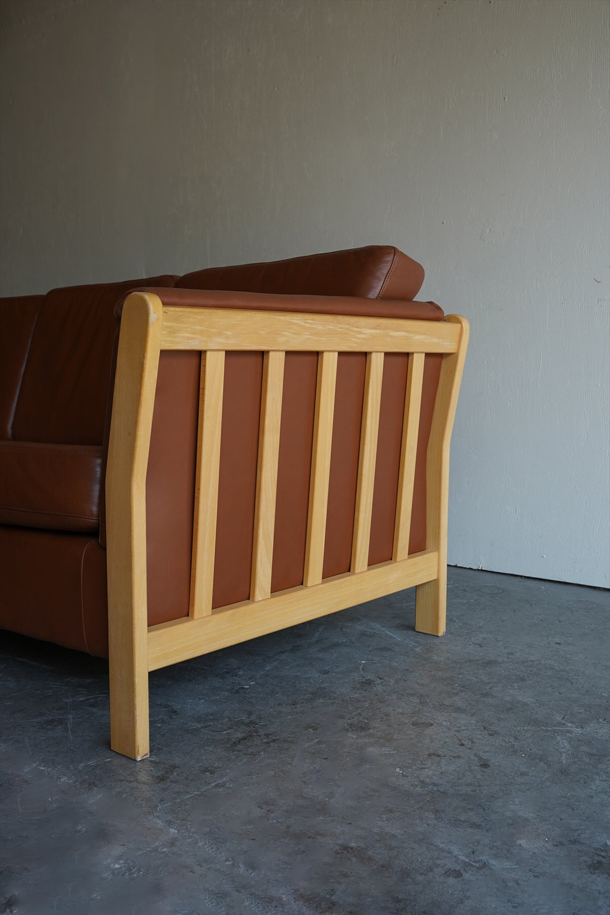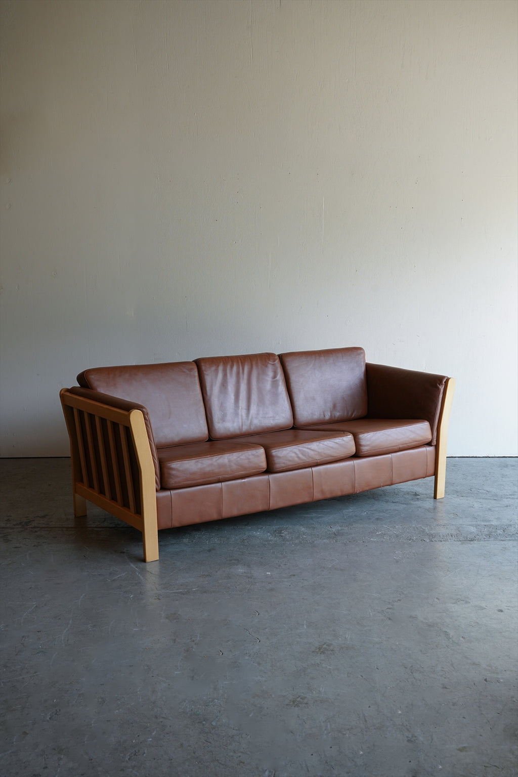 ウッドフレームとレザーの組み合わせが美しい3シーターソファ