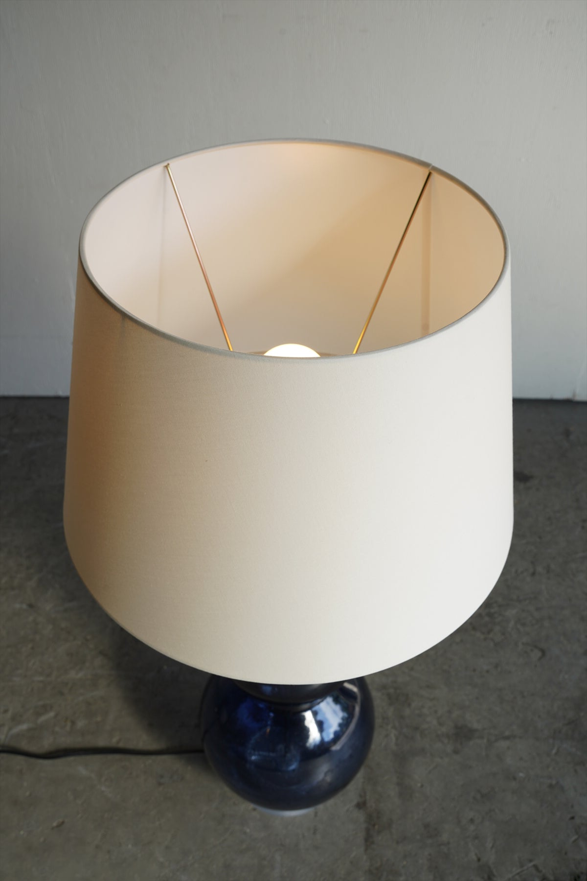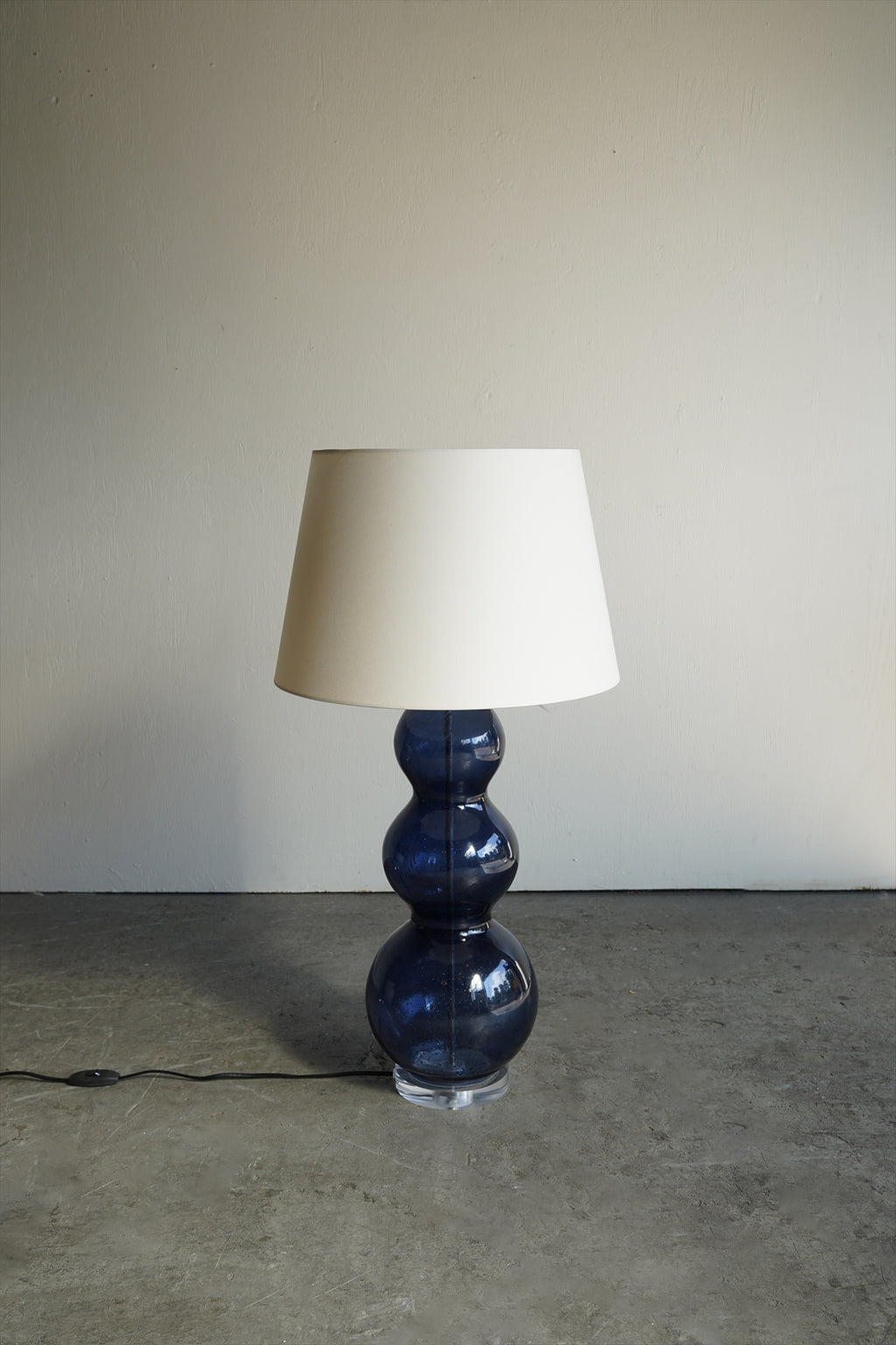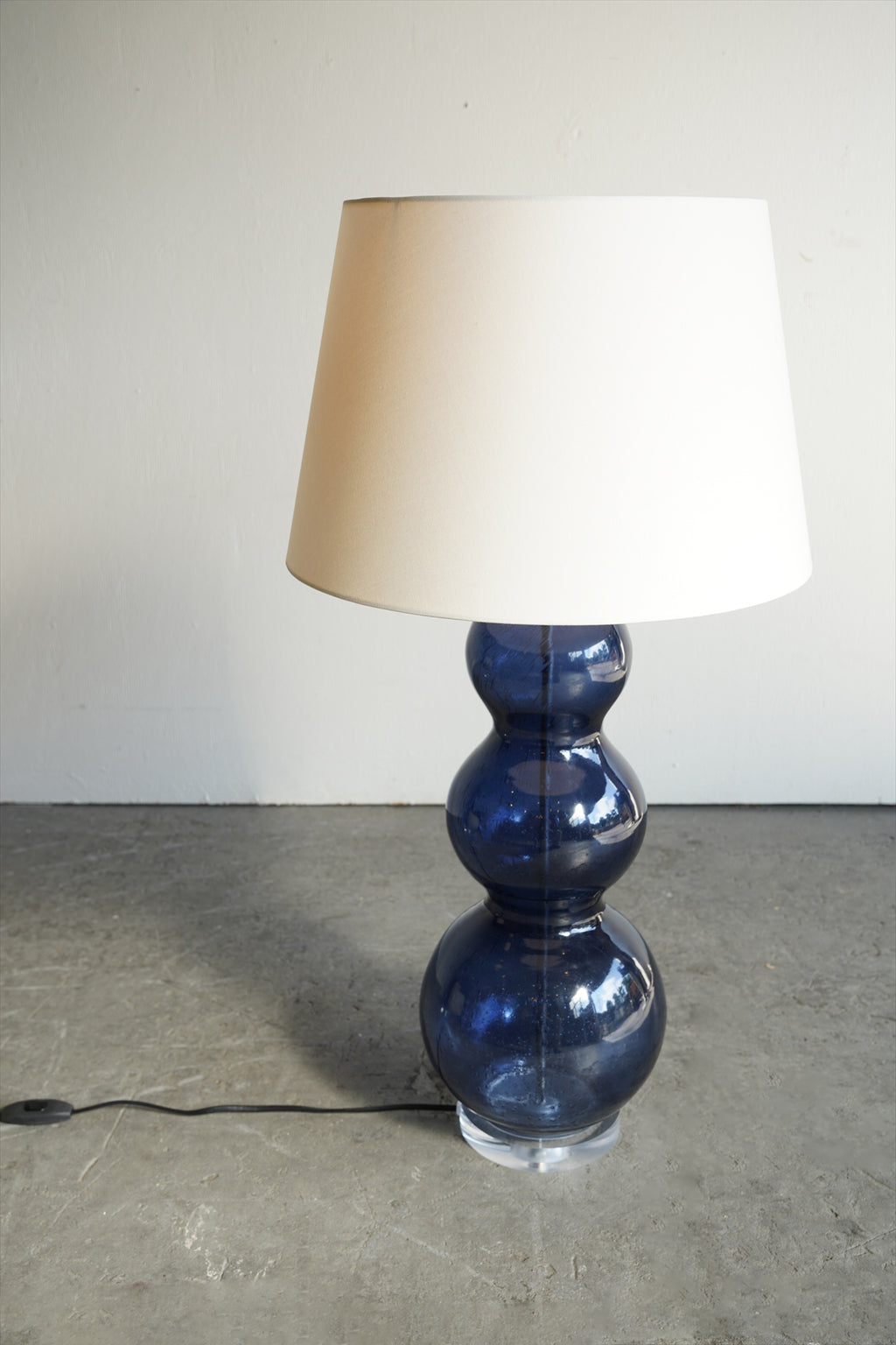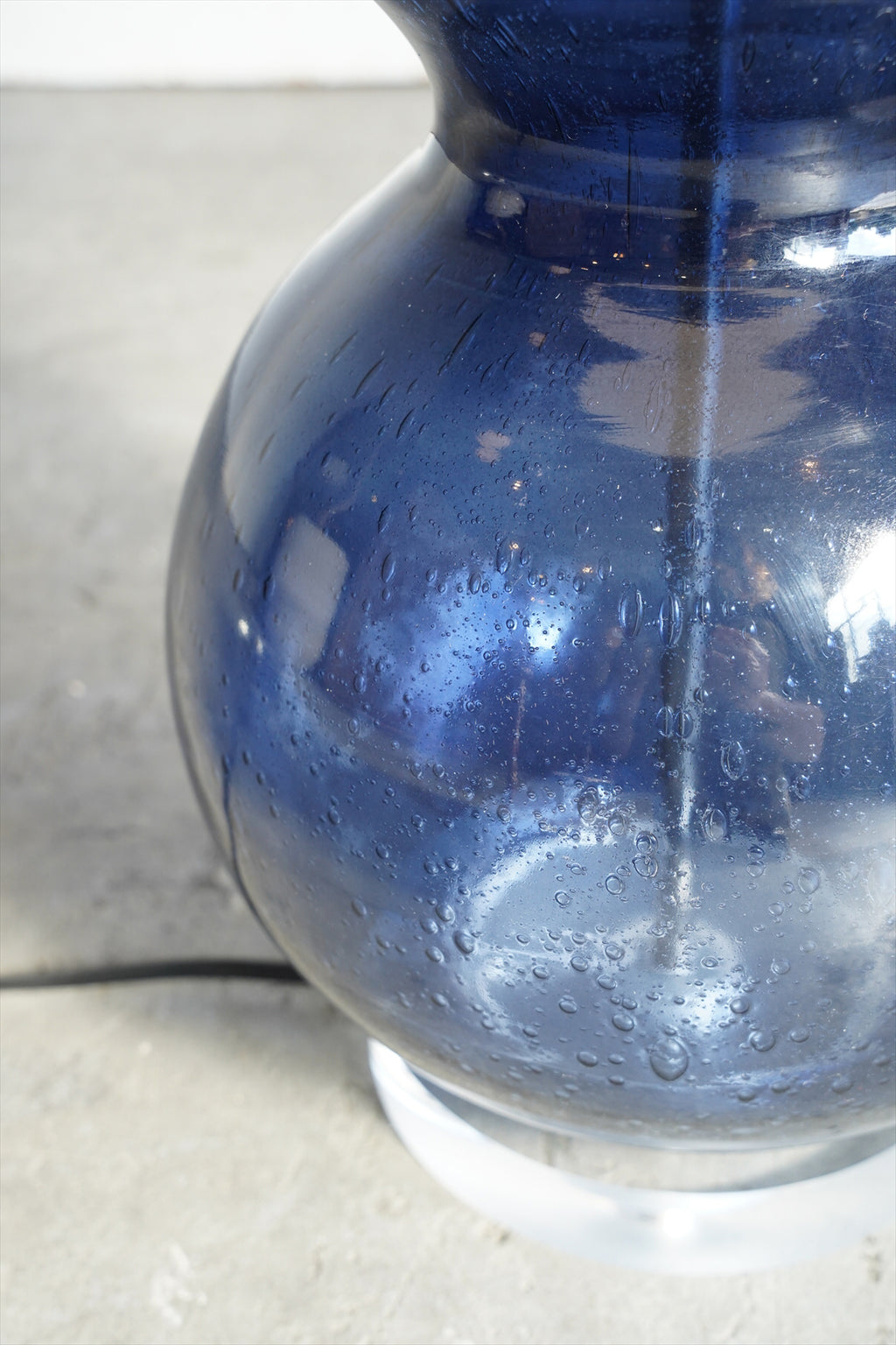 深みのあるブルーのガラスベースが印象的なテーブルランプ