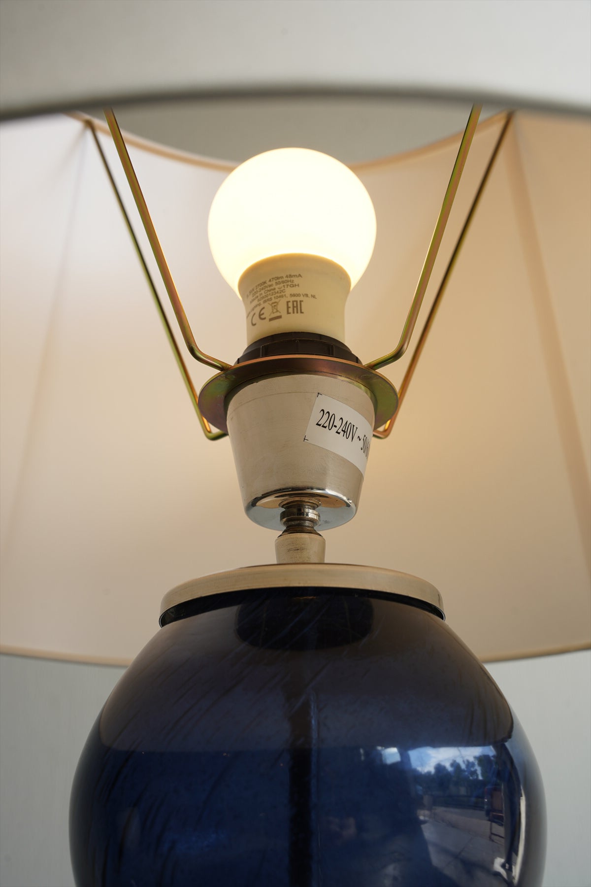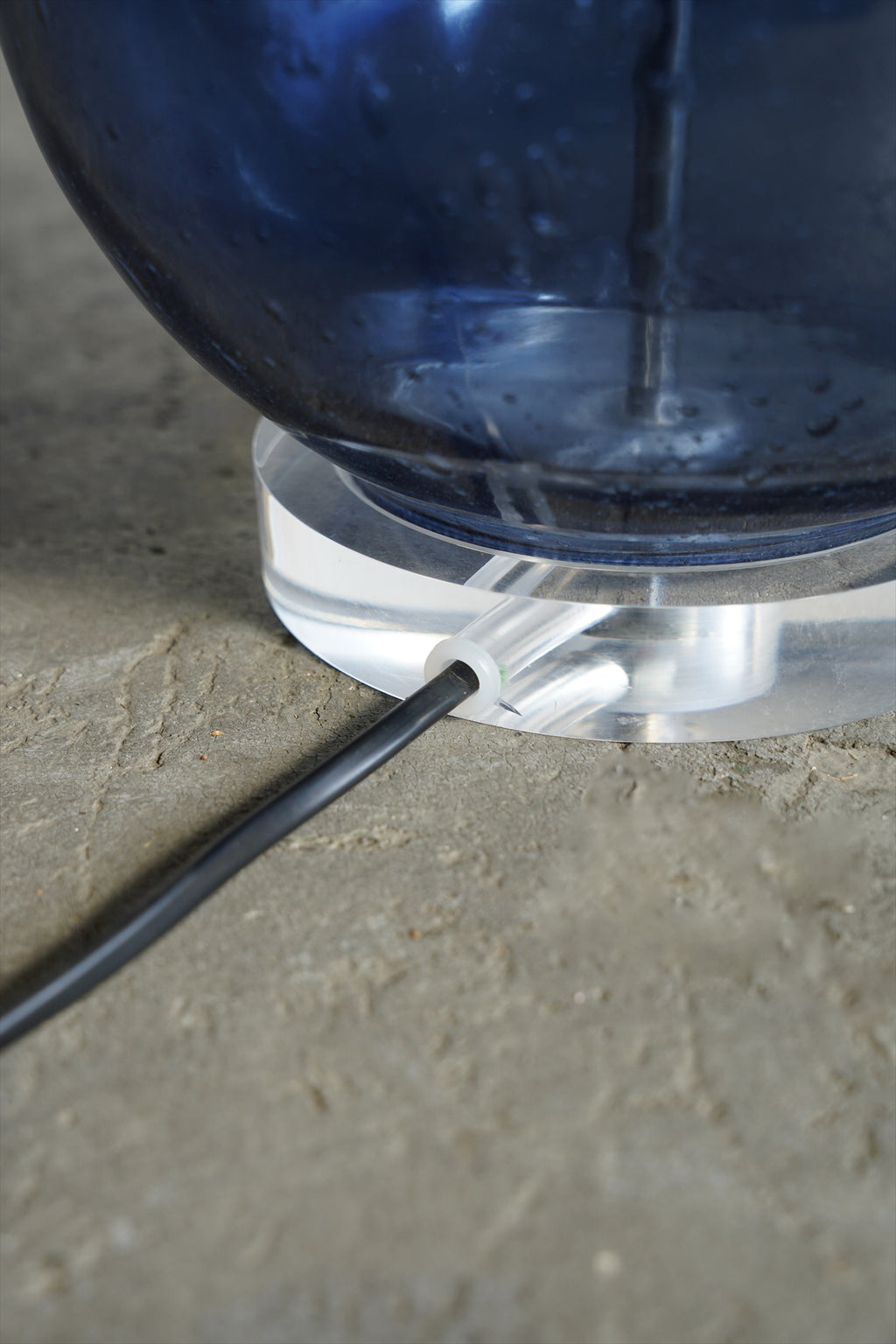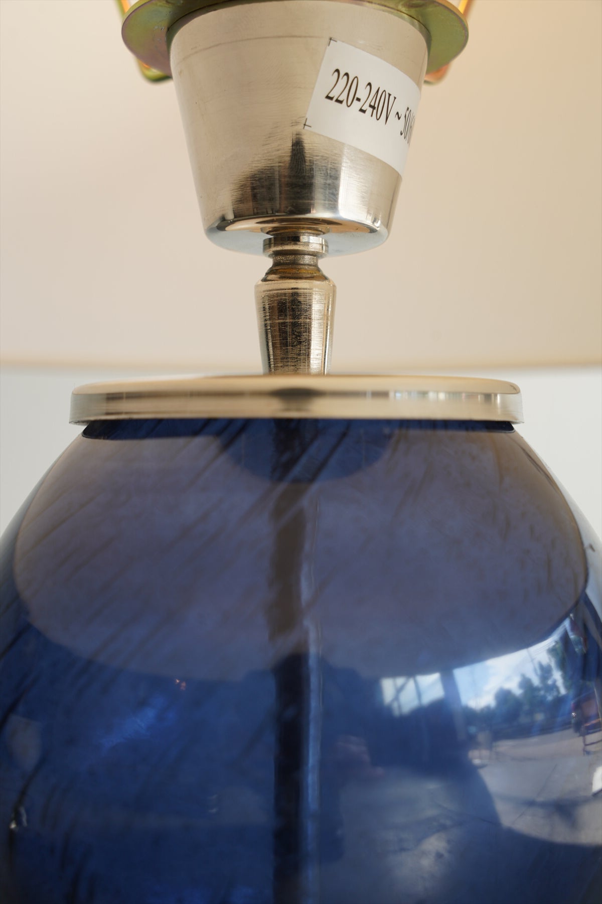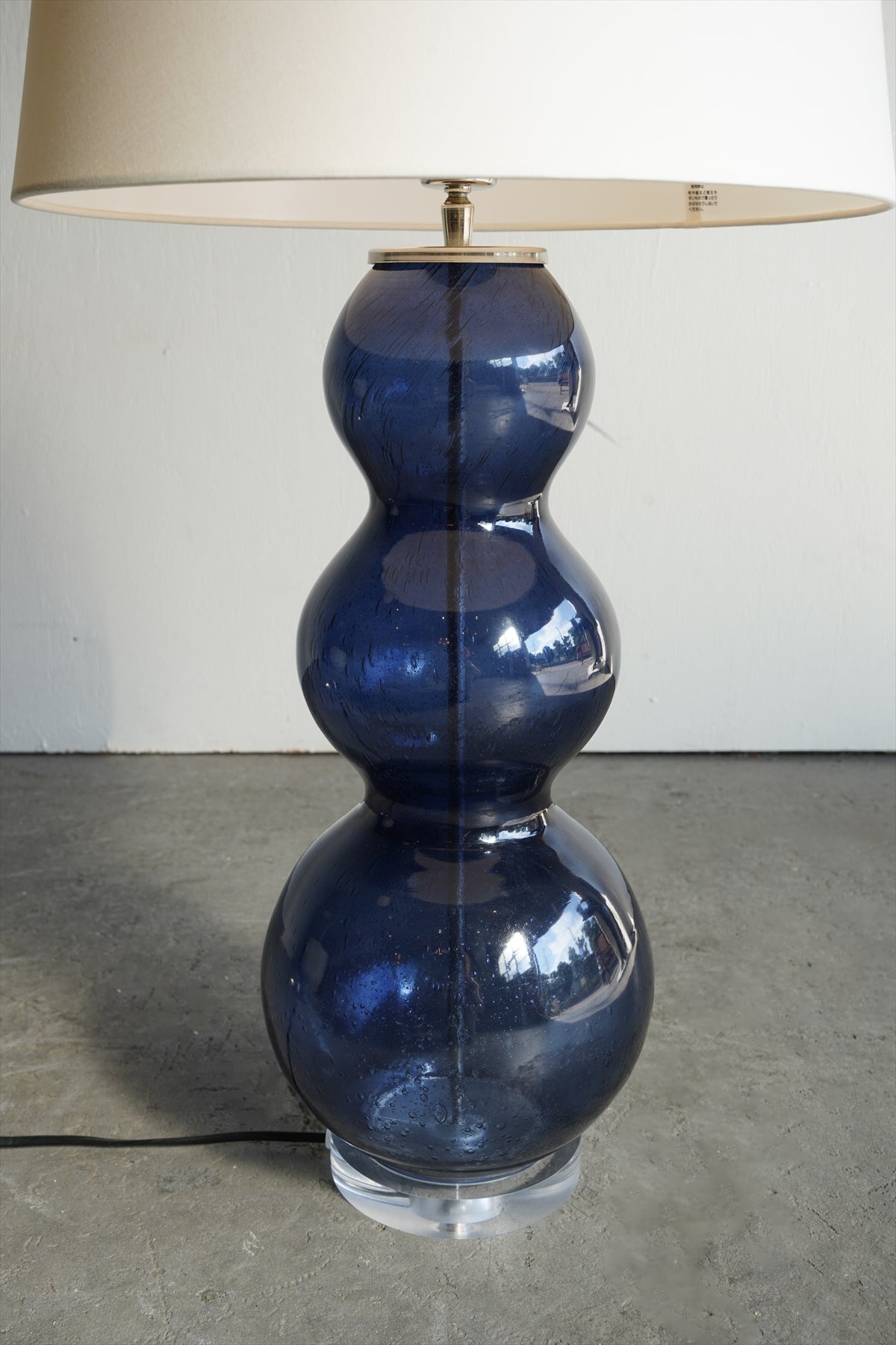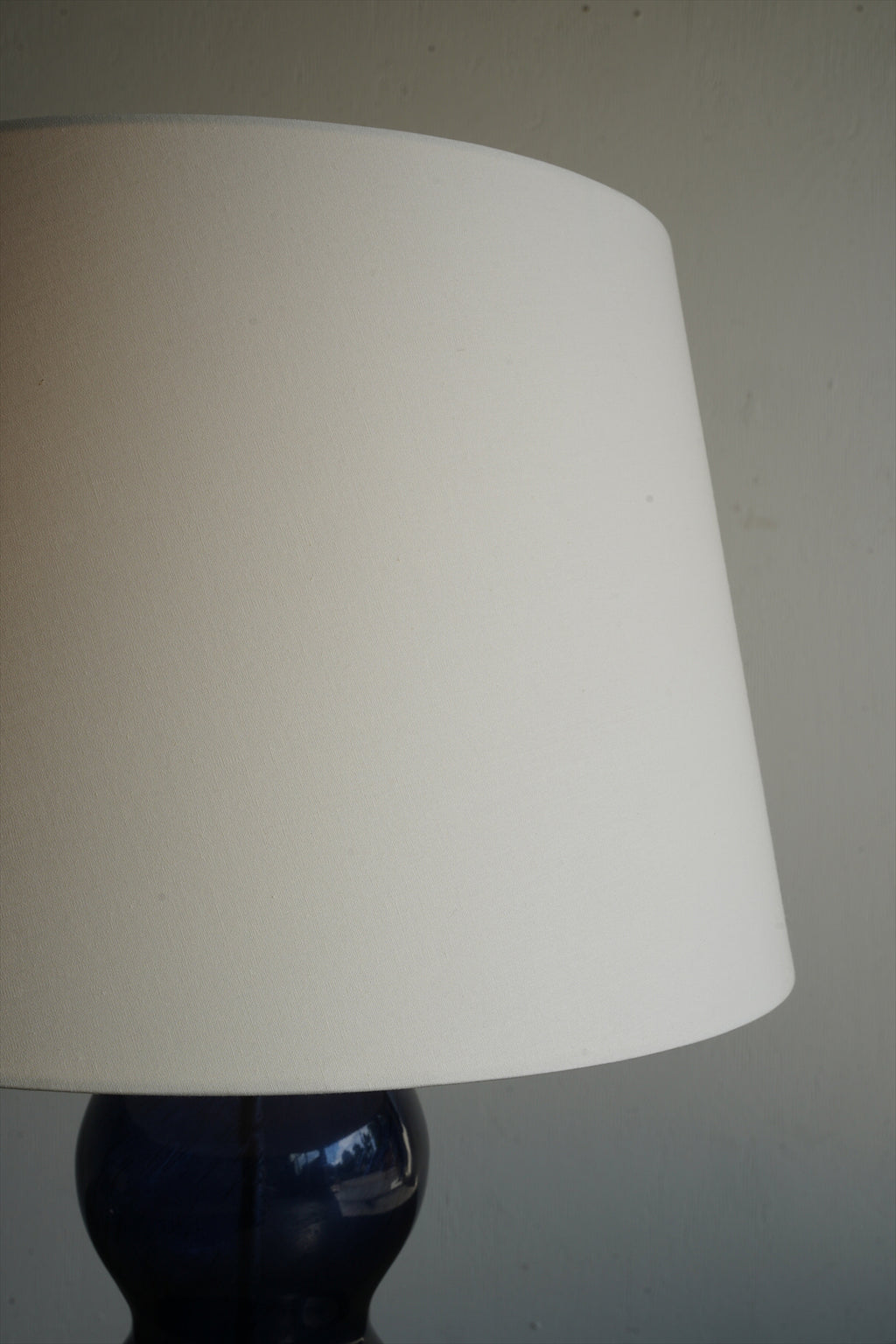 深みのあるブルーのガラスベースが印象的なテーブルランプ