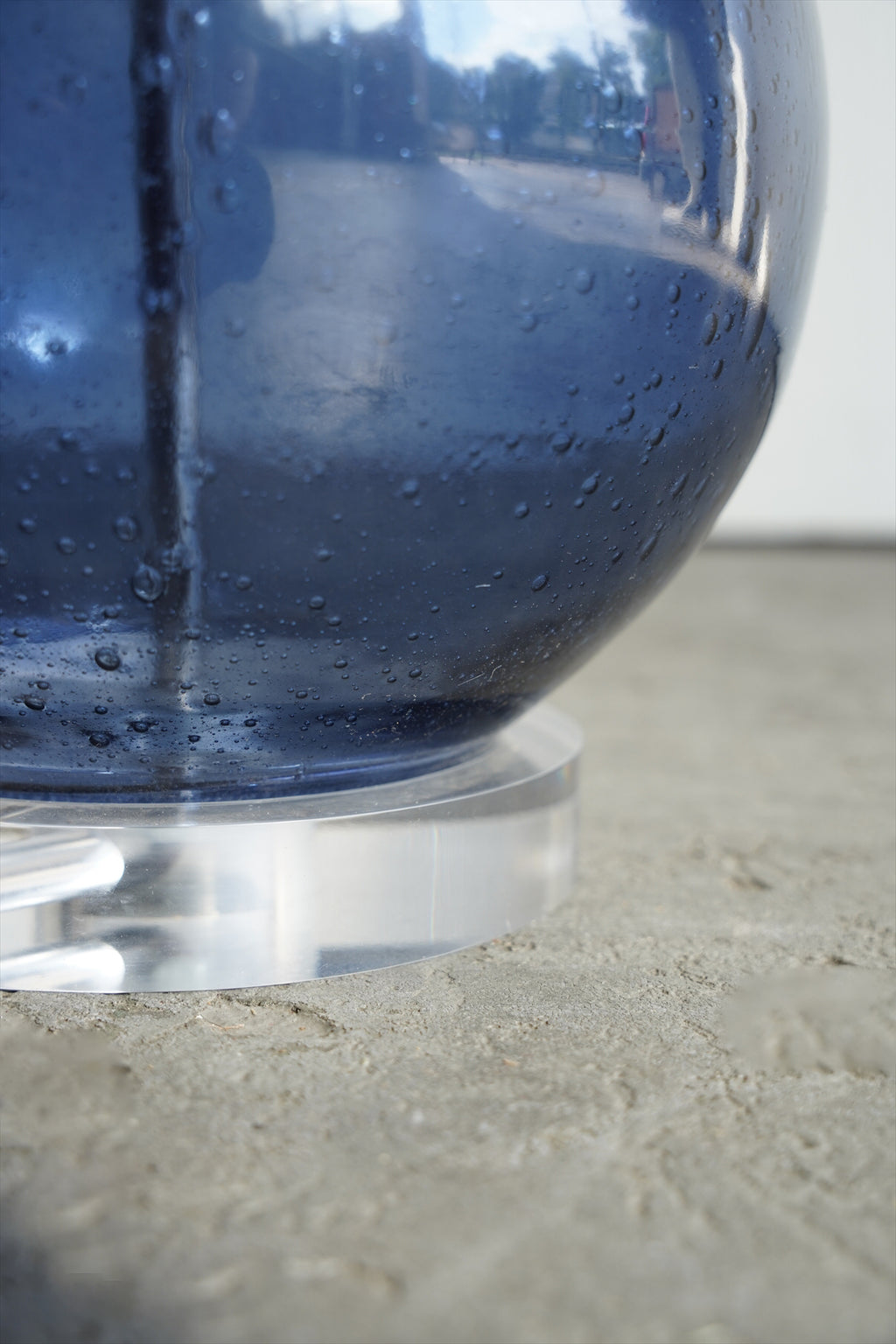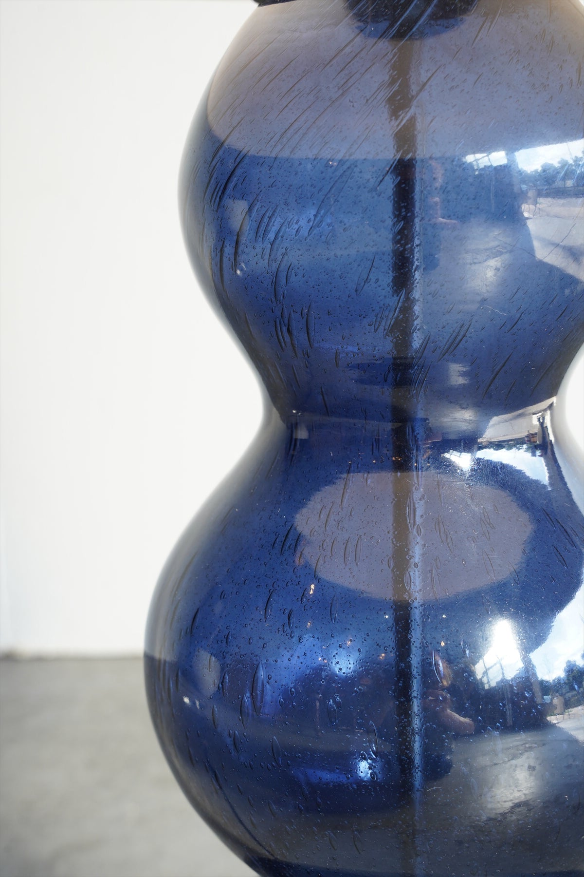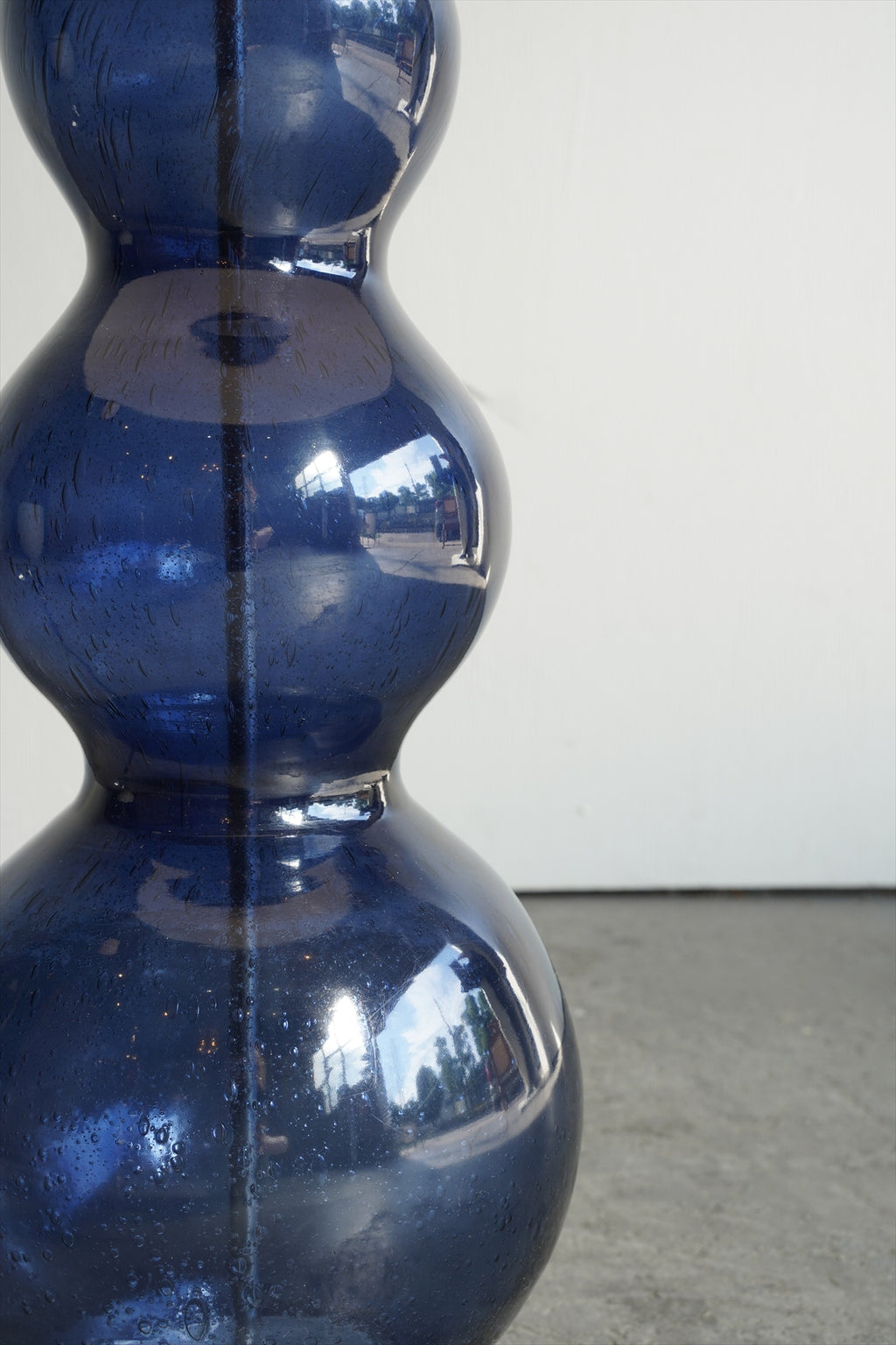 光を透過するたびに表情を変える深いブルーのグラデーションは、まるで深海を覗き込んだような幻想的な美しさで、見る人を惹きつけます。球体を重ねたような、流れるような美しいフォルムは、モダンでありながらも温かみを感じさせ、空間にアートのような存在感をもたらします。