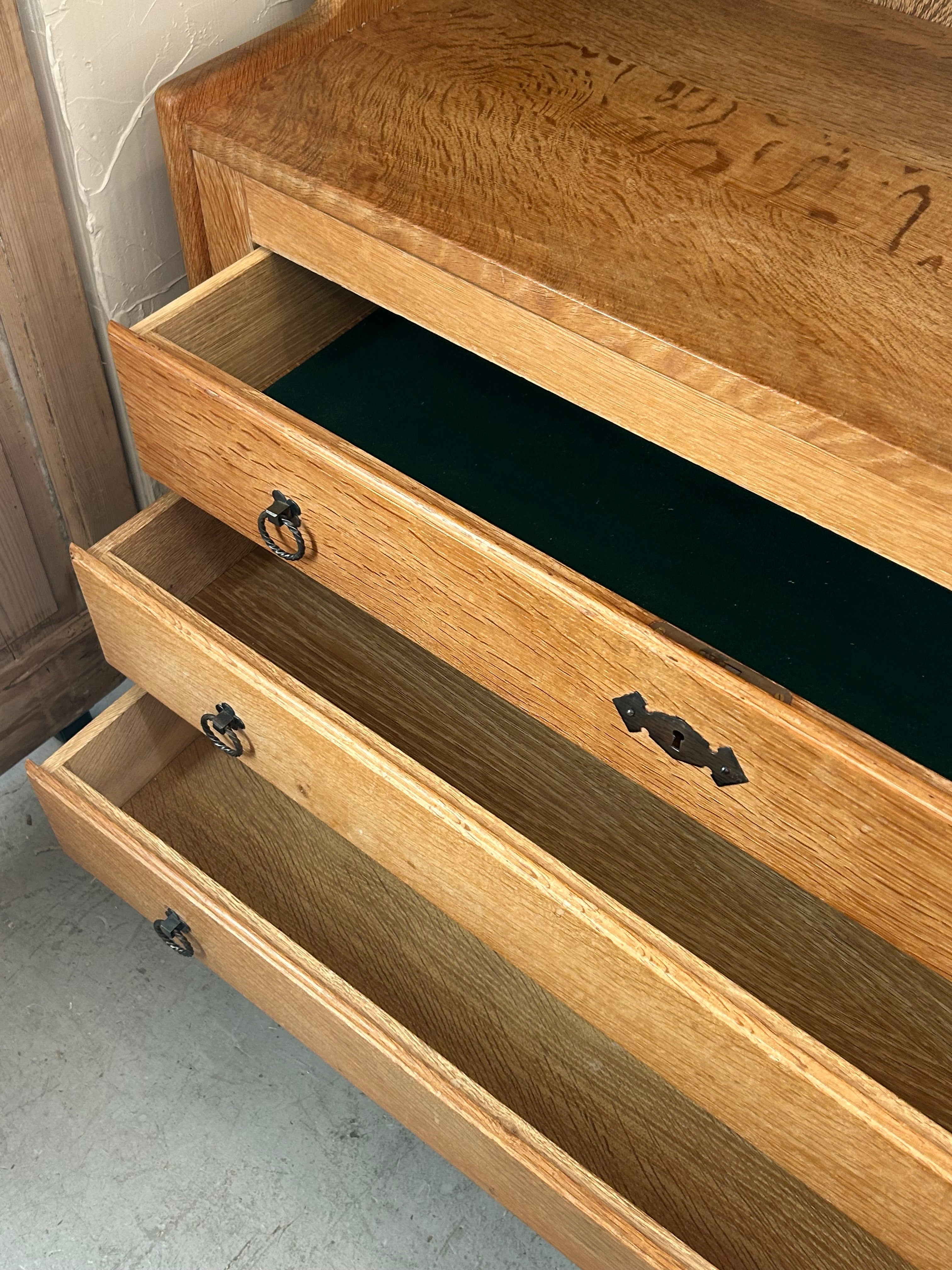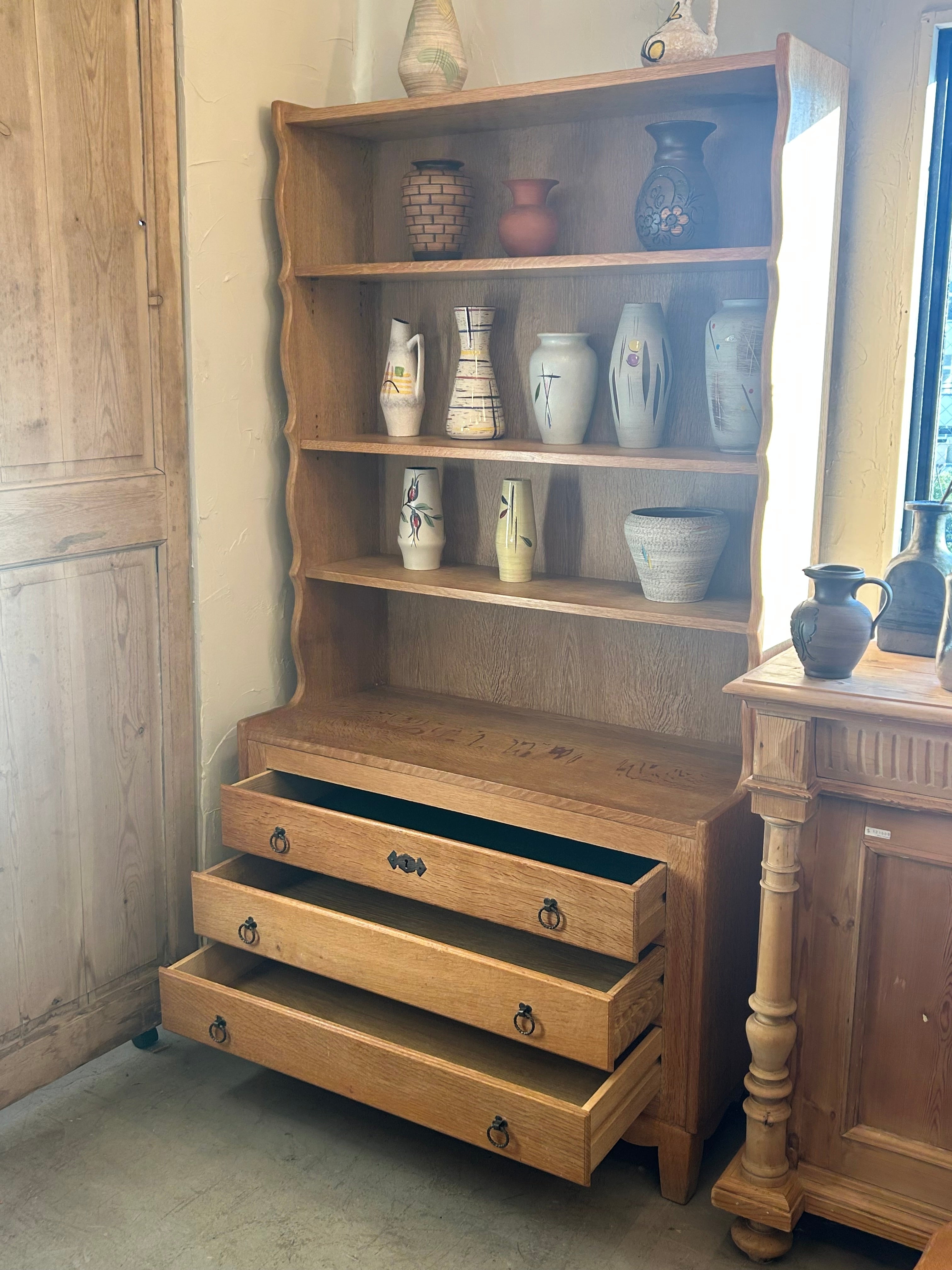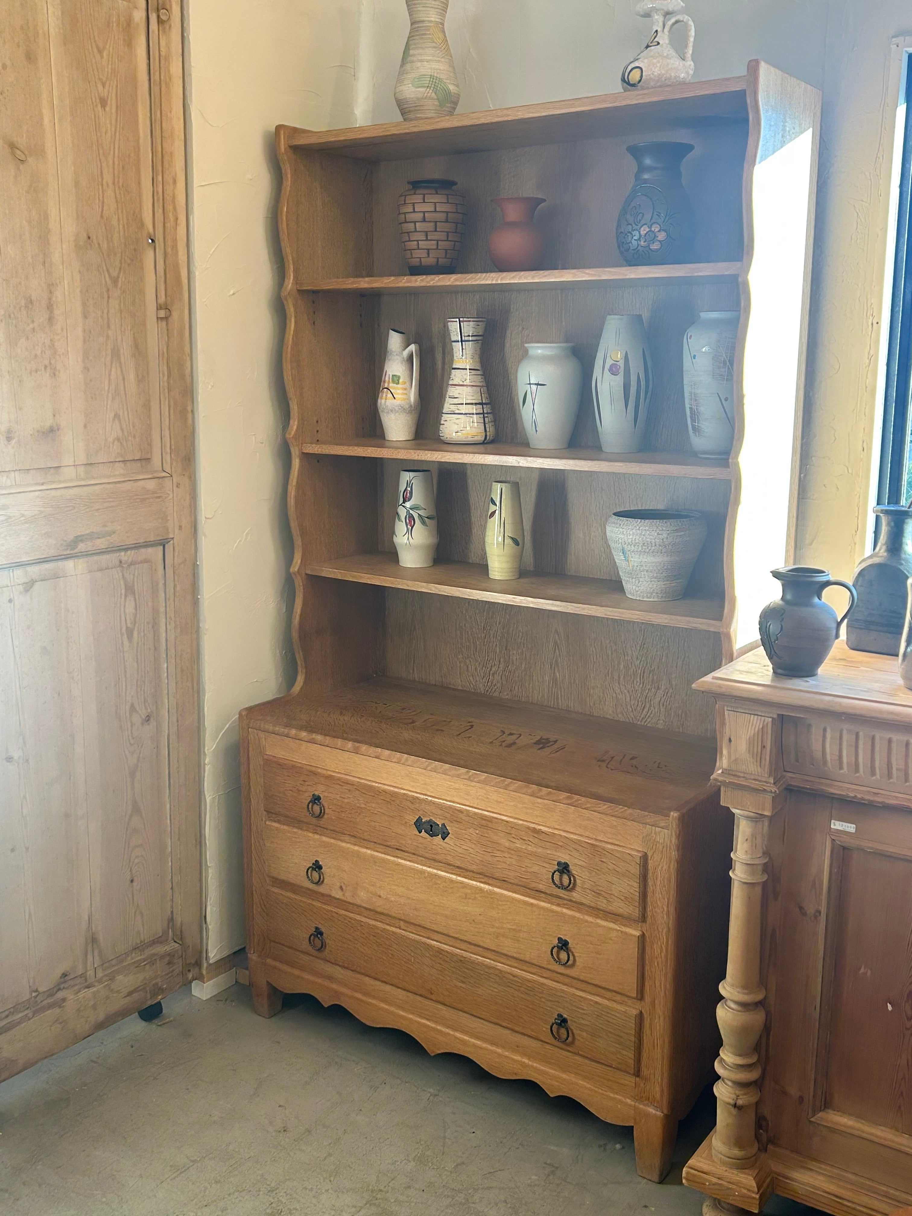 収納は、上段のオープンシェルフと下段の3段チェスト(引き出し収納)の二段構成です。上段はお気に入りの陶器や書籍を飾るディスプレイ棚として、下段は日用品を整頓する実用的な収納として活用できます。下段に配された黒い金属製の取っ手が、シックで味わい深いアクセントになっています。