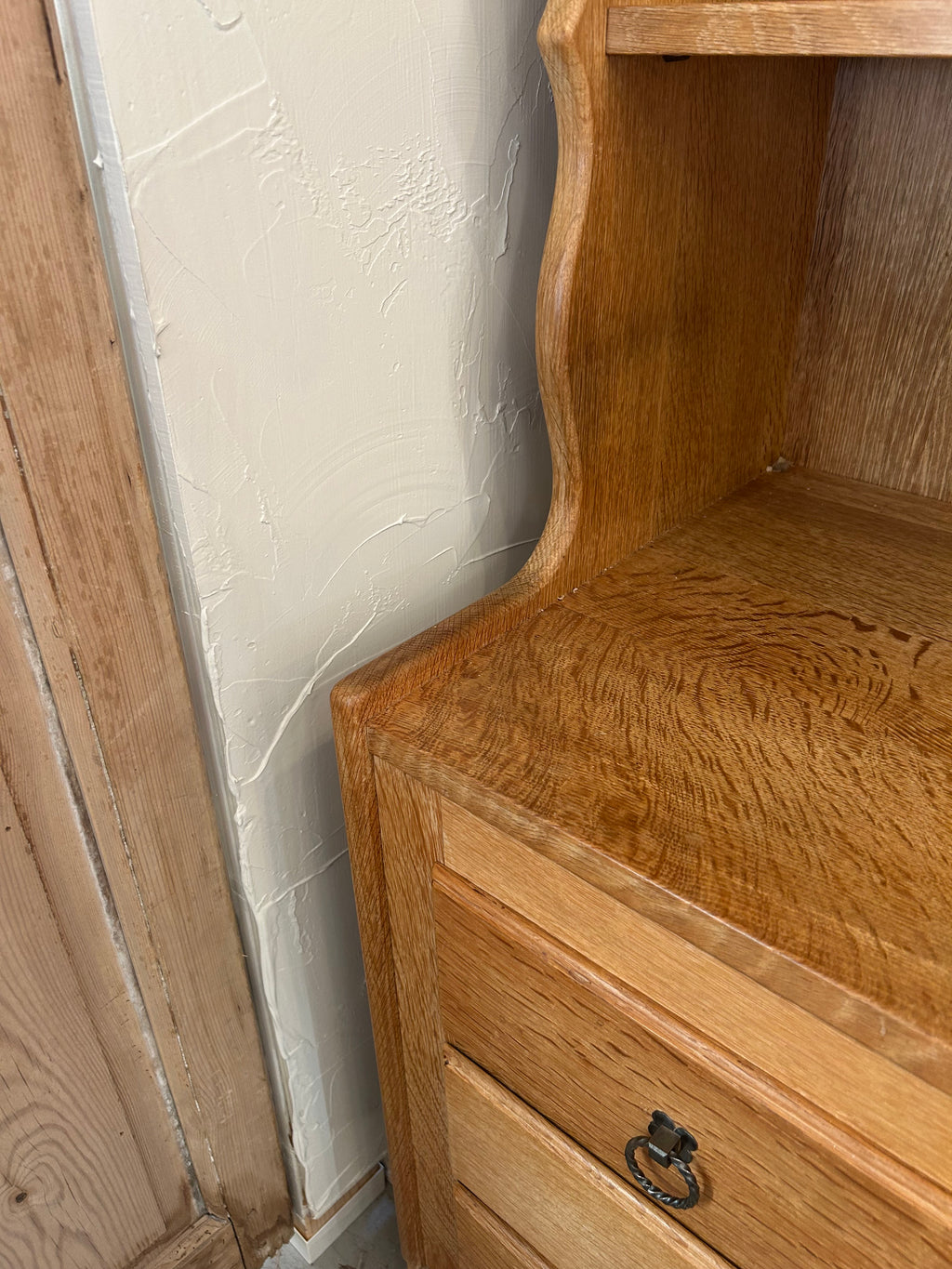 素材には、耐久性と美しい木目を持つオーク材を贅沢に使用。時を経たオーク材の持つ深みと、天板や下部の台輪に施された優雅な曲線的な意匠が、素朴でありながら気品のあるフレンチカントリーの雰囲気を醸し出しています。
