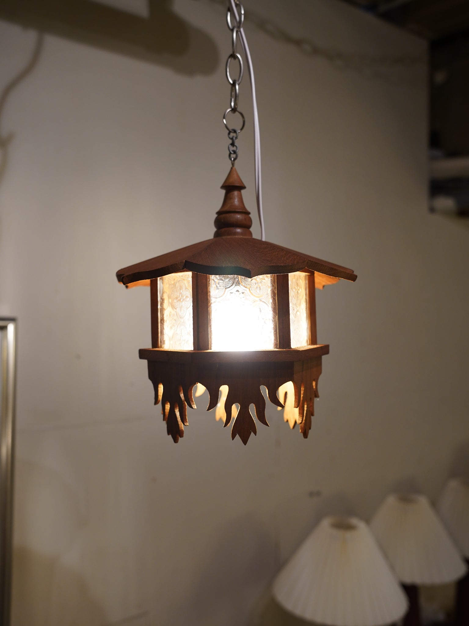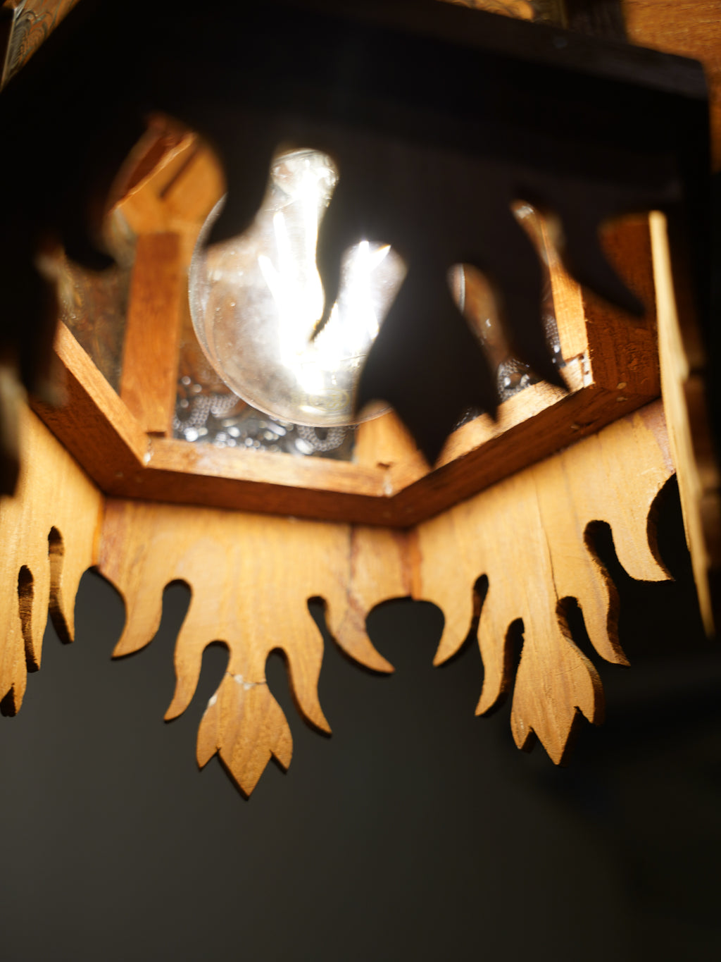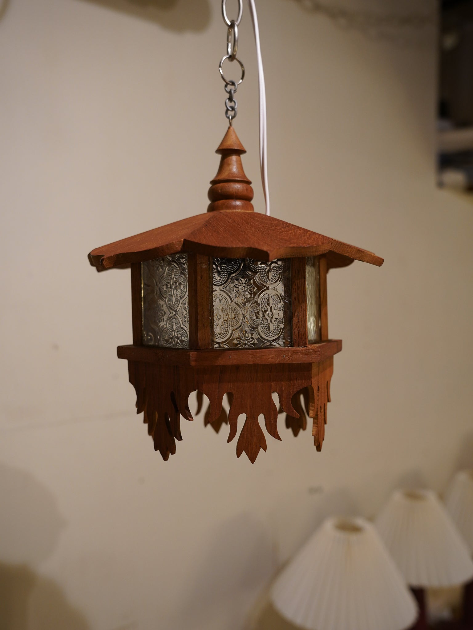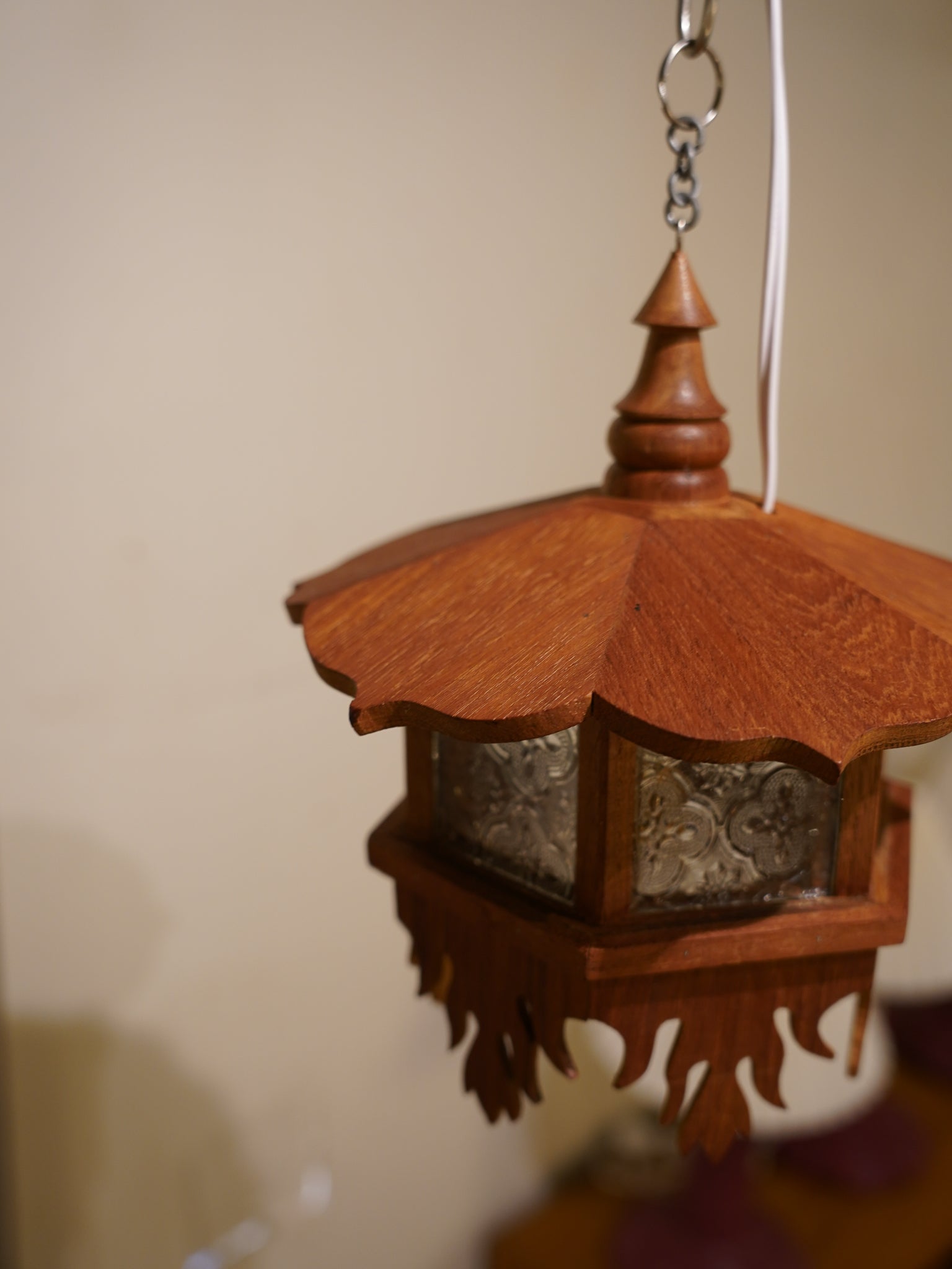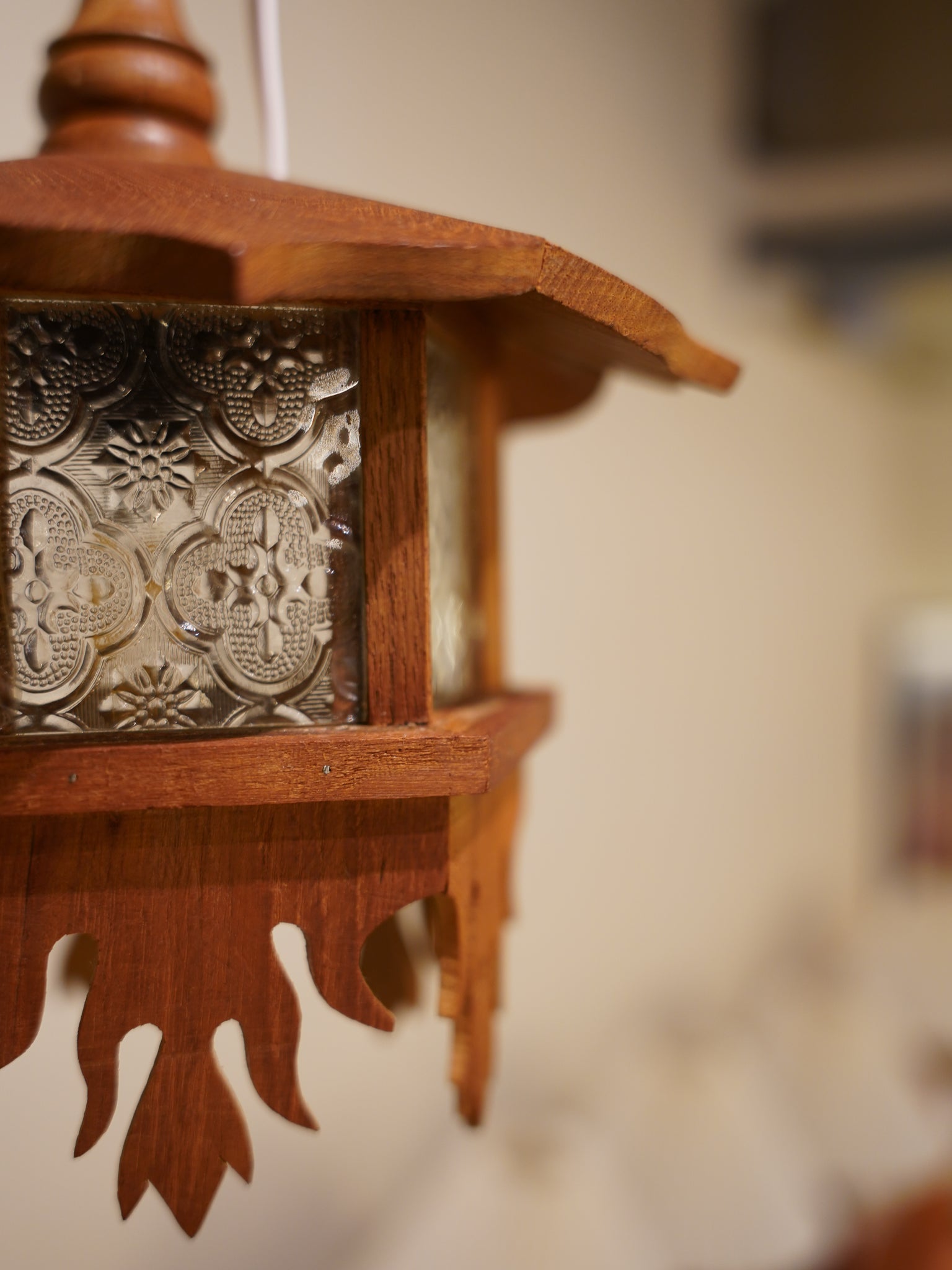 木材は温かみのある赤褐色の仕上げで、繊細な屋根の造形と、風に揺らめく炎を象ったような裾のカットが、ノスタルジックな雰囲気を醸し出しています。