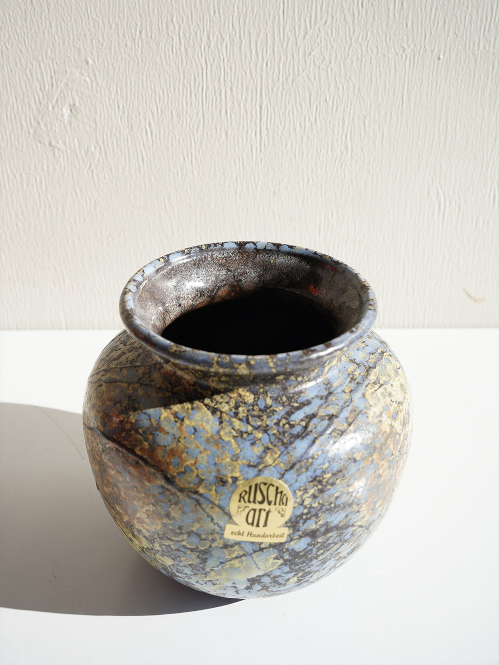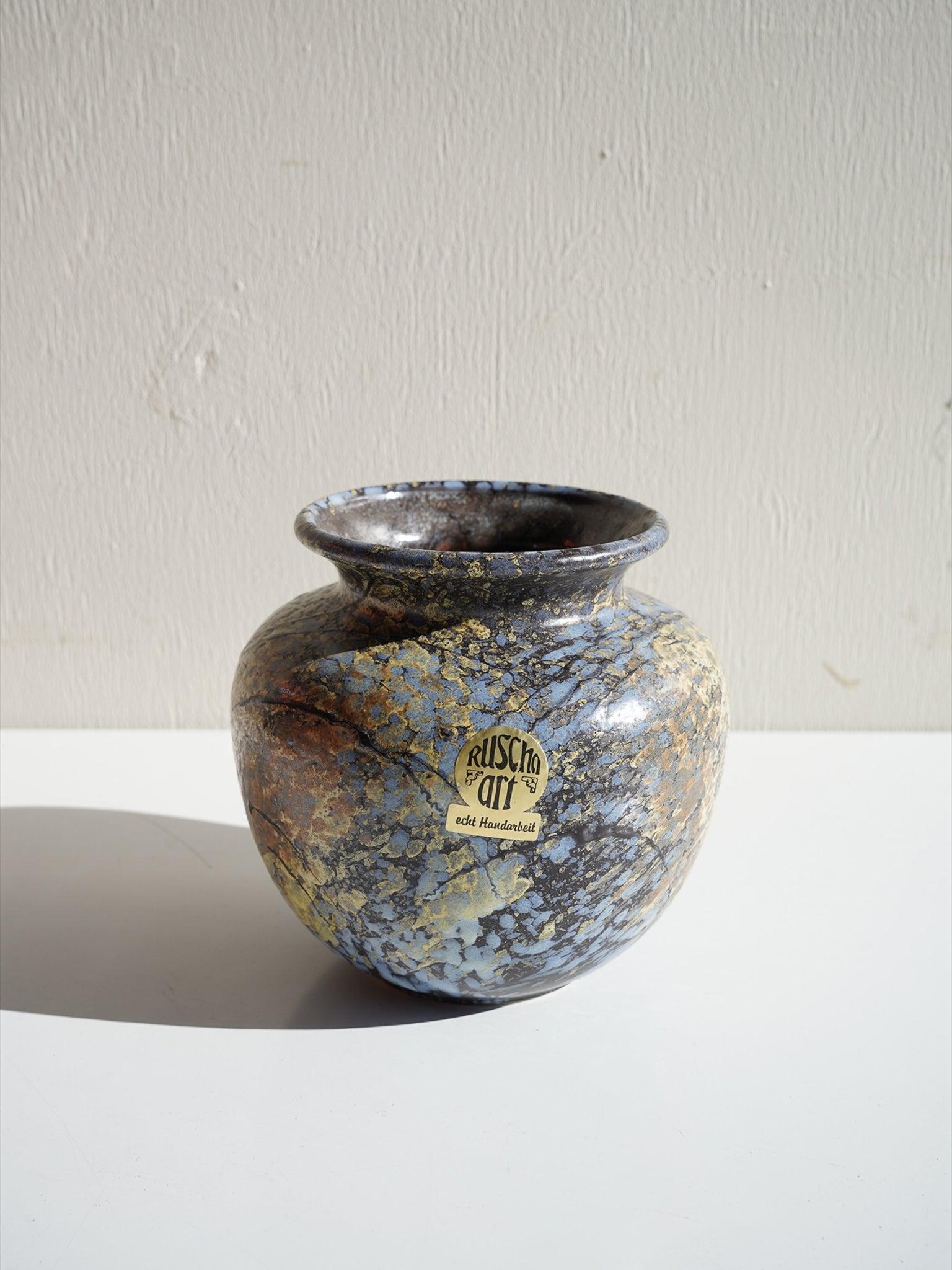 丸く穏やかな壺型のフォルムと、釉薬の荒々しくも美しいテクスチャの対比が、作品に彫刻的な深みを与えています。このベースは、単なる花瓶ではなく、Ruschaの芸術性と高い技術力が凝縮された、ミッドセンチュリーモダンのインテリアに深遠な色彩と知的なアクセントを加える、コレクターに人気の高い逸品です。