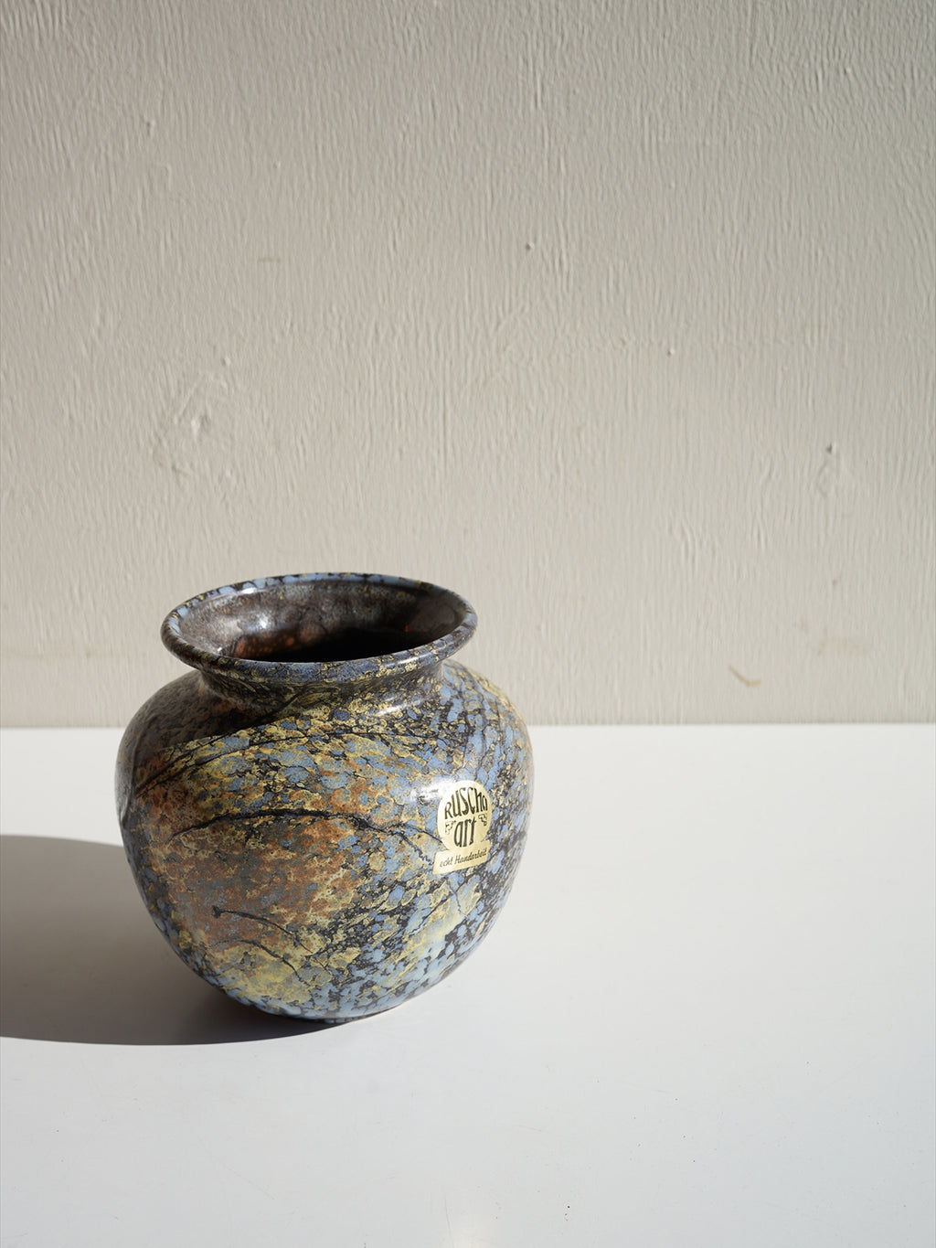 この作品の最大の魅力は、その複雑で神秘的な釉薬表現にあります。ダークブラウンの地釉の上に、ブルー、イエロー、オレンジといった複数の釉薬が重ねられ、まるで大理石や宇宙の星雲のような、複雑な亀裂状の模様を生み出しています。Ruschaが得意としたこの技法は、色の深みと流動感が際立ち、見る角度によって表情を劇的に変化させます。